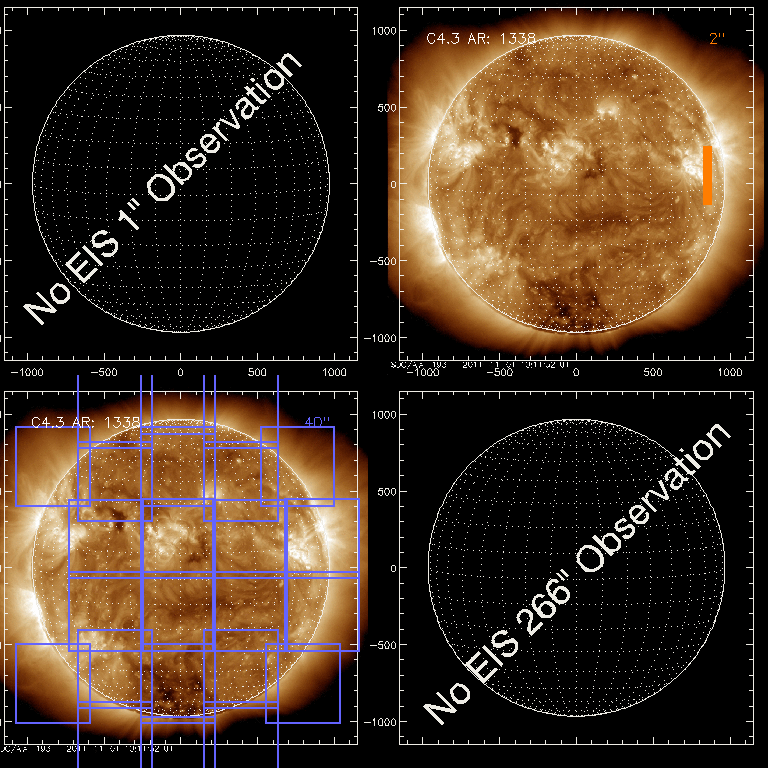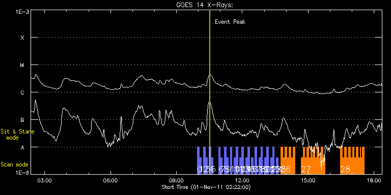 EIS Observation timeline overlay to GOES-Xray curve Code 1" 2" 40" 266" EIS Observations list for this event: STUDY ACRONYM ID DATE OBSERVED DESCRIPTION NOAA# TARGET 0 full_sun_slot_scan_1 | 24828 | 2011/11/01 09:57:20 | Multi-Temperature Full Disc Slot Scans | 1330 | Quiet Sun TIMELINE ID DATE OBSERVED FITS FILE XCEN (+W/-E) YCEN (+N/-S) DUR ----------------------------------------------------------------------------------------------------------------- 24828 | 2011/11/01 09:57:20.000 | eis_l0_20111101_095720.fits.gz | 920.72 | 185.58 | 5m28s 1 full_sun_slot_scan_1 | 24829 | 2011/11/01 10:02:53 | Multi-Temperature Full Disc Slot Scans | | Quiet Sun TIMELINE ID DATE OBSERVED FITS FILE XCEN (+W/-E) YCEN (+N/-S) DUR ----------------------------------------------------------------------------------------------------------------- 24829 | 2011/11/01 10:02:53.000 | eis_l0_20111101_100253.fits.gz | 920.72 | -286.50 | 5m26s 2 full_sun_slot_scan_1 | 24830 | 2011/11/01 10:13:13 | Multi-Temperature Full Disc Slot Scans | 1333 | Quiet Sun TIMELINE ID DATE OBSERVED FITS FILE XCEN (+W/-E) YCEN (+N/-S) DUR ----------------------------------------------------------------------------------------------------------------- 24830 | 2011/11/01 10:13:13.000 | eis_l0_20111101_101313.fits.gz | 452.75 | 185.42 | 5m27s 3 full_sun_slot_scan_1 | 24831 | 2011/11/01 10:18:45 | Multi-Temperature Full Disc Slot Scans | | Quiet Sun TIMELINE ID DATE OBSERVED FITS FILE XCEN (+W/-E) YCEN (+N/-S) DUR ----------------------------------------------------------------------------------------------------------------- 24831 | 2011/11/01 10:18:45.000 | eis_l0_20111101_101845.fits.gz | 452.68 | -286.42 | 5m27s 4 full_sun_slot_scan_1 | 24832 | 2011/11/01 10:29:13 | Multi-Temperature Full Disc Slot Scans | 1332 | Quiet Sun TIMELINE ID DATE OBSERVED FITS FILE XCEN (+W/-E) YCEN (+N/-S) DUR ----------------------------------------------------------------------------------------------------------------- 24832 | 2011/11/01 10:29:13.000 | eis_l0_20111101_102913.fits.gz | -15.37 | 185.58 | 5m27s 5 full_sun_slot_scan_1 | 24833 | 2011/11/01 10:34:46 | Multi-Temperature Full Disc Slot Scans | | Quiet Sun TIMELINE ID DATE OBSERVED FITS FILE XCEN (+W/-E) YCEN (+N/-S) DUR ----------------------------------------------------------------------------------------------------------------- 24833 | 2011/11/01 10:34:46.000 | eis_l0_20111101_103446.fits.gz | -15.21 | -286.42 | 5m26s 6 full_sun_slot_scan_1 | 24834 | 2011/11/01 10:54:43 | Multi-Temperature Full Disc Slot Scans | 1335 | Quiet Sun TIMELINE ID DATE OBSERVED FITS FILE XCEN (+W/-E) YCEN (+N/-S) DUR ----------------------------------------------------------------------------------------------------------------- 24834 | 2011/11/01 10:54:43.000 | eis_l0_20111101_105443.fits.gz | -483.26 | 185.50 | 5m28s 7 full_sun_slot_scan_1 | 24835 | 2011/11/01 11:00:16 | Multi-Temperature Full Disc Slot Scans | | Quiet Sun TIMELINE ID DATE OBSERVED FITS FILE XCEN (+W/-E) YCEN (+N/-S) DUR ----------------------------------------------------------------------------------------------------------------- 24835 | 2011/11/01 11:00:16.000 | eis_l0_20111101_110016.fits.gz | -483.26 | -286.42 | 5m27s 8 full_sun_slot_scan_1 | 24836 | 2011/11/01 11:10:43 | Multi-Temperature Full Disc Slot Scans | | Quiet Sun TIMELINE ID DATE OBSERVED FITS FILE XCEN (+W/-E) YCEN (+N/-S) DUR ----------------------------------------------------------------------------------------------------------------- 24836 | 2011/11/01 11:10:43.000 | eis_l0_20111101_111043.fits.gz | -9884.69 | -9777.20 | 5m28s 9 full_sun_slot_scan_1 | 24837 | 2011/11/01 11:16:16 | Multi-Temperature Full Disc Slot Scans | | Quiet Sun TIMELINE ID DATE OBSERVED FITS FILE XCEN (+W/-E) YCEN (+N/-S) DUR ----------------------------------------------------------------------------------------------------------------- 24837 | 2011/11/01 11:16:16.000 | eis_l0_20111101_111616.fits.gz | -9884.69 | -10249.20 | 5m27s 10 full_sun_slot_scan_1 | 24838 | 2011/11/01 11:26:43 | Multi-Temperature Full Disc Slot Scans | | Quiet Sun TIMELINE ID DATE OBSERVED FITS FILE XCEN (+W/-E) YCEN (+N/-S) DUR ----------------------------------------------------------------------------------------------------------------- 24838 | 2011/11/01 11:26:43.000 | eis_l0_20111101_112643.fits.gz | 760.97 | 655.63 | 5m28s 11 full_sun_slot_scan_1 | 24839 | 2011/11/01 11:36:43 | Multi-Temperature Full Disc Slot Scans | | Quiet Sun TIMELINE ID DATE OBSERVED FITS FILE XCEN (+W/-E) YCEN (+N/-S) DUR ----------------------------------------------------------------------------------------------------------------- 24839 | 2011/11/01 11:36:43.000 | eis_l0_20111101_113643.fits.gz | 395.82 | 1032.67 | 5m27s 12 full_sun_slot_scan_1 | 24840 | 2011/11/01 11:42:15 | Multi-Temperature Full Disc Slot Scans | 1332 | Quiet Sun TIMELINE ID DATE OBSERVED FITS FILE XCEN (+W/-E) YCEN (+N/-S) DUR ----------------------------------------------------------------------------------------------------------------- 24840 | 2011/11/01 11:42:15.000 | eis_l0_20111101_114215.fits.gz | 395.82 | 560.52 | 5m27s 13 full_sun_slot_scan_1 | 24841 | 2011/11/01 11:52:43 | Multi-Temperature Full Disc Slot Scans | | Quiet Sun TIMELINE ID DATE OBSERVED FITS FILE XCEN (+W/-E) YCEN (+N/-S) DUR ----------------------------------------------------------------------------------------------------------------- 24841 | 2011/11/01 11:52:43.000 | eis_l0_20111101_115243.fits.gz | -15.29 | 1126.61 | 5m27s 14 full_sun_slot_scan_1 | 24842 | 2011/11/01 11:58:15 | Multi-Temperature Full Disc Slot Scans | 1332 | Quiet Sun TIMELINE ID DATE OBSERVED FITS FILE XCEN (+W/-E) YCEN (+N/-S) DUR ----------------------------------------------------------------------------------------------------------------- 24842 | 2011/11/01 11:58:15.000 | eis_l0_20111101_115815.fits.gz | -15.29 | 654.61 | 5m27s 15 full_sun_slot_scan_1 | 24843 | 2011/11/01 12:08:43 | Multi-Temperature Full Disc Slot Scans | 