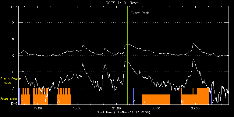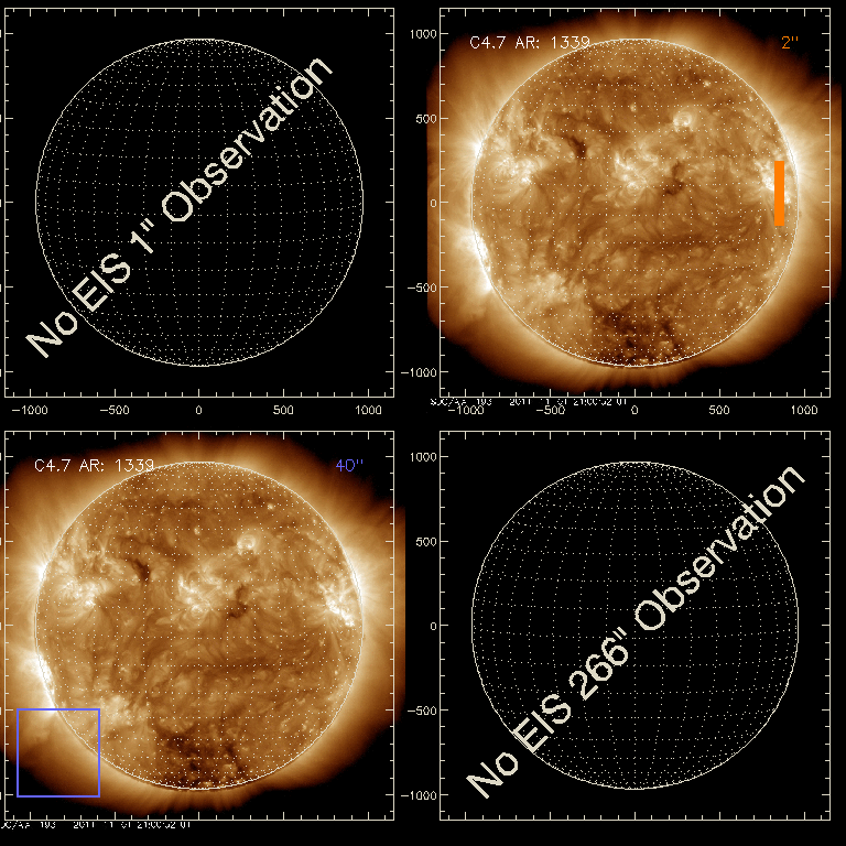 EIS Observation timeline overlay to GOES-Xray curve Code 1" 2" 40" 266" EIS Observations list for this event: STUDY ACRONYM ID DATE OBSERVED DESCRIPTION NOAA# TARGET 0 full_sun_slot_scan_1 | 24853 | 2011/11/01 13:32:43 | Multi-Temperature Full Disc Slot Scans | | Quiet Sun TIMELINE ID DATE OBSERVED FITS FILE XCEN (+W/-E) YCEN (+N/-S) DUR ----------------------------------------------------------------------------------------------------------------- 24853 | 2011/11/01 13:32:43.000 | eis_l0_20111101_133243.fits.gz | -830.33 | -757.17 | 5m27s 1 IUU_SCAN_STEPS_002 | 24875 | 2011/11/01 13:45:33 | AR Region Studies - Dynamics | 1330 | Active Region TIMELINE ID DATE OBSERVED FITS FILE XCEN (+W/-E) YCEN (+N/-S) DUR ----------------------------------------------------------------------------------------------------------------- 24875 | 2011/11/01 13:45:33.000 | eis_l0_20111101_134533.fits.gz | 847.17 | 50.48 | 5m24s 24875 | 2011/11/01 13:51:00.000 | eis_l0_20111101_135100.fits.gz | 847.48 | 50.48 | 5m24s 24875 | 2011/11/01 13:56:27.000 | eis_l0_20111101_135627.fits.gz | 847.87 | 50.41 | 5m23s 24875 | 2011/11/01 14:01:54.000 | eis_l0_20111101_140154.fits.gz | 848.25 | 50.64 | 5m23s 24875 | 2011/11/01 14:07:21.000 | eis_l0_20111101_140721.fits.gz | 848.72 | 50.64 | 5m23s 24875 | 2011/11/01 14:12:47.000 | eis_l0_20111101_141247.fits.gz | 849.10 | 50.64 | 5m24s 24875 | 2011/11/01 14:18:14.000 | eis_l0_20111101_141814.fits.gz | 849.49 | 50.87 | 5m24s 2 IUU_SCAN_STEPS_002 | 24873 | 2011/11/01 14:40:12 | AR Region Studies - Dynamics | 1330 | Active Region TIMELINE ID DATE OBSERVED FITS FILE XCEN (+W/-E) YCEN (+N/-S) DUR ----------------------------------------------------------------------------------------------------------------- 24873 | 2011/11/01 14:40:12.000 | eis_l0_20111101_144012.fits.gz | 851.03 | 50.95 | 5m24s 24873 | 2011/11/01 14:45:39.000 | eis_l0_20111101_144539.fits.gz | 851.57 | 50.95 | 5m23s 24873 | 2011/11/01 14:51:05.000 | eis_l0_20111101_145105.fits.gz | 851.73 | 51.18 | 5m24s 24873 | 2011/11/01 14:56:32.000 | eis_l0_20111101_145632.fits.gz | 852.19 | 51.26 | 5m24s 24873 | 2011/11/01 15:01:59.000 | eis_l0_20111101_150159.fits.gz | 852.66 | 51.18 | 5m23s 24873 | 2011/11/01 15:07:26.000 | eis_l0_20111101_150726.fits.gz | 853.04 | 51.33 | 3m13s 24873 | 2011/11/01 15:11:02.000 | eis_l0_20111101_151102.fits.gz | 853.27 | 51.33 | 1m47s 24873 | 2011/11/01 15:12:52.000 | eis_l0_20111101_151252.fits.gz | 853.43 | 51.26 | 5m24s 24873 | 2011/11/01 15:18:19.000 | eis_l0_20111101_151819.fits.gz | 853.81 | 51.41 | 5m24s 24873 | 2011/11/01 15:23:46.000 | eis_l0_20111101_152346.fits.gz | 854.20 | 51.41 | 5m23s 24873 | 2011/11/01 15:29:13.000 | eis_l0_20111101_152913.fits.gz | 854.59 | 51.56 | 5m23s 24873 | 2011/11/01 15:34:40.000 | eis_l0_20111101_153440.fits.gz | 854.97 | 51.56 | 5m23s 24873 | 2011/11/01 15:40:06.000 | eis_l0_20111101_154006.fits.gz | 855.36 | 51.64 | 5m24s 3 IUU_SCAN_STEPS_002 | 24874 | 2011/11/01 16:28:01 | AR Region Studies - Dynamics | 1330 | Active Region TIMELINE ID DATE OBSERVED FITS FILE XCEN (+W/-E) YCEN (+N/-S) DUR ----------------------------------------------------------------------------------------------------------------- 24874 | 2011/11/01 16:28:01.000 | eis_l0_20111101_162801.fits.gz | 858.68 | 52.18 | 5m23s 24874 | 2011/11/01 16:33:28.000 | eis_l0_20111101_163328.fits.gz | 859.14 | 52.18 | 5m23s 24874 | 2011/11/01 16:38:54.000 | eis_l0_20111101_163854.fits.gz | 859.53 | 52.26 | 5m24s 24874 | 2011/11/01 16:44:21.000 | eis_l0_20111101_164421.fits.gz | 859.92 | 52.41 | 5m24s 24874 | 2011/11/01 16:49:48.000 | eis_l0_20111101_164948.fits.gz | 860.22 | 52.41 | 5m23s 24874 | 2011/11/01 16:55:15.000 | eis_l0_20111101_165515.fits.gz | 860.61 | 52.57 | 5m23s 24874 | 2011/11/01 17:00:41.000 | eis_l0_20111101_170041.fits.gz | 861.08 | 52.65 | 5m24s 24874 | 2011/11/01 17:06:08.000 | eis_l0_20111101_170608.fits.gz | 861.46 | 52.57 | 5m24s 24874 | 2011/11/01 17:11:35.000 | eis_l0_20111101_171135.fits.gz | 861.77 | 52.65 | 5m23s 24874 | 2011/11/01 17:17:02.000 | eis_l0_20111101_171702.fits.gz | 862.08 | 52.88 | 5m23s 24874 | 2011/11/01 17:22:28.000 | eis_l0_20111101_172228.fits.gz | 862.54 | 52.72 | 1m47s 24874 | 2011/11/01 17:24:38.000 | eis_l0_20111101_172438.fits.gz | 862.62 | 52.88 | 3m14s 24874 | 2011/11/01 17:27:55.000 | eis_l0_20111101_172755.fits.gz | 862.85 | 53.03 | 5m24s 4 PRY_slot_context_v3 | 24881 | 2011/11/01 22:14:47 | Limb Active Region Study - Context | | Active Region TIMELINE ID DATE OBSERVED FITS FILE XCEN (+W/-E) YCEN (+N/-S) DUR ----------------------------------------------------------------------------------------------------------------- 24881 | 2011/11/01 22:14:47.000 | eis_l0_20111101_221447.fits.gz | -9884.69 | -9963.20 | 2m56s 5 cam_ar_limb_lite_v2 | 24879 | 2011/11/01 22:58:03 | Limb Active Region Study - Temperature | | Active Region TIMELINE ID DATE OBSERVED FITS FILE XCEN (+W/-E) YCEN (+N/-S) DUR ----------------------------------------------------------------------------------------------------------------- 24879 | 2011/11/01 22:58:03.000 | eis_l0_20111101_225803.fits.gz | -9869.70 | -9963.20 | 2h6m1s 6 cam_ar_limb_lite_v2 | 24876 | 2011/11/02 01:53:36 | Limb Active Region Study - Temperature | | Active Region TIMELINE ID DATE OBSERVED FITS FILE XCEN (+W/-E) YCEN (+N/-S) DUR ----------------------------------------------------------------------------------------------------------------- 24876 | 2011/11/02 01:53:36.000 | eis_l0_20111102_015336.fits.gz | -9869.70 | -9963.20 | 5m25s 24876 | 2011/11/02 01:59:03.000 | eis_l0_20111102_015903.fits.gz | -9869.70 | -9963.20 | 48m13s 24876 | 2011/11/02 02:48:04.000 | eis_l0_20111102_024804.fits.gz | -9869.70 | -9963.20 | 3m5s 24876 | 2011/11/02 02:51:11.000 | eis_l0_20111102_025111.fits.gz | -9869.70 | -9963.20 | 16m18s 24876 | 2011/11/02 03:07:31.000 | eis_l0_20111102_030731.fits.gz | -9869.70 | -9963.20 | 52m6s 7 PRY_slot_context_v3 | 24880 | 2011/11/02 04:13:01 | Limb Active Region Study - Context | |