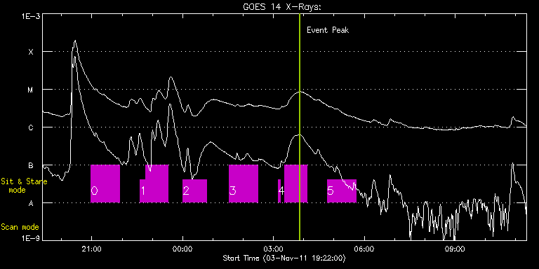 EIS Observation timeline overlay to GOES-Xray curve Code 1" 2" 40" 266" EIS Observations list for this event: STUDY ACRONYM ID DATE OBSERVED DESCRIPTION NOAA# TARGET 0 HPW021_VEL_001x512v1 | 24889 | 2011/11/03 20:58:40 | Exploratory Sit-n-Stare Active Region | | Active Region TIMELINE ID DATE OBSERVED FITS FILE XCEN (+W/-E) YCEN (+N/-S) DUR ----------------------------------------------------------------------------------------------------------------- 24889 | 2011/11/03 20:58:40.000 | eis_l0_20111103_205840.fits.gz | -813.64 | 173.96 | 56m43s 1 HPW021_VEL_001x512v1 | 24890 | 2011/11/03 22:35:42 | Exploratory Sit-n-Stare Active Region | | Active Region TIMELINE ID DATE OBSERVED FITS FILE XCEN (+W/-E) YCEN (+N/-S) DUR ----------------------------------------------------------------------------------------------------------------- 24890 | 2011/11/03 22:35:42.000 | eis_l0_20111103_223542.fits.gz | -807.07 | 172.96 | 10m17s 24890 | 2011/11/03 22:46:01.000 | eis_l0_20111103_224601.fits.gz | -806.22 | 172.80 | 45m22s 2 HPW021_VEL_001x512v1 | 24891 | 2011/11/04 00:00:40 | Exploratory Sit-n-Stare Active Region | | Active Region TIMELINE ID DATE OBSERVED FITS FILE XCEN (+W/-E) YCEN (+N/-S) DUR ----------------------------------------------------------------------------------------------------------------- 24891 | 2011/11/04 00:00:40.000 | eis_l0_20111104_000040.fits.gz | -801.05 | 172.26 | 47m26s 3 HPW021_VEL_001x512v1 | 24892 | 2011/11/04 01:32:43 | Exploratory Sit-n-Stare Active Region | | Active Region TIMELINE ID DATE OBSERVED FITS FILE XCEN (+W/-E) YCEN (+N/-S) DUR ----------------------------------------------------------------------------------------------------------------- 24892 | 2011/11/04 01:32:43.000 | eis_l0_20111104_013243.fits.gz | -794.33 | 171.49 | 56m43s 4 HPW021_VEL_001x512v1 | 24893 | 2011/11/04 03:09:13 | Exploratory Sit-n-Stare Active Region | | Active Region TIMELINE ID DATE OBSERVED FITS FILE XCEN (+W/-E) YCEN (+N/-S) DUR ----------------------------------------------------------------------------------------------------------------- 24893 | 2011/11/04 03:09:13.000 | eis_l0_20111104_030913.fits.gz | -787.30 | 170.72 | 4m6s 24893 | 2011/11/04 03:22:37.000 | eis_l0_20111104_032237.fits.gz | -786.21 | 170.64 | 43m18s 5 HPW021_VEL_001x512v1 | 24894 | 2011/11/04 04:46:43 | Exploratory Sit-n-Stare Active Region | | Active Region TIMELINE ID DATE OBSERVED FITS FILE XCEN (+W/-E) YCEN (+N/-S) DUR ----------------------------------------------------------------------------------------------------------------- 24894 | 2011/11/04 04:46:43.000 | eis_l0_20111104_044643.fits.gz | -779.80 | 169.79 | 56m42s : Check study information : Download file : View thumbnails For this event, also check for: