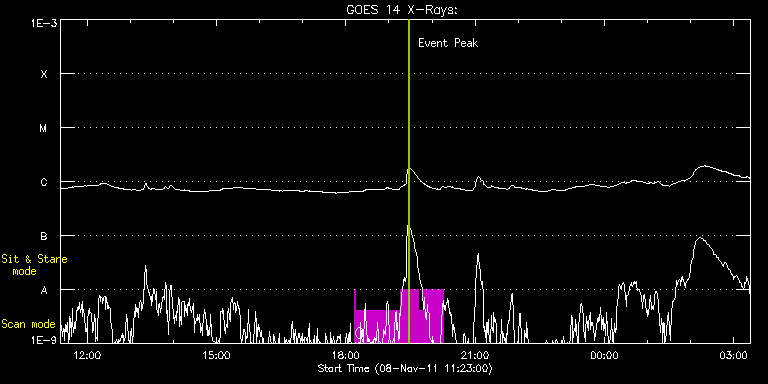 EIS Observation timeline overlay to GOES-Xray curve Code 1" 2" 40" 266" EIS Observations list for this event: STUDY ACRONYM ID DATE OBSERVED DESCRIPTION NOAA# TARGET 0 HPW021_VEL_240x512v1 | 24934 | 2011/11/08 18:12:34 | Detailed scan of AR 11339 at disk cent | 1339 | Active Region TIMELINE ID DATE OBSERVED FITS FILE XCEN (+W/-E) YCEN (+N/-S) DUR ----------------------------------------------------------------------------------------------------------------- 24934 | 2011/11/08 18:12:34.000 | eis_l0_20111108_181234.fits.gz | 45.26 | 245.61 | 1m 24934 | 2011/11/08 18:13:36.000 | eis_l0_20111108_181336.fits.gz | 45.34 | 245.46 | 1h1m52s 24934 | 2011/11/08 19:15:30.000 | eis_l0_20111108_191530.fits.gz | 54.45 | 245.53 | 25m46s 24934 | 2011/11/08 19:41:18.000 | eis_l0_20111108_194118.fits.gz | 58.16 | 245.61 | 7m11s 24934 | 2011/11/08 19:48:31.000 | eis_l0_20111108_194831.fits.gz | 59.24 | 245.69 | 27m50s : Check study information : Download file : View thumbnails For this event, also check for: