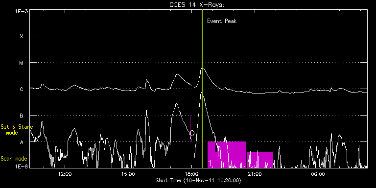 EIS Observation timeline overlay to GOES-Xray curve Code 1" 2" 40" 266" EIS Observations list for this event: STUDY ACRONYM ID DATE OBSERVED DESCRIPTION NOAA# TARGET 0 regcal076 | 24937 | 2011/11/10 17:55:42 | Flatfield, 1 exposure, led 100ms, ccd | | Engineering TIMELINE ID DATE OBSERVED FITS FILE XCEN (+W/-E) YCEN (+N/-S) DUR ----------------------------------------------------------------------------------------------------------------- 24937 | 2011/11/10 17:55:42.000 | eis_l0_20111110_175542.fits.gz | 14.51 | -50.42 | 1s 1 HPW021_VEL_360x512v1 | 24936 | 2011/11/10 18:46:10 | Scan of AR coordinated with SUMER | 1339 | Active Region TIMELINE ID DATE OBSERVED FITS FILE XCEN (+W/-E) YCEN (+N/-S) DUR ----------------------------------------------------------------------------------------------------------------- 24936 | 2011/11/10 18:46:10.000 | eis_l0_20111110_184610.fits.gz | 487.12 | 257.74 | 21m38s 24936 | 2011/11/10 19:07:50.000 | eis_l0_20111110_190750.fits.gz | 489.82 | 257.74 | 5m8s 24936 | 2011/11/10 19:13:00.000 | eis_l0_20111110_191300.fits.gz | 490.44 | 257.97 | 1h22m31s 24936 | 2011/11/10 20:39:41.000 | eis_l0_20111110_203941.fits.gz | 501.18 | 258.36 | 1h12m12s : Check study information : Download file : View thumbnails For this event, also check for: