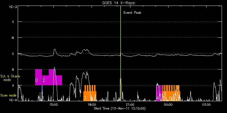 EIS Observation timeline overlay to GOES-Xray curve Code 1" 2" 40" 266" EIS Observations list for this event: STUDY ACRONYM ID DATE OBSERVED DESCRIPTION NOAA# TARGET 0 RED_SUM_EIS_SNS_OL | 24952 | 2011/11/13 13:33:40 | HOP-205; Line shift vs Temperature wit | | Quiet Sun TIMELINE ID DATE OBSERVED FITS FILE XCEN (+W/-E) YCEN (+N/-S) DUR ----------------------------------------------------------------------------------------------------------------- 24952 | 2011/11/13 13:33:40.000 | eis_l0_20111113_133340.fits.gz | 804.88 | -658.49 | 30m23s 1 PRY_slot_context_v3 | 24953 | 2011/11/13 14:04:28 | HOP-205; Line shift vs Temperature wit | 1345 | Active Region TIMELINE ID DATE OBSERVED FITS FILE XCEN (+W/-E) YCEN (+N/-S) DUR ----------------------------------------------------------------------------------------------------------------- 24953 | 2011/11/13 14:04:28.000 | eis_l0_20111113_140428.fits.gz | 704.79 | -658.49 | 2m56s 2 RED_SUM_EIS_SNS_OL | 24954 | 2011/11/13 14:07:35 | HOP-205; Line shift vs Temperature wit | | Quiet Sun TIMELINE ID DATE OBSERVED FITS FILE XCEN (+W/-E) YCEN (+N/-S) DUR ----------------------------------------------------------------------------------------------------------------- 24954 | 2011/11/13 14:07:35.000 | eis_l0_20111113_140735.fits.gz | 804.88 | -658.49 | 30m24s 24954 | 2011/11/13 14:38:08.000 | eis_l0_20111113_143808.fits.gz | 804.88 | -658.57 | 30m23s 24954 | 2011/11/13 15:08:41.000 | eis_l0_20111113_150841.fits.gz | 804.80 | -658.49 | 30m24s 3 IUU_SCAN_STEPS_002 | 24969 | 2011/11/13 17:21:26 | Fast scan on flaring AR 11342 | | Active Region TIMELINE ID DATE OBSERVED FITS FILE XCEN (+W/-E) YCEN (+N/-S) DUR ----------------------------------------------------------------------------------------------------------------- 24969 | 2011/11/13 17:21:26.000 | eis_l0_20111113_172126.fits.gz | 416.67 | 219.50 | 5m24s 24969 | 2011/11/13 17:26:53.000 | eis_l0_20111113_172653.fits.gz | 417.36 | 219.50 | 5m24s 24969 | 2011/11/13 17:32:20.000 | eis_l0_20111113_173220.fits.gz | 418.14 | 219.66 | 5m24s 24969 | 2011/11/13 17:37:47.000 | eis_l0_20111113_173747.fits.gz | 418.83 | 219.58 | 5m24s 24969 | 2011/11/13 17:43:14.000 | eis_l0_20111113_174314.fits.gz | 419.53 | 219.66 | 5m24s 24969 | 2011/11/13 17:48:41.000 | eis_l0_20111113_174841.fits.gz | 420.30 | 219.66 | 5m23s 24969 | 2011/11/13 17:54:08.000 | eis_l0_20111113_175408.fits.gz | 420.99 | 219.58 | 5m23s 24969 | 2011/11/13 17:59:35.000 | eis_l0_20111113_175935.fits.gz | 421.77 | 219.73 | 5m23s 24969 | 2011/11/13 18:05:01.000 | eis_l0_20111113_180501.fits.gz | 422.39 | 219.73 | 5m24s 24969 | 2011/11/13 18:10:28.000 | eis_l0_20111113_181028.fits.gz | 423.16 | 219.89 | 5m24s 24969 | 2011/11/13 18:15:55.000 | eis_l0_20111113_181555.fits.gz | 423.93 | 219.81 | 5m23s 4 SK_AR1_50x320c | 24958 | 2011/11/13 23:03:27 | HOP-128; Cangpaim bitween Hida and Hin | 1339 | Active Region TIMELINE ID DATE OBSERVED FITS FILE XCEN (+W/-E) YCEN (+N/-S) DUR ----------------------------------------------------------------------------------------------------------------- 24958 | 2011/11/13 23:03:27.000 | eis_l0_20111113_230327.fits.gz | 891.57 | 295.44 | 2m45s 24958 | 2011/11/13 23:06:15.000 | eis_l0_20111113_230615.fits.gz | 891.57 | 295.51 | 2m45s 24958 | 2011/11/13 23:09:03.000 | eis_l0_20111113_230903.fits.gz | 891.49 | 295.36 | 2m46s 24958 | 2011/11/13 23:11:52.000 | eis_l0_20111113_231152.fits.gz | 891.49 | 295.44 | 2m45s 24958 | 2011/11/13 23:14:40.000 | eis_l0_20111113_231440.fits.gz | 891.57 | 295.36 | 2m45s 24958 | 2011/11/13 23:17:29.000 | eis_l0_20111113_231729.fits.gz | 891.57 | 295.36 | 2m45s 24958 | 2011/11/13 23:20:17.000 | eis_l0_20111113_232017.fits.gz | 891.49 | 295.36 | 2m45s 24958 | 2011/11/13 23:23:05.000 | eis_l0_20111113_232305.fits.gz | 891.49 | 295.44 | 2m45s 24958 | 2011/11/13 23:25:54.000 | eis_l0_20111113_232554.fits.gz | 891.49 | 295.44 | 2m45s 24958 | 2011/11/13 23:28:42.000 | eis_l0_20111113_232842.fits.gz | 891.57 | 295.36 | 2m45s 5 CAM_ARTB_RHESSI_b_2 | 24959 | 2011/11/13 23:31:45 | HOP-128; Cangpaim bitween Hida and Hin | 1339 | Active Region TIMELINE ID DATE OBSERVED FITS FILE XCEN (+W/-E) YCEN (+N/-S) DUR ----------------------------------------------------------------------------------------------------------------- 24959 | 2011/11/13 23:31:45.000 | eis_l0_20111113_233145.fits.gz | 891.51 | 295.44 | 3m52s 24959 | 2011/11/13 23:35:40.000 | eis_l0_20111113_233540.fits.gz | 891.58 | 295.44 | 3m52s 24959 | 2011/11/13 23:39:35.000 | eis_l0_20111113_233935.fits.gz | 891.58 | 295.36 | 3m52s 24959 | 2011/11/13 23:43:29.000 | eis_l0_20111113_234329.fits.gz | 891.58 | 295.36 | 3m52s 24959 | 2011/11/13 23:47:24.000 | eis_l0_20111113_234724.fits.gz | 891.51 | 295.36 | 3m51s 24959 | 2011/11/13 23:51:18.000 | eis_l0_20111113_235118.fits.gz | 891.51 | 295.51 | 3m52s 24959 | 2011/11/13 23:55:13.000 | eis_l0_20111113_235513.fits.gz | 891.51 | 295.44 | 3m52s 24959 | 2011/11/13 23:59:07.000 | eis_l0_20111113_235907.fits.gz | 891.51 | 295.51 | 3m52s 6 tr_bright_lo | 24960 | 2011/11/14 00:03:30 | HOP-128; Cangpaim bitween Hida and Hin | 1339 | Quiet Sun TIMELINE ID DATE OBSERVED FITS FILE XCEN (+W/-E) YCEN (+N/-S) DUR ----------------------------------------------------------------------------------------------------------------- 24960 | 2011/11/14 00:03:30.000 | eis_l0_20111114_000330.fits.gz | 891.51 | 295.44 | 5m15s 24960 | 2011/11/14 00:08:48.000 | eis_l0_20111114_000848.fits.gz | 891.51 | 295.36 | 5m15s 24960 | 2011/11/14 00:14:06.000 | eis_l0_20111114_001406.fits.gz | 891.51 | 295.44 | 5m15s 24960 | 2011/11/14 00:19:24.000 | eis_l0_20111114_001924.fits.gz | 891.51 | 295.59 | 5m15s 24960 | 2011/11/14 00:24:42.000 | eis_l0_20111114_002442.fits.gz | 891.51 | 295.44 | 5m15s 24960 | 2011/11/14 00:30:00.000 | eis_l0_20111114_003000.fits.gz | 891.51 | 295.44 | 5m14s 24960 | 2011/11/14 00:35:17.000 | eis_l0_20111114_003517.fits.gz | 891.58 | 295.36 | 5m15s 24960 | 2011/11/14 00:40:35.000 | eis_l0_20111114_004035.fits.gz | 891.51