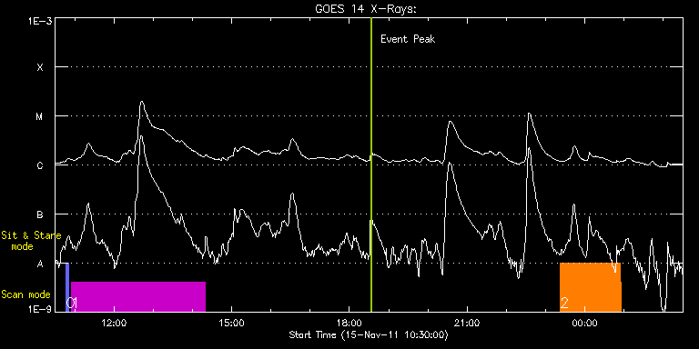 EIS Observation timeline overlay to GOES-Xray curve Code 1" 2" 40" 266" EIS Observations list for this event: STUDY ACRONYM ID DATE OBSERVED DESCRIPTION NOAA# TARGET 0 PRY_slot_context_v3 | 24974 | 2011/11/15 10:47:21 | HOP176 : Context image | 1347 | Active Region TIMELINE ID DATE OBSERVED FITS FILE XCEN (+W/-E) YCEN (+N/-S) DUR ----------------------------------------------------------------------------------------------------------------- 24974 | 2011/11/15 10:47:21.000 | eis_l0_20111115_104721.fits.gz | -9.11 | -151.52 | 2m56s 1 HPW021_VEL_240x512v2 | 24984 | 2011/11/15 10:55:20 | QS observation for EIS-SUMER studies | | Quiet Sun TIMELINE ID DATE OBSERVED FITS FILE XCEN (+W/-E) YCEN (+N/-S) DUR ----------------------------------------------------------------------------------------------------------------- 24984 | 2011/11/15 10:55:20.000 | eis_l0_20111115_105520.fits.gz | 7.10 | -151.37 | 3h23m48s 2 DRW_Alf_01 | 24982 | 2011/11/15 23:22:27 | HOP128 : Coordinated observation betwe | 1351 | Active Region TIMELINE ID DATE OBSERVED FITS FILE XCEN (+W/-E) YCEN (+N/-S) DUR ----------------------------------------------------------------------------------------------------------------- 24982 | 2011/11/15 23:22:27.000 | eis_l0_20111115_232227.fits.gz | -530.32 | -448.54 | 1m8s 24982 | 2011/11/15 23:23:38.000 | eis_l0_20111115_232338.fits.gz | -530.08 | -448.54 | 1m8s 24982 | 2011/11/15 23:24:49.000 | eis_l0_20111115_232449.fits.gz | -530.01 | -448.61 | 1m9s 24982 | 2011/11/15 23:26:01.000 | eis_l0_20111115_232601.fits.gz | -529.93 | -448.54 | 1m8s 24982 | 2011/11/15 23:27:12.000 | eis_l0_20111115_232712.fits.gz | -529.70 | -448.54 | 1m8s 24982 | 2011/11/15 23:28:23.000 | eis_l0_20111115_232823.fits.gz | -529.62 | -448.61 | 1m9s 24982 | 2011/11/15 23:29:34.000 | eis_l0_20111115_232934.fits.gz | -529.47 | -448.54 | 1m9s 24982 | 2011/11/15 23:30:46.000 | eis_l0_20111115_233046.fits.gz | -529.39 | -448.61 | 1m8s 24982 | 2011/11/15 23:31:57.000 | eis_l0_20111115_233157.fits.gz | -529.23 | -448.61 | 1m8s 24982 | 2011/11/15 23:33:08.000 | eis_l0_20111115_233308.fits.gz | -529.16 | -448.54 | 1m8s 24982 | 2011/11/15 23:34:19.000 | eis_l0_20111115_233419.fits.gz | -528.92 | -448.15 | 1m9s 24982 | 2011/11/15 23:35:30.000 | eis_l0_20111115_233530.fits.gz | -528.77 | -448.69 | 1m9s 24982 | 2011/11/15 23:36:42.000 | eis_l0_20111115_233642.fits.gz | -528.69 | -448.54 | 1m8s 24982 | 2011/11/15 23:37:53.000 | eis_l0_20111115_233753.fits.gz | -528.61 | -448.54 | 1m8s 24982 | 2011/11/15 23:39:04.000 | eis_l0_20111115_233904.fits.gz | -528.46 | -448.69 | 1m8s 24982 | 2011/11/15 23:40:15.000 | eis_l0_20111115_234015.fits.gz | -528.31 | -448.69 | 1m8s 24982 | 2011/11/15 23:41:26.000 | eis_l0_20111115_234126.fits.gz | -528.15 | -448.69 | 57s 24982 | 2011/11/15 23:42:37.000 | eis_l0_20111115_234237.fits.gz | -528.08 | -448.69 | 1m9s 24982 | 2011/11/15 23:43:49.000 | eis_l0_20111115_234349.fits.gz | -527.92 | -448.54 | 1m8s 24982 | 2011/11/15 23:45:00.000 | eis_l0_20111115_234500.fits.gz | -527.77 | -448.61 | 1m8s 24982 | 2011/11/15 23:46:11.000 | eis_l0_20111115_234611.fits.gz | -527.69 | -448.54 | 1m9s 24982 | 2011/11/15 23:47:22.000 | eis_l0_20111115_234722.fits.gz | -527.53 | -448.69 | 1m9s 24982 | 2011/11/15 23:48:34.000 | eis_l0_20111115_234834.fits.gz | -527.38 | -448.61 | 1m8s 24982 | 2011/11/15 23:49:45.000 | eis_l0_20111115_234945.fits.gz | -527.30 | -448.61 | 1m8s 24982 | 2011/11/15 23:50:56.000 | eis_l0_20111115_235056.fits.gz | -527.15 | -448.61 | 1m8s 24982 | 2011/11/15 23:52:07.000 | eis_l0_20111115_235207.fits.gz | -526.92 | -448.61 | 1m8s 24982 | 2011/11/15 23:53:18.000 | eis_l0_20111115_235318.fits.gz | -526.92 | -448.61 | 1m9s 24982 | 2011/11/15 23:54:29.000 | eis_l0_20111115_235429.fits.gz | -526.68 | -448.69 | 1m9s 24982 | 2011/11/15 23:55:41.000 | eis_l0_20111115_235541.fits.gz | -526.61 | -448.69 | 1m8s 24982 | 2011/11/15 23:56:52.000 | eis_l0_20111115_235652.fits.gz | -526.53 | -448.61 | 1m8s 24982 | 2011/11/15 23:58:03.000 | eis_l0_20111115_235803.fits.gz | -526.38 | -448.61 | 1m9s 24982 | 2011/11/15 23:59:14.000 | eis_l0_20111115_235914.fits.gz | -526.22 | -448.69 | 1m9s 24982 | 2011/11/16 00:00:25.000 | eis_l0_20111116_000025.fits.gz | -526.07 | -448.69 | 1m9s 24982 | 2011/11/16 00:01:37.000 | eis_l0_20111116_000137.fits.gz | -525.99 | -448.69 | 1m8s 24982 | 2011/11/16 00:02:48.000 | eis_l0_20111116_000248.fits.gz | -525.76 | -448.85 | 1m9s 24982 | 2011/11/16 00:03:59.000 | eis_l0_20111116_000359.fits.gz | -525.76 | -448.69 | 1m9s 24982 | 2011/11/16 00:05:10.000 | eis_l0_20111116_000510.fits.gz | -525.60 | -448.77 | 1m9s 24982 | 2011/11/16 00:06:22.000 | eis_l0_20111116_000622.fits.gz | -525.37 | -448.69 | 1m8s 24982 | 2011/11/16 00:07:33.000 | eis_l0_20111116_000733.fits.gz | -525.22 | -448.69 | 1m9s 24982 | 2011/11/16 00:08:44.000 | eis_l0_20111116_000844.fits.gz | -525.22 | -448.61 | 1m9s 24982 | 2011/11/16 00:09:56.000 | eis_l0_20111116_000956.fits.gz | -524.98 | -448.77 | 1m8s 24982 | 2011/11/16 00:11:07.000 | eis_l0_20111116_001107.fits.gz | -524.83 | -448.77 | 1m8s 24982 | 2011/11/16 00:12:18.000 | eis_l0_20111116_001218.fits.gz | -524.68 | -448.85 | 1m9s 24982 | 2011/11/16 00:13:30.000 | eis_l0_20111116_001330.fits.gz | -524.75 | -448.77 | 1m8s 24982 | 2011/11/16 00:14:41.000 | eis_l0_20111116_001441.fits.gz | -524.52 | -448.85 | 1m8s 24982 | 2011/11/16 00:15:52.000 | eis_l0_20111116_001552.fits.gz | -524.44 | -448.69 | 1m8s 24982 | 2011/11/16 00:17:03.000 | eis_l0_20111116_001703.fits.gz | -524.37 | -448.61 | 1m8s 24982 | 2011/11/16 00:18:14.000 | eis_l0_20111116_001814.fits.gz | -524.14 | -448.69 | 1m9s 24982 | 2011/11/16 00:19:25.000 | eis_l0_20111116_001925.fits.gz | -523.98 | -448.77 | 1m9s 24982 | 2011/11/16 00:20:37.000 | eis_l0_20111116_002037.fits.gz | -523.90 | -448.77 | 1m8s 24982 | 2011/11/16 00:21:48.000 | eis_l0_20111116_002148.fits.gz | -523.75 | -448.69 | 1m8s 24982 | 2011/11/16 00:22:59.000 | eis_l0_20111116_002259.fits.gz | -523.59 | -448.77 | 1m9s 24982 | 2011/1