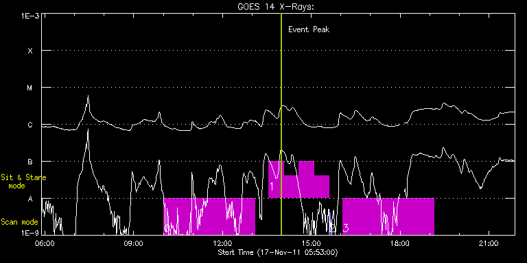 EIS Observation timeline overlay to GOES-Xray curve Code 1" 2" 40" 266" EIS Observations list for this event: STUDY ACRONYM ID DATE OBSERVED DESCRIPTION NOAA# TARGET 0 HPW021_VEL_360x512v1 | 24988 | 2011/11/17 10:00:41 | HOP205 AR study | 1346 | Active Region TIMELINE ID DATE OBSERVED FITS FILE XCEN (+W/-E) YCEN (+N/-S) DUR ----------------------------------------------------------------------------------------------------------------- 24988 | 2011/11/17 10:00:41.000 | eis_l0_20111117_100041.fits.gz | -161.45 | -392.18 | 3h5m42s 1 RED_SUM_EIS_SNS_OL | 24989 | 2011/11/17 13:33:41 | HOP205 OFF-limb study | | Quiet Sun TIMELINE ID DATE OBSERVED FITS FILE XCEN (+W/-E) YCEN (+N/-S) DUR ----------------------------------------------------------------------------------------------------------------- 24989 | 2011/11/17 13:33:41.000 | eis_l0_20111117_133341.fits.gz | 760.00 | -730.40 | 30m22s 24989 | 2011/11/17 14:04:13.000 | eis_l0_20111117_140413.fits.gz | 41.29 | -403.02 | 30m23s 24989 | 2011/11/17 14:34:46.000 | eis_l0_20111117_143446.fits.gz | 759.92 | -730.55 | 30m23s 24989 | 2011/11/17 15:05:19.000 | eis_l0_20111117_150519.fits.gz | 760.00 | -730.55 | 30m23s 2 PRY_slot_context_v3 | 24990 | 2011/11/17 15:36:07 | HOP205 OFF-limb study | | Active Region TIMELINE ID DATE OBSERVED FITS FILE XCEN (+W/-E) YCEN (+N/-S) DUR ----------------------------------------------------------------------------------------------------------------- 24990 | 2011/11/17 15:36:07.000 | eis_l0_20111117_153607.fits.gz | 669.82 | -690.55 | 2m56s 3 HPW021_VEL_360x512v1 | 24991 | 2011/11/17 16:03:21 | AR observation with SUMER for calibrat | 1346 | Active Region TIMELINE ID DATE OBSERVED FITS FILE XCEN (+W/-E) YCEN (+N/-S) DUR ----------------------------------------------------------------------------------------------------------------- 24991 | 2011/11/17 16:03:21.000 | eis_l0_20111117_160321.fits.gz | -110.00 | -391.61 | 3h5m42s : Check study information : Download file : View thumbnails For this event, also check for: