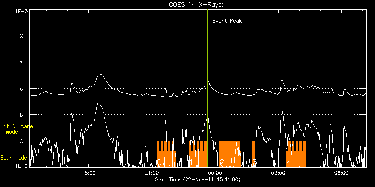 EIS Observation timeline overlay to GOES-Xray curve Code 1" 2" 40" 266" EIS Observations list for this event: STUDY ACRONYM ID DATE OBSERVED DESCRIPTION NOAA# TARGET 0 HH_Flare+AR_180x152 | 25087 | 2011/11/22 21:14:03 | Flare Hunting and AR study | 1354 | Flare TIMELINE ID DATE OBSERVED FITS FILE XCEN (+W/-E) YCEN (+N/-S) DUR ----------------------------------------------------------------------------------------------------------------- 25087 | 2011/11/22 21:14:03.000 | eis_l0_20111122_211403.fits.gz | -167.92 | -306.25 | 5m18s 25087 | 2011/11/22 21:19:24.000 | eis_l0_20111122_211924.fits.gz | -167.07 | -306.25 | 5m18s 25087 | 2011/11/22 21:24:45.000 | eis_l0_20111122_212445.fits.gz | -166.29 | -306.17 | 5m18s 25087 | 2011/11/22 21:30:06.000 | eis_l0_20111122_213006.fits.gz | -165.52 | -306.25 | 5m18s 25087 | 2011/11/22 21:35:27.000 | eis_l0_20111122_213527.fits.gz | -164.67 | -306.09 | 5m18s 25087 | 2011/11/22 21:40:47.000 | eis_l0_20111122_214047.fits.gz | -163.90 | -306.17 | 5m18s 25087 | 2011/11/22 21:46:08.000 | eis_l0_20111122_214608.fits.gz | -163.13 | -306.25 | 5m18s 25087 | 2011/11/22 21:51:29.000 | eis_l0_20111122_215129.fits.gz | -162.35 | -306.17 | 5m18s 25087 | 2011/11/22 21:56:50.000 | eis_l0_20111122_215650.fits.gz | -161.51 | -306.17 | 5m18s 25087 | 2011/11/22 22:02:11.000 | eis_l0_20111122_220211.fits.gz | -160.81 | -306.17 | 5m17s 1 HH_Flare+AR_180x152 | 25088 | 2011/11/22 22:46:28 | Flare Hunting and AR study | 1354 | Flare TIMELINE ID DATE OBSERVED FITS FILE XCEN (+W/-E) YCEN (+N/-S) DUR ----------------------------------------------------------------------------------------------------------------- 25088 | 2011/11/22 22:46:28.000 | eis_l0_20111122_224628.fits.gz | -154.32 | -306.17 | 5m19s 25088 | 2011/11/22 22:51:49.000 | eis_l0_20111122_225149.fits.gz | -153.47 | -306.09 | 5m18s 25088 | 2011/11/22 22:57:10.000 | eis_l0_20111122_225710.fits.gz | -152.62 | -306.17 | 5m18s 25088 | 2011/11/22 23:02:31.000 | eis_l0_20111122_230231.fits.gz | -151.93 | -306.17 | 5m18s 25088 | 2011/11/22 23:07:51.000 | eis_l0_20111122_230751.fits.gz | -151.00 | -306.32 | 5m18s 25088 | 2011/11/22 23:13:12.000 | eis_l0_20111122_231312.fits.gz | -150.30 | -306.09 | 5m17s 25088 | 2011/11/22 23:18:32.000 | eis_l0_20111122_231832.fits.gz | -149.46 | -306.17 | 5m18s 25088 | 2011/11/22 23:23:52.000 | eis_l0_20111122_232352.fits.gz | -148.76 | -306.25 | 5m18s 25088 | 2011/11/22 23:29:13.000 | eis_l0_20111122_232913.fits.gz | -147.83 | -306.09 | 5m17s 25088 | 2011/11/22 23:34:33.000 | eis_l0_20111122_233433.fits.gz | -147.14 | -306.17 | 5m18s 2 DRW_Alf_01 | 25078 | 2011/11/23 00:12:44 | HOP128 AR | 1352 | Active Region TIMELINE ID DATE OBSERVED FITS FILE XCEN (+W/-E) YCEN (+N/-S) DUR ----------------------------------------------------------------------------------------------------------------- 25078 | 2011/11/23 00:12:44.000 | eis_l0_20111123_001244.fits.gz | 188.24 | -454.72 | 1m8s 25078 | 2011/11/23 00:13:55.000 | eis_l0_20111123_001355.fits.gz | 188.47 | -454.56 | 1m8s 25078 | 2011/11/23 00:15:06.000 | eis_l0_20111123_001506.fits.gz | 188.63 | -454.56 | 1m8s 25078 | 2011/11/23 00:16:17.000 | eis_l0_20111123_001617.fits.gz | 188.78 | -454.72 | 1m9s 25078 | 2011/11/23 00:17:28.000 | eis_l0_20111123_001728.fits.gz | 188.94 | -454.64 | 1m9s 25078 | 2011/11/23 00:18:40.000 | eis_l0_20111123_001840.fits.gz | 189.09 | -454.64 | 1m8s 25078 | 2011/11/23 00:19:51.000 | eis_l0_20111123_001951.fits.gz | 189.25 | -454.56 | 1m8s 25078 | 2011/11/23 00:21:02.000 | eis_l0_20111123_002102.fits.gz | 189.32 | -454.56 | 1m8s 25078 | 2011/11/23 00:22:13.000 | eis_l0_20111123_002213.fits.gz | 189.48 | -454.64 | 1m8s 25078 | 2011/11/23 00:23:24.000 | eis_l0_20111123_002324.fits.gz | 189.71 | -454.64 | 1m8s 25078 | 2011/11/23 00:24:35.000 | eis_l0_20111123_002435.fits.gz | 189.87 | -454.64 | 1m9s 25078 | 2011/11/23 00:25:46.000 | eis_l0_20111123_002546.fits.gz | 190.02 | -454.56 | 1m9s 25078 | 2011/11/23 00:26:57.000 | eis_l0_20111123_002657.fits.gz | 190.17 | -454.56 | 1m9s 25078 | 2011/11/23 00:28:09.000 | eis_l0_20111123_002809.fits.gz | 190.40 | -454.72 | 1m8s 25078 | 2011/11/23 00:29:20.000 | eis_l0_20111123_002920.fits.gz | 190.48 | -454.72 | 1m9s 25078 | 2011/11/23 00:30:31.000 | eis_l0_20111123_003031.fits.gz | 190.71 | -454.64 | 1m9s 25078 | 2011/11/23 00:31:43.000 | eis_l0_20111123_003143.fits.gz | 190.79 | -454.72 | 1m8s 25078 | 2011/11/23 00:32:54.000 | eis_l0_20111123_003254.fits.gz | 190.95 | -454.64 | 1m8s 25078 | 2011/11/23 00:34:05.000 | eis_l0_20111123_003405.fits.gz | 191.02 | -454.56 | 1m8s 25078 | 2011/11/23 00:35:16.000 | eis_l0_20111123_003516.fits.gz | 191.26 | -454.64 | 1m9s 25078 | 2011/11/23 00:36:28.000 | eis_l0_20111123_003628.fits.gz | 191.49 | -454.56 | 1m8s 25078 | 2011/11/23 00:37:39.000 | eis_l0_20111123_003739.fits.gz | 191.64 | -454.64 | 1m8s 25078 | 2011/11/23 00:38:50.000 | eis_l0_20111123_003850.fits.gz | 191.80 | -454.64 | 1m9s 25078 | 2011/11/23 00:40:01.000 | eis_l0_20111123_004001.fits.gz | 191.95 | -454.64 | 1m9s 25078 | 2011/11/23 00:41:13.000 | eis_l0_20111123_004113.fits.gz | 192.10 | -454.64 | 1m8s 25078 | 2011/11/23 00:42:24.000 | eis_l0_20111123_004224.fits.gz | 192.26 | -454.56 | 1m8s 25078 | 2011/11/23 00:43:35.000 | eis_l0_20111123_004335.fits.gz | 192.34 | -454.72 | 1m8s 25078 | 2011/11/23 00:44:46.000 | eis_l0_20111123_004446.fits.gz | 192.57 | -454.72 | 1m9s 25078 | 2011/11/23 00:45:57.000 | eis_l0_20111123_004557.fits.gz | 192.65 | -454.64 | 1m9s 25078 | 2011/11/23 00:47:09.000 | eis_l0_20111123_004709.fits.gz | 192.88 | -454.56 | 1m8s 25078 | 2011/11/23 00:48:20.000 | eis_l0_20111123_004820.fits.gz | 192.96 | -454.64 | 1m8s 25078 | 2011/11/23 00:49:31.000 | eis_l0_20111123_004931.fits.gz | 193.19 | -454.64 | 1m9s 25078 | 2011/11/23 00:50:42.000 | eis_l0_20111123_005042.fits.gz | 193.34 | -454.64 | 1m9s 25078 | 2011/11/23 00:51:54.000 | eis_l0_20111123_005154.fits.gz | 193.49 | -454.56 | 1m8s 25078 | 2011/11/23 00:53:05.000 | eis_l0_20111123_005305.fits.gz | 193
