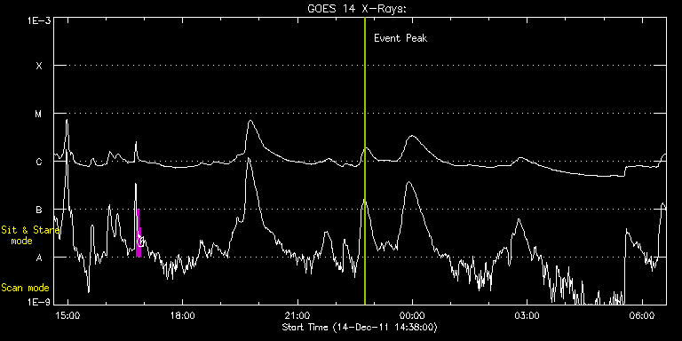 EIS Observation timeline overlay to GOES-Xray curve Code 1" 2" 40" 266" EIS Observations list for this event: STUDY ACRONYM ID DATE OBSERVED DESCRIPTION NOAA# TARGET 0 regcal071 | 25289 | 2011/12/14 16:47:41 | Dark exposures, CCD bottom rows (100s | | Engineering TIMELINE ID DATE OBSERVED FITS FILE XCEN (+W/-E) YCEN (+N/-S) DUR ----------------------------------------------------------------------------------------------------------------- 25289 | 2011/12/14 16:47:41.000 | eis_l0_20111214_164741.fits.gz | 81.72 | -607.15 | 3m22s 1 regcal072 | 25290 | 2011/12/14 16:51:30 | Dark exposures, top CCD rows (100s exp | | Engineering TIMELINE ID DATE OBSERVED FITS FILE XCEN (+W/-E) YCEN (+N/-S) DUR ----------------------------------------------------------------------------------------------------------------- 25290 | 2011/12/14 16:51:30.000 | eis_l0_20111214_165130.fits.gz | 82.33 | -96.23 | 3m21s : Check study information : Download file : View thumbnails For this event, also check for: