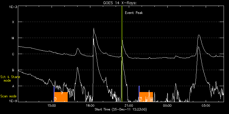 EIS Observation timeline overlay to GOES-Xray curve Code 1" 2" 40" 266" EIS Observations list for this event: STUDY ACRONYM ID DATE OBSERVED DESCRIPTION NOAA# TARGET 0 PRY_slot_context_v3 | 25362 | 2011/12/25 15:09:20 | EIS spectral atlas | 1381 | Active Region TIMELINE ID DATE OBSERVED FITS FILE XCEN (+W/-E) YCEN (+N/-S) DUR ----------------------------------------------------------------------------------------------------------------- 25362 | 2011/12/25 15:09:20.000 | eis_l0_20111225_150920.fits.gz | 778.43 | -293.35 | 2m56s 1 Atlas_60 | 25363 | 2011/12/25 15:12:41 | EIS spectral atlas | 1381 | Quiet Sun TIMELINE ID DATE OBSERVED FITS FILE XCEN (+W/-E) YCEN (+N/-S) DUR ----------------------------------------------------------------------------------------------------------------- 25363 | 2011/12/25 15:12:41.000 | eis_l0_20111225_151241.fits.gz | 793.48 | -293.27 | 1h1m40s 2 PRY_slot_context_v3 | 25364 | 2011/12/25 21:46:19 | EIS spectral atlas | 1381 | Active Region TIMELINE ID DATE OBSERVED FITS FILE XCEN (+W/-E) YCEN (+N/-S) DUR ----------------------------------------------------------------------------------------------------------------- 25364 | 2011/12/25 21:46:19.000 | eis_l0_20111225_214619.fits.gz | 806.93 | -294.81 | 2m56s 3 Atlas_60 | 25365 | 2011/12/25 21:49:40 | EIS spectral atlas | 1381 | Quiet Sun TIMELINE ID DATE OBSERVED FITS FILE XCEN (+W/-E) YCEN (+N/-S) DUR ----------------------------------------------------------------------------------------------------------------- 25365 | 2011/12/25 21:49:40.000 | eis_l0_20111225_214940.fits.gz | 821.75 | -294.74 | 1h1m40s : Check study information : Download file : View thumbnails For this event, also check for: