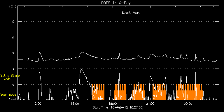 EIS Observation timeline overlay to GOES-Xray curve Code 1" 2" 40" 266" EIS Observations list for this event: STUDY ACRONYM ID DATE OBSERVED DESCRIPTION NOAA# TARGET 0 HH_Flare+AR_180x152 | 26008 | 2012/02/10 16:21:13 | Active Region Observation | 1417 | Flare TIMELINE ID DATE OBSERVED FITS FILE XCEN (+W/-E) YCEN (+N/-S) DUR ----------------------------------------------------------------------------------------------------------------- 26008 | 2012/02/10 16:21:13.000 | eis_l0_20120210_162113.fits.gz | -847.23 | 347.81 | 5m18s 26008 | 2012/02/10 16:26:34.000 | eis_l0_20120210_162634.fits.gz | -846.92 | 347.96 | 5m18s 26008 | 2012/02/10 16:31:55.000 | eis_l0_20120210_163155.fits.gz | -846.69 | 348.12 | 5m18s 26008 | 2012/02/10 16:37:16.000 | eis_l0_20120210_163716.fits.gz | -846.30 | 348.12 | 5m17s 26008 | 2012/02/10 16:42:36.000 | eis_l0_20120210_164236.fits.gz | -846.00 | 348.20 | 5m18s 26008 | 2012/02/10 16:47:57.000 | eis_l0_20120210_164757.fits.gz | -845.69 | 348.20 | 5m18s 26008 | 2012/02/10 16:53:18.000 | eis_l0_20120210_165318.fits.gz | -845.30 | 348.35 | 5m18s 26008 | 2012/02/10 16:58:38.000 | eis_l0_20120210_165838.fits.gz | -844.99 | 348.51 | 5m19s 26008 | 2012/02/10 17:04:00.000 | eis_l0_20120210_170400.fits.gz | -844.68 | 348.51 | 5m17s 26008 | 2012/02/10 17:09:20.000 | eis_l0_20120210_170920.fits.gz | -844.45 | 348.74 | 5m18s 26008 | 2012/02/10 17:14:41.000 | eis_l0_20120210_171441.fits.gz | -843.99 | 348.66 | 5m18s 1 HH_Flare+AR_180x152 | 26009 | 2012/02/10 18:07:44 | Active Region Observation | 1417 | Flare TIMELINE ID DATE OBSERVED FITS FILE XCEN (+W/-E) YCEN (+N/-S) DUR ----------------------------------------------------------------------------------------------------------------- 26009 | 2012/02/10 18:07:44.000 | eis_l0_20120210_180744.fits.gz | -840.82 | 349.51 | 5m18s 26009 | 2012/02/10 18:13:05.000 | eis_l0_20120210_181305.fits.gz | -840.51 | 349.66 | 5m18s 26009 | 2012/02/10 18:18:26.000 | eis_l0_20120210_181826.fits.gz | -840.20 | 349.74 | 5m19s 26009 | 2012/02/10 18:23:47.000 | eis_l0_20120210_182347.fits.gz | -839.89 | 349.89 | 5m18s 26009 | 2012/02/10 18:29:07.000 | eis_l0_20120210_182907.fits.gz | -839.59 | 349.89 | 5m18s 26009 | 2012/02/10 18:34:28.000 | eis_l0_20120210_183428.fits.gz | -839.20 | 349.97 | 5m18s 26009 | 2012/02/10 18:39:48.000 | eis_l0_20120210_183948.fits.gz | -838.81 | 349.89 | 5m18s 26009 | 2012/02/10 18:45:09.000 | eis_l0_20120210_184509.fits.gz | -838.58 | 350.13 | 5m18s 26009 | 2012/02/10 18:50:30.000 | eis_l0_20120210_185030.fits.gz | -838.19 | 350.20 | 5m18s 26009 | 2012/02/10 18:55:51.000 | eis_l0_20120210_185551.fits.gz | -837.89 | 350.28 | 5m17s 2 HH_Flare+AR_180x152 | 26010 | 2012/02/10 19:35:09 | Active Region Observation | 1417 | Flare TIMELINE ID DATE OBSERVED FITS FILE XCEN (+W/-E) YCEN (+N/-S) DUR ----------------------------------------------------------------------------------------------------------------- 26010 | 2012/02/10 19:35:09.000 | eis_l0_20120210_193509.fits.gz | -835.41 | 350.90 | 5m17s 26010 | 2012/02/10 19:40:29.000 | eis_l0_20120210_194029.fits.gz | -835.10 | 351.05 | 5m18s 26010 | 2012/02/10 19:45:50.000 | eis_l0_20120210_194550.fits.gz | -834.72 | 351.05 | 5m17s 26010 | 2012/02/10 19:51:10.000 | eis_l0_20120210_195110.fits.gz | -834.41 | 351.05 | 5m18s 26010 | 2012/02/10 19:56:31.000 | eis_l0_20120210_195631.fits.gz | -834.10 | 351.21 | 5m17s 26010 | 2012/02/10 20:01:51.000 | eis_l0_20120210_200151.fits.gz | -833.64 | 351.36 | 5m18s 26010 | 2012/02/10 20:07:12.000 | eis_l0_20120210_200712.fits.gz | -833.33 | 351.36 | 5m18s 26010 | 2012/02/10 20:12:33.000 | eis_l0_20120210_201233.fits.gz | -833.02 | 351.44 | 5m17s 26010 | 2012/02/10 20:17:53.000 | eis_l0_20120210_201753.fits.gz | -832.63 | 351.67 | 5m17s 26010 | 2012/02/10 20:23:13.000 | eis_l0_20120210_202313.fits.gz | -832.32 | 351.60 | 5m18s 26010 | 2012/02/10 20:28:34.000 | eis_l0_20120210_202834.fits.gz | -831.94 | 351.67 | 5m18s 3 HH_Flare+AR_180x152 | 26011 | 2012/02/10 21:11:43 | Active Region Observation | 1417 | Flare TIMELINE ID DATE OBSERVED FITS FILE XCEN (+W/-E) YCEN (+N/-S) DUR ----------------------------------------------------------------------------------------------------------------- 26011 | 2012/02/10 21:11:43.000 | eis_l0_20120210_211143.fits.gz | -829.16 | 352.44 | 5m17s 26011 | 2012/02/10 21:17:03.000 | eis_l0_20120210_211703.fits.gz | -828.85 | 352.52 | 5m17s 26011 | 2012/02/10 21:22:23.000 | eis_l0_20120210_212223.fits.gz | -828.46 | 352.60 | 5m18s 26011 | 2012/02/10 21:27:44.000 | eis_l0_20120210_212744.fits.gz | -828.15 | 352.68 | 5m18s 26011 | 2012/02/10 21:33:05.000 | eis_l0_20120210_213305.fits.gz | -827.69 | 352.68 | 5m17s 26011 | 2012/02/10 21:38:25.000 | eis_l0_20120210_213825.fits.gz | -827.46 | 352.91 | 5m18s 26011 | 2012/02/10 21:43:45.000 | eis_l0_20120210_214345.fits.gz | -826.99 | 352.91 | 5m19s 26011 | 2012/02/10 21:49:06.000 | eis_l0_20120210_214906.fits.gz | -826.68 | 352.98 | 5m18s 26011 | 2012/02/10 21:54:26.000 | eis_l0_20120210_215426.fits.gz | -826.38 | 353.06 | 5m19s 26011 | 2012/02/10 21:59:48.000 | eis_l0_20120210_215948.fits.gz | -825.91 | 353.06 | 5m17s 26011 | 2012/02/10 22:05:08.000 | eis_l0_20120210_220508.fits.gz | -825.60 | 353.22 | 5m18s 26011 | 2012/02/10 22:10:29.000 | eis_l0_20120210_221029.fits.gz | -825.29 | 353.29 | 5m18s 4 HH_Flare+AR_180x152 | 26012 | 2012/02/10 23:03:14 | Active Region Observation | 1417 | Flare TIMELINE ID DATE OBSERVED FITS FILE XCEN (+W/-E) YCEN (+N/-S) DUR ----------------------------------------------------------------------------------------------------------------- 26012 | 2012/02/10 23:03:14.000 | eis_l0_20120210_230314.fits.gz | -821.74 | 354.14 | 5m19s 26012 | 2012/02/10 23:08:35.000 | eis_l0_20120210_230835.fits.gz | -821.35 | 354.22 | 5m19s 26012 | 2012/02/10 23:13:57.000 | eis_l0_20120210_231357.fits.gz | -821.04 | 354.30 | 5m17s 26012 | 2012/02/10 23:19:17.000 | eis_l0_20120210_231917.fits.gz | -820.66 | 354.38 | 5m18s 26012 | 2012/02/10 23:24:38.000 | eis_l0_20