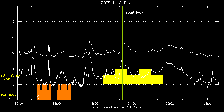 EIS Observation timeline overlay to GOES-Xray curve Code 1" 2" 40" 266" EIS Observations list for this event: STUDY ACRONYM ID DATE OBSERVED DESCRIPTION NOAA# TARGET 0 HH_Flare_180x152f | 27088 | 2012/05/11 13:26:13 | Fast Scan Flare Observations of AR 114 | | Flare TIMELINE ID DATE OBSERVED FITS FILE XCEN (+W/-E) YCEN (+N/-S) DUR ----------------------------------------------------------------------------------------------------------------- 27088 | 2012/05/11 13:26:13.000 | eis_l0_20120511_132613.fits.gz | -36.60 | 217.11 | 2m47s 27088 | 2012/05/11 13:29:03.000 | eis_l0_20120511_132903.fits.gz | -36.13 | 217.03 | 2m47s 27088 | 2012/05/11 13:31:53.000 | eis_l0_20120511_133153.fits.gz | -35.75 | 217.03 | 2m48s 27088 | 2012/05/11 13:34:44.000 | eis_l0_20120511_133444.fits.gz | -35.36 | 217.11 | 2m47s 27088 | 2012/05/11 13:37:34.000 | eis_l0_20120511_133734.fits.gz | -34.82 | 217.11 | 2m48s 27088 | 2012/05/11 13:40:24.000 | eis_l0_20120511_134024.fits.gz | -34.43 | 217.03 | 2m48s 27088 | 2012/05/11 13:43:15.000 | eis_l0_20120511_134315.fits.gz | -34.05 | 217.03 | 2m48s 27088 | 2012/05/11 13:46:05.000 | eis_l0_20120511_134605.fits.gz | -33.58 | 217.03 | 2m47s 27088 | 2012/05/11 13:48:55.000 | eis_l0_20120511_134855.fits.gz | -33.20 | 216.95 | 2m48s 27088 | 2012/05/11 13:51:46.000 | eis_l0_20120511_135146.fits.gz | -32.73 | 216.95 | 2m47s 27088 | 2012/05/11 13:54:36.000 | eis_l0_20120511_135436.fits.gz | -32.35 | 216.88 | 2m48s 27088 | 2012/05/11 13:57:27.000 | eis_l0_20120511_135727.fits.gz | -31.96 | 216.88 | 2m48s 27088 | 2012/05/11 14:00:17.000 | eis_l0_20120511_140017.fits.gz | -31.42 | 216.95 | 2m48s 27088 | 2012/05/11 14:03:08.000 | eis_l0_20120511_140308.fits.gz | -31.03 | 216.95 | 2m48s 27088 | 2012/05/11 14:05:59.000 | eis_l0_20120511_140559.fits.gz | -30.57 | 216.95 | 2m49s 27088 | 2012/05/11 14:08:50.000 | eis_l0_20120511_140850.fits.gz | -30.18 | 216.95 | 2m49s 27088 | 2012/05/11 14:11:42.000 | eis_l0_20120511_141142.fits.gz | -29.72 | 216.88 | 2m47s 27088 | 2012/05/11 14:14:32.000 | eis_l0_20120511_141432.fits.gz | -29.41 | 216.88 | 2m47s 27088 | 2012/05/11 14:17:22.000 | eis_l0_20120511_141722.fits.gz | -28.87 | 216.88 | 2m48s 27088 | 2012/05/11 14:20:13.000 | eis_l0_20120511_142013.fits.gz | -28.41 | 216.80 | 2m48s 27088 | 2012/05/11 14:23:03.000 | eis_l0_20120511_142303.fits.gz | -28.02 | 216.88 | 2m48s 27088 | 2012/05/11 14:25:53.000 | eis_l0_20120511_142553.fits.gz | -27.48 | 216.95 | 2m48s 27088 | 2012/05/11 14:28:44.000 | eis_l0_20120511_142844.fits.gz | -27.17 | 216.95 | 2m48s 1 HH_Flare_180x152f | 27089 | 2012/05/11 15:05:13 | Fast Scan Flare Observations of AR 114 | | Flare TIMELINE ID DATE OBSERVED FITS FILE XCEN (+W/-E) YCEN (+N/-S) DUR ----------------------------------------------------------------------------------------------------------------- 27089 | 2012/05/11 15:05:13.000 | eis_l0_20120511_150513.fits.gz | -21.69 | 217.11 | 2m48s 27089 | 2012/05/11 15:08:04.000 | eis_l0_20120511_150804.fits.gz | -21.22 | 216.95 | 2m48s 27089 | 2012/05/11 15:10:55.000 | eis_l0_20120511_151055.fits.gz | -20.76 | 216.88 | 2m48s 27089 | 2012/05/11 15:13:46.000 | eis_l0_20120511_151346.fits.gz | -20.37 | 216.88 | 2m47s 27089 | 2012/05/11 15:16:36.000 | eis_l0_20120511_151636.fits.gz | -19.91 | 216.95 | 2m48s 27089 | 2012/05/11 15:19:27.000 | eis_l0_20120511_151927.fits.gz | -19.45 | 216.88 | 2m48s 27089 | 2012/05/11 15:22:18.000 | eis_l0_20120511_152218.fits.gz | -19.06 | 216.88 | 2m47s 27089 | 2012/05/11 15:25:08.000 | eis_l0_20120511_152508.fits.gz | -18.67 | 216.80 | 2m47s 27089 | 2012/05/11 15:27:58.000 | eis_l0_20120511_152758.fits.gz | -18.13 | 216.88 | 2m48s 27089 | 2012/05/11 15:30:49.000 | eis_l0_20120511_153049.fits.gz | -17.75 | 216.72 | 2m47s 27089 | 2012/05/11 15:33:39.000 | eis_l0_20120511_153339.fits.gz | -17.36 | 216.88 | 2m48s 27089 | 2012/05/11 15:36:30.000 | eis_l0_20120511_153630.fits.gz | -16.97 | 216.88 | 2m48s 27089 | 2012/05/11 15:39:21.000 | eis_l0_20120511_153921.fits.gz | -16.51 | 216.72 | 2m47s 27089 | 2012/05/11 15:42:11.000 | eis_l0_20120511_154211.fits.gz | -16.13 | 216.80 | 2m47s 27089 | 2012/05/11 15:45:01.000 | eis_l0_20120511_154501.fits.gz | -15.66 | 216.80 | 2m48s 27089 | 2012/05/11 15:47:51.000 | eis_l0_20120511_154751.fits.gz | -15.20 | 216.88 | 2m48s 27089 | 2012/05/11 15:50:42.000 | eis_l0_20120511_155042.fits.gz | -14.81 | 216.80 | 2m48s 27089 | 2012/05/11 15:53:33.000 | eis_l0_20120511_155333.fits.gz | -14.35 | 216.80 | 2m47s 27089 | 2012/05/11 15:56:23.000 | eis_l0_20120511_155623.fits.gz | -13.96 | 216.88 | 2m47s 27089 | 2012/05/11 15:59:13.000 | eis_l0_20120511_155913.fits.gz | -13.58 | 216.80 | 2m48s 27089 | 2012/05/11 16:02:03.000 | eis_l0_20120511_160203.fits.gz | -13.04 | 216.72 | 2m48s 27089 | 2012/05/11 16:04:54.000 | eis_l0_20120511_160454.fits.gz | -12.65 | 216.88 | 2m48s 27089 | 2012/05/11 16:07:44.000 | eis_l0_20120511_160744.fits.gz | -12.11 | 216.80 | 2m48s 2 regcal076 | 27095 | 2012/05/11 17:15:03 | Flatfield, 1 exposure, led 100ms, ccd | | Engineering TIMELINE ID DATE OBSERVED FITS FILE XCEN (+W/-E) YCEN (+N/-S) DUR ----------------------------------------------------------------------------------------------------------------- 27095 | 2012/05/11 17:15:03.000 | eis_l0_20120511_171503.fits.gz | 14.74 | 166.88 | 1s 3 Flare266_Hunter01 | 27091 | 2012/05/11 18:43:33 | Flare Hunting with the 266" Slot | 1476 | Flare TIMELINE ID DATE OBSERVED FITS FILE XCEN (+W/-E) YCEN (+N/-S) DUR ----------------------------------------------------------------------------------------------------------------- 27091 | 2012/05/11 18:43:33.000 | eis_l0_20120511_184333.fits.gz | -80.50 | 176.24 | 56m22s 27091 | 2012/05/11 19:40:47.000 | eis_l0_20120511_194047.fits.gz | -71.93 | 176.16 | 56m23s 27091 | 2012/05/11 20:38:02.000 | eis_l0_20120511_203802.fits.gz | -63.20 | 176.09 | 56m22s 27091 | 2012/05/11 21:35:16.000 | eis_l0_20120511_213516.fits.gz | -54.54 | 176.16 | 56m23s 27091 | 2012/05/11 22:32:31.000 | eis_l0_20120511_223231.fits.gz | -45.89
