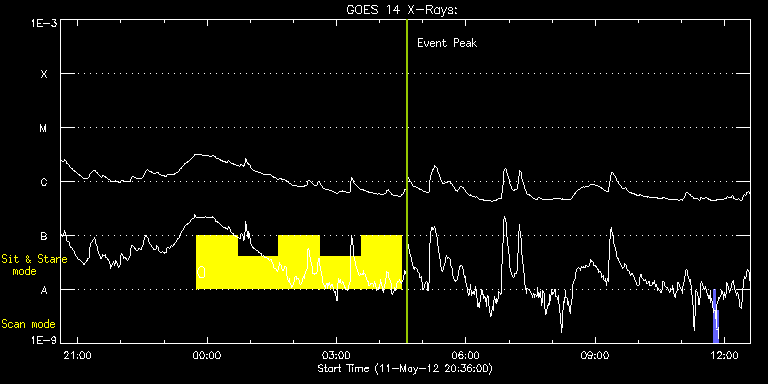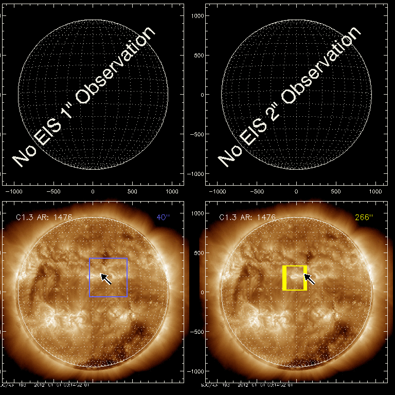 EIS Observation timeline overlay to GOES-Xray curve Code 1" 2" 40" 266" EIS Observations list for this event: STUDY ACRONYM ID DATE OBSERVED DESCRIPTION NOAA# TARGET 0 Flare266_Hunter01 | 27094 | 2012/05/11 23:45:13 | Flare Hunting with the 266" Slot | 1476 | Flare TIMELINE ID DATE OBSERVED FITS FILE XCEN (+W/-E) YCEN (+N/-S) DUR ----------------------------------------------------------------------------------------------------------------- 27094 | 2012/05/11 23:45:13.000 | eis_l0_20120511_234513.fits.gz | -34.85 | 175.62 | 56m21s 27094 | 2012/05/12 00:42:27.000 | eis_l0_20120512_004227.fits.gz | -26.12 | 175.62 | 56m22s 27094 | 2012/05/12 01:39:41.000 | eis_l0_20120512_013941.fits.gz | -17.47 | 175.47 | 56m22s 27094 | 2012/05/12 02:36:56.000 | eis_l0_20120512_023656.fits.gz | -8.81 | 175.39 | 56m22s 27094 | 2012/05/12 03:34:10.000 | eis_l0_20120512_033410.fits.gz | -0.09 | 175.16 | 56m23s 1 PRY_slot_context_v3 | 27181 | 2012/05/12 11:44:55 | slot raster obs. | 1476 | Active Region TIMELINE ID DATE OBSERVED FITS FILE XCEN (+W/-E) YCEN (+N/-S) DUR ----------------------------------------------------------------------------------------------------------------- 27181 | 2012/05/12 11:44:55.000 | eis_l0_20120512_114455.fits.gz | 194.90 | 181.80 | 2m56s 27181 | 2012/05/12 11:47:55.000 | eis_l0_20120512_114755.fits.gz | 195.29 | 181.80 | 2m57s : Check study information : Download file : View thumbnails For this event, also check for:
