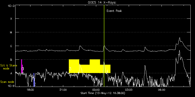 EIS Observation timeline overlay to GOES-Xray curve Code 1" 2" 40" 266" EIS Observations list for this event: STUDY ACRONYM ID DATE OBSERVED DESCRIPTION NOAA# TARGET 0 regcal071 | 27096 | 2012/05/13 17:10:11 | Dark exposures, CCD bottom rows (100s | | Engineering TIMELINE ID DATE OBSERVED FITS FILE XCEN (+W/-E) YCEN (+N/-S) DUR ----------------------------------------------------------------------------------------------------------------- 27096 | 2012/05/13 17:10:11.000 | eis_l0_20120513_171011.fits.gz | 474.37 | -130.30 | 3m22s 1 regcal072 | 27097 | 2012/05/13 17:15:11 | Dark exposures, top CCD rows (100s exp | | Engineering TIMELINE ID DATE OBSERVED FITS FILE XCEN (+W/-E) YCEN (+N/-S) DUR ----------------------------------------------------------------------------------------------------------------- 27097 | 2012/05/13 17:15:11.000 | eis_l0_20120513_171511.fits.gz | 474.98 | 380.77 | 3m22s 2 PRY_slot_context_v3 | 27195 | 2012/05/13 18:18:21 | slot obs for coalignment with XRT, AIA | | Active Region TIMELINE ID DATE OBSERVED FITS FILE XCEN (+W/-E) YCEN (+N/-S) DUR ----------------------------------------------------------------------------------------------------------------- 27195 | 2012/05/13 18:18:21.000 | eis_l0_20120513_181821.fits.gz | -15.21 | -0.58 | 2m56s 27195 | 2012/05/13 18:21:21.000 | eis_l0_20120513_182121.fits.gz | -15.29 | -0.50 | 2m56s 3 FLARE266_TEST2 | 27189 | 2012/05/13 21:31:43 | XRT FT obs. | 1476 | Active Region TIMELINE ID DATE OBSERVED FITS FILE XCEN (+W/-E) YCEN (+N/-S) DUR ----------------------------------------------------------------------------------------------------------------- 27189 | 2012/05/13 21:31:43.000 | eis_l0_20120513_213143.fits.gz | 361.51 | 123.46 | 56m1s 27189 | 2012/05/13 22:28:35.000 | eis_l0_20120513_222835.fits.gz | 368.85 | 123.15 | 56m 27189 | 2012/05/13 23:25:27.000 | eis_l0_20120513_232527.fits.gz | 376.11 | 122.84 | 56m 27189 | 2012/05/14 00:22:19.000 | eis_l0_20120514_002219.fits.gz | 383.37 | 122.54 | 56m : Check study information : Download file : View thumbnails For this event, also check for: