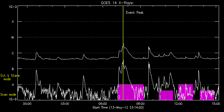 EIS Observation timeline overlay to GOES-Xray curve Code 1" 2" 40" 266" EIS Observations list for this event: STUDY ACRONYM ID DATE OBSERVED DESCRIPTION NOAA# TARGET 0 HPW021_VEL_240x512v1 | 27197 | 2012/05/14 07:09:51 | AR obs. | 1476 | Active Region TIMELINE ID DATE OBSERVED FITS FILE XCEN (+W/-E) YCEN (+N/-S) DUR ----------------------------------------------------------------------------------------------------------------- 27197 | 2012/05/14 07:09:51.000 | eis_l0_20120514_070951.fits.gz | 566.22 | 170.37 | 2h3m48s 1 HPW022_VEL_480x512v1 | 27153 | 2012/05/14 10:26:51 | AR raster scan obs. | 1476 | Active Region TIMELINE ID DATE OBSERVED FITS FILE XCEN (+W/-E) YCEN (+N/-S) DUR ----------------------------------------------------------------------------------------------------------------- 27153 | 2012/05/14 10:26:51.000 | eis_l0_20120514_102651.fits.gz | 591.96 | 155.39 | 1h7m38s 2 HPW022_VEL_480x512v1 | 27177 | 2012/05/14 12:01:03 | AR raster scan obs. | 1476 | Active Region TIMELINE ID DATE OBSERVED FITS FILE XCEN (+W/-E) YCEN (+N/-S) DUR ----------------------------------------------------------------------------------------------------------------- 27177 | 2012/05/14 12:01:03.000 | eis_l0_20120514_120103.fits.gz | 602.93 | 154.92 | 1h7m38s 3 HPW022_VEL_480x512v1 | 27178 | 2012/05/14 13:43:03 | AR raster scan obs. | 1476 | Active Region TIMELINE ID DATE OBSERVED FITS FILE XCEN (+W/-E) YCEN (+N/-S) DUR ----------------------------------------------------------------------------------------------------------------- 27178 | 2012/05/14 13:43:03.000 | eis_l0_20120514_134303.fits.gz | 614.90 | 154.23 | 1h7m38s : Check study information : Download file : View thumbnails For this event, also check for: