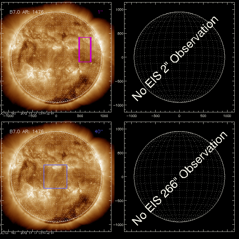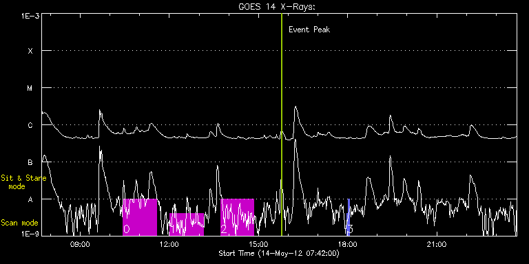 EIS Observation timeline overlay to GOES-Xray curve Code 1" 2" 40" 266" EIS Observations list for this event: STUDY ACRONYM ID DATE OBSERVED DESCRIPTION NOAA# TARGET 0 HPW022_VEL_480x512v1 | 27153 | 2012/05/14 10:26:51 | AR raster scan obs. | 1476 | Active Region TIMELINE ID DATE OBSERVED FITS FILE XCEN (+W/-E) YCEN (+N/-S) DUR ----------------------------------------------------------------------------------------------------------------- 27153 | 2012/05/14 10:26:51.000 | eis_l0_20120514_102651.fits.gz | 591.96 | 155.39 | 1h7m38s 1 HPW022_VEL_480x512v1 | 27177 | 2012/05/14 12:01:03 | AR raster scan obs. | 1476 | Active Region TIMELINE ID DATE OBSERVED FITS FILE XCEN (+W/-E) YCEN (+N/-S) DUR ----------------------------------------------------------------------------------------------------------------- 27177 | 2012/05/14 12:01:03.000 | eis_l0_20120514_120103.fits.gz | 602.93 | 154.92 | 1h7m38s 2 HPW022_VEL_480x512v1 | 27178 | 2012/05/14 13:43:03 | AR raster scan obs. | 1476 | Active Region TIMELINE ID DATE OBSERVED FITS FILE XCEN (+W/-E) YCEN (+N/-S) DUR ----------------------------------------------------------------------------------------------------------------- 27178 | 2012/05/14 13:43:03.000 | eis_l0_20120514_134303.fits.gz | 614.90 | 154.23 | 1h7m38s 3 PRY_slot_context_v3 | 27196 | 2012/05/14 17:58:33 | slot obs for coalignment with XRT, AIA | | Active Region TIMELINE ID DATE OBSERVED FITS FILE XCEN (+W/-E) YCEN (+N/-S) DUR ----------------------------------------------------------------------------------------------------------------- 27196 | 2012/05/14 17:58:33.000 | eis_l0_20120514_175833.fits.gz | -15.29 | -0.50 | 2m57s 27196 | 2012/05/14 18:01:34.000 | eis_l0_20120514_180134.fits.gz | -15.21 | -0.50 | 2m56s : Check study information : Download file : View thumbnails For this event, also check for: