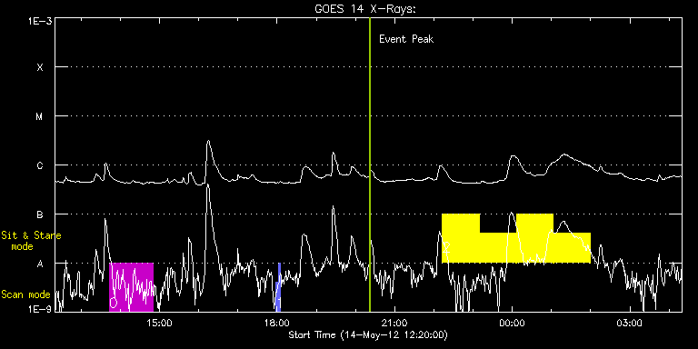 EIS Observation timeline overlay to GOES-Xray curve Code 1" 2" 40" 266" EIS Observations list for this event: STUDY ACRONYM ID DATE OBSERVED DESCRIPTION NOAA# TARGET 0 HPW022_VEL_480x512v1 | 27178 | 2012/05/14 13:43:03 | AR raster scan obs. | 1476 | Active Region TIMELINE ID DATE OBSERVED FITS FILE XCEN (+W/-E) YCEN (+N/-S) DUR ----------------------------------------------------------------------------------------------------------------- 27178 | 2012/05/14 13:43:03.000 | eis_l0_20120514_134303.fits.gz | 614.90 | 154.23 | 1h7m38s 1 PRY_slot_context_v3 | 27196 | 2012/05/14 17:58:33 | slot obs for coalignment with XRT, AIA | | Active Region TIMELINE ID DATE OBSERVED FITS FILE XCEN (+W/-E) YCEN (+N/-S) DUR ----------------------------------------------------------------------------------------------------------------- 27196 | 2012/05/14 17:58:33.000 | eis_l0_20120514_175833.fits.gz | -15.29 | -0.50 | 2m57s 27196 | 2012/05/14 18:01:34.000 | eis_l0_20120514_180134.fits.gz | -15.21 | -0.50 | 2m56s 2 FLARE266_TEST2 | 27190 | 2012/05/14 22:13:10 | XRT FT obs. | 1476 | Active Region TIMELINE ID DATE OBSERVED FITS FILE XCEN (+W/-E) YCEN (+N/-S) DUR ----------------------------------------------------------------------------------------------------------------- 27190 | 2012/05/14 22:13:10.000 | eis_l0_20120514_221310.fits.gz | 539.10 | 101.06 | 56m1s 27190 | 2012/05/14 23:10:03.000 | eis_l0_20120514_231003.fits.gz | 545.05 | 100.67 | 56m 27190 | 2012/05/15 00:06:54.000 | eis_l0_20120515_000654.fits.gz | 551.08 | 100.44 | 56m 27190 | 2012/05/15 01:03:46.000 | eis_l0_20120515_010346.fits.gz | 557.02 | 100.13 | 56m : Check study information : Download file : View thumbnails For this event, also check for: