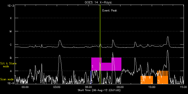 EIS Observation timeline overlay to GOES-Xray curve Code 1" 2" 40" 266" EIS Observations list for this event: STUDY ACRONYM ID DATE OBSERVED DESCRIPTION NOAA# TARGET 0 PRY_slot_contextLITE | 28765 | 2012/08/07 06:12:25 | Slot context for fan loop observations | 1535 | Active Region TIMELINE ID DATE OBSERVED FITS FILE XCEN (+W/-E) YCEN (+N/-S) DUR ----------------------------------------------------------------------------------------------------------------- 28765 | 2012/08/07 06:12:25.000 | eis_l0_20120807_061225.fits.gz | 431.28 | 202.97 | 2m57s 1 HPW021_VEL_001x512v1 | 28756 | 2012/08/07 06:16:18 | Observations of fan loops (Wang) | | Active Region TIMELINE ID DATE OBSERVED FITS FILE XCEN (+W/-E) YCEN (+N/-S) DUR ----------------------------------------------------------------------------------------------------------------- 28756 | 2012/08/07 06:16:18.000 | eis_l0_20120807_061618.fits.gz | 522.60 | 206.82 | 56m43s 28756 | 2012/08/07 07:13:08.000 | eis_l0_20120807_071308.fits.gz | 529.62 | 207.36 | 56m43s 28756 | 2012/08/07 08:09:58.000 | eis_l0_20120807_080958.fits.gz | 536.58 | 207.66 | 56m43s 2 GDZ_300x384_S2S3_40 | 28786 | 2012/08/07 10:55:27 | Long term evolution of AR (Mason). | 1543 | Active Region TIMELINE ID DATE OBSERVED FITS FILE XCEN (+W/-E) YCEN (+N/-S) DUR ----------------------------------------------------------------------------------------------------------------- 28786 | 2012/08/07 10:55:27.000 | eis_l0_20120807_105527.fits.gz | -700.83 | 169.12 | 1h10m8s 3 HH_Flare_162x152 | 28821 | 2012/08/07 12:30:41 | Observations of flaring limb region. | | Flare TIMELINE ID DATE OBSERVED FITS FILE XCEN (+W/-E) YCEN (+N/-S) DUR ----------------------------------------------------------------------------------------------------------------- 28821 | 2012/08/07 12:30:41.000 | eis_l0_20120807_123041.fits.gz | -9870.45 | -9963.20 | 4m10s 28821 | 2012/08/07 12:34:54.000 | eis_l0_20120807_123454.fits.gz | -9870.45 | -9963.20 | 4m10s 28821 | 2012/08/07 12:39:07.000 | eis_l0_20120807_123907.fits.gz | -9870.45 | -9963.20 | 4m11s 28821 | 2012/08/07 12:43:21.000 | eis_l0_20120807_124321.fits.gz | -9870.45 | -9963.20 | 4m10s 28821 | 2012/08/07 12:47:34.000 | eis_l0_20120807_124734.fits.gz | -9870.45 | -9963.20 | 4m11s 28821 | 2012/08/07 12:51:48.000 | eis_l0_20120807_125148.fits.gz | -9870.45 | -9963.20 | 4m11s 28821 | 2012/08/07 12:56:01.000 | eis_l0_20120807_125601.fits.gz | -9870.45 | -9963.20 | 4m11s 28821 | 2012/08/07 13:00:14.000 | eis_l0_20120807_130014.fits.gz | -9870.45 | -9963.20 | 4m11s 28821 | 2012/08/07 13:04:28.000 | eis_l0_20120807_130428.fits.gz | -9870.45 | -9963.20 | 4m10s 28821 | 2012/08/07 13:08:41.000 | eis_l0_20120807_130841.fits.gz | -9870.45 | -9963.20 | 4m11s 28821 | 2012/08/07 13:12:55.000 | eis_l0_20120807_131255.fits.gz | -9870.45 | -9963.20 | 4m10s 28821 | 2012/08/07 13:17:08.000 | eis_l0_20120807_131708.fits.gz | -9870.45 | -9963.20 | 4m6s 28821 | 2012/08/07 13:21:21.000 | eis_l0_20120807_132121.fits.gz | -9870.45 | -9963.20 | 4m11s 28821 | 2012/08/07 13:25:35.000 | eis_l0_20120807_132535.fits.gz | -9870.45 | -9963.20 | 4m10s 28821 | 2012/08/07 13:29:48.000 | eis_l0_20120807_132948.fits.gz | -9870.45 | -9963.20 | 2m38s : Check study information : Download file : View thumbnails For this event, also check for: