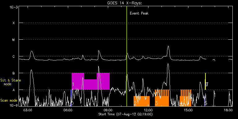 EIS Observation timeline overlay to GOES-Xray curve Code 1" 2" 40" 266" EIS Observations list for this event: STUDY ACRONYM ID DATE OBSERVED DESCRIPTION NOAA# TARGET 0 PRY_slot_contextLITE | 28765 | 2012/08/07 06:12:25 | Slot context for fan loop observations | 1535 | Active Region TIMELINE ID DATE OBSERVED FITS FILE XCEN (+W/-E) YCEN (+N/-S) DUR ----------------------------------------------------------------------------------------------------------------- 28765 | 2012/08/07 06:12:25.000 | eis_l0_20120807_061225.fits.gz | 431.28 | 202.97 | 2m57s 1 HPW021_VEL_001x512v1 | 28756 | 2012/08/07 06:16:18 | Observations of fan loops (Wang) | | Active Region TIMELINE ID DATE OBSERVED FITS FILE XCEN (+W/-E) YCEN (+N/-S) DUR ----------------------------------------------------------------------------------------------------------------- 28756 | 2012/08/07 06:16:18.000 | eis_l0_20120807_061618.fits.gz | 522.60 | 206.82 | 56m43s 28756 | 2012/08/07 07:13:08.000 | eis_l0_20120807_071308.fits.gz | 529.62 | 207.36 | 56m43s 28756 | 2012/08/07 08:09:58.000 | eis_l0_20120807_080958.fits.gz | 536.58 | 207.66 | 56m43s 2 GDZ_300x384_S2S3_40 | 28786 | 2012/08/07 10:55:27 | Long term evolution of AR (Mason). | 1543 | Active Region TIMELINE ID DATE OBSERVED FITS FILE XCEN (+W/-E) YCEN (+N/-S) DUR ----------------------------------------------------------------------------------------------------------------- 28786 | 2012/08/07 10:55:27.000 | eis_l0_20120807_105527.fits.gz | -700.83 | 169.12 | 1h10m8s 3 HH_Flare_162x152 | 28821 | 2012/08/07 12:30:41 | Observations of flaring limb region. | | Flare TIMELINE ID DATE OBSERVED FITS FILE XCEN (+W/-E) YCEN (+N/-S) DUR ----------------------------------------------------------------------------------------------------------------- 28821 | 2012/08/07 12:30:41.000 | eis_l0_20120807_123041.fits.gz | -9870.45 | -9963.20 | 4m10s 28821 | 2012/08/07 12:34:54.000 | eis_l0_20120807_123454.fits.gz | -9870.45 | -9963.20 | 4m10s 28821 | 2012/08/07 12:39:07.000 | eis_l0_20120807_123907.fits.gz | -9870.45 | -9963.20 | 4m11s 28821 | 2012/08/07 12:43:21.000 | eis_l0_20120807_124321.fits.gz | -9870.45 | -9963.20 | 4m10s 28821 | 2012/08/07 12:47:34.000 | eis_l0_20120807_124734.fits.gz | -9870.45 | -9963.20 | 4m11s 28821 | 2012/08/07 12:51:48.000 | eis_l0_20120807_125148.fits.gz | -9870.45 | -9963.20 | 4m11s 28821 | 2012/08/07 12:56:01.000 | eis_l0_20120807_125601.fits.gz | -9870.45 | -9963.20 | 4m11s 28821 | 2012/08/07 13:00:14.000 | eis_l0_20120807_130014.fits.gz | -9870.45 | -9963.20 | 4m11s 28821 | 2012/08/07 13:04:28.000 | eis_l0_20120807_130428.fits.gz | -9870.45 | -9963.20 | 4m10s 28821 | 2012/08/07 13:08:41.000 | eis_l0_20120807_130841.fits.gz | -9870.45 | -9963.20 | 4m11s 28821 | 2012/08/07 13:12:55.000 | eis_l0_20120807_131255.fits.gz | -9870.45 | -9963.20 | 4m10s 28821 | 2012/08/07 13:17:08.000 | eis_l0_20120807_131708.fits.gz | -9870.45 | -9963.20 | 4m6s 28821 | 2012/08/07 13:21:21.000 | eis_l0_20120807_132121.fits.gz | -9870.45 | -9963.20 | 4m11s 28821 | 2012/08/07 13:25:35.000 | eis_l0_20120807_132535.fits.gz | -9870.45 | -9963.20 | 4m10s 28821 | 2012/08/07 13:29:48.000 | eis_l0_20120807_132948.fits.gz | -9870.45 | -9963.20 | 2m38s 4 HH_Flare_162x152 | 28822 | 2012/08/07 14:22:11 | Observations of flaring limb region. | | Flare TIMELINE ID DATE OBSERVED FITS FILE XCEN (+W/-E) YCEN (+N/-S) DUR ----------------------------------------------------------------------------------------------------------------- 28822 | 2012/08/07 14:22:11.000 | eis_l0_20120807_142211.fits.gz | -9870.45 | -9963.20 | 4m10s 28822 | 2012/08/07 14:26:24.000 | eis_l0_20120807_142624.fits.gz | -9870.45 | -9963.20 | 4m11s 28822 | 2012/08/07 14:30:38.000 | eis_l0_20120807_143038.fits.gz | -9870.45 | -9963.20 | 4m10s 28822 | 2012/08/07 14:34:51.000 | eis_l0_20120807_143451.fits.gz | -9870.45 | -9963.20 | 4m11s 28822 | 2012/08/07 14:39:04.000 | eis_l0_20120807_143904.fits.gz | -9870.45 | -9963.20 | 4m12s 28822 | 2012/08/07 14:43:18.000 | eis_l0_20120807_144318.fits.gz | -9870.45 | -9963.20 | 4m11s 28822 | 2012/08/07 14:47:32.000 | eis_l0_20120807_144732.fits.gz | -9870.45 | -9963.20 | 4m10s 28822 | 2012/08/07 14:51:45.000 | eis_l0_20120807_145145.fits.gz | -9870.45 | -9963.20 | 4m11s 28822 | 2012/08/07 14:55:59.000 | eis_l0_20120807_145559.fits.gz | -9870.45 | -9963.20 | 4m10s 28822 | 2012/08/07 15:00:12.000 | eis_l0_20120807_150012.fits.gz | -9870.45 | -9963.20 | 4m11s 28822 | 2012/08/07 15:04:26.000 | eis_l0_20120807_150426.fits.gz | -9870.45 | -9963.20 | 4m10s 28822 | 2012/08/07 15:08:39.000 | eis_l0_20120807_150839.fits.gz | -9870.45 | -9963.20 | 4m11s 5 PRY_slot_contextLITE | 28787 | 2012/08/07 16:11:50 | Change of EIS pointing and alignment w | 1537 | Active Region TIMELINE ID DATE OBSERVED FITS FILE XCEN (+W/-E) YCEN (+N/-S) DUR ----------------------------------------------------------------------------------------------------------------- 28787 | 2012/08/07 16:11:50.000 | eis_l0_20120807_161150.fits.gz | -15.21 | -0.42 | 2m56s 6 Alignment_266 | 28788 | 2012/08/07 16:15:05 | Change of EIS pointing and alignment w | | Quiet Sun TIMELINE ID DATE OBSERVED FITS FILE XCEN (+W/-E) YCEN (+N/-S) DUR ----------------------------------------------------------------------------------------------------------------- 28788 | 2012/08/07 16:15:05.000 | eis_l0_20120807_161505.fits.gz | -132.49 | -0.42 | 1m22s 7 XRT_synop_AIA | 28789 | 2012/08/07 16:17:12 | Change of EIS pointing and alignment w | | Quiet Sun TIMELINE ID DATE OBSERVED FITS FILE XCEN (+W/-E) YCEN (+N/-S) DUR ----------------------------------------------------------------------------------------------------------------- 28789 | 2012/08/07 16:17:12.000 | eis_l0_20120807_161712.fits.gz | -132.57 | -0.42 | 10s : Check study information : Download file : View thumbnails For this event, also check for: