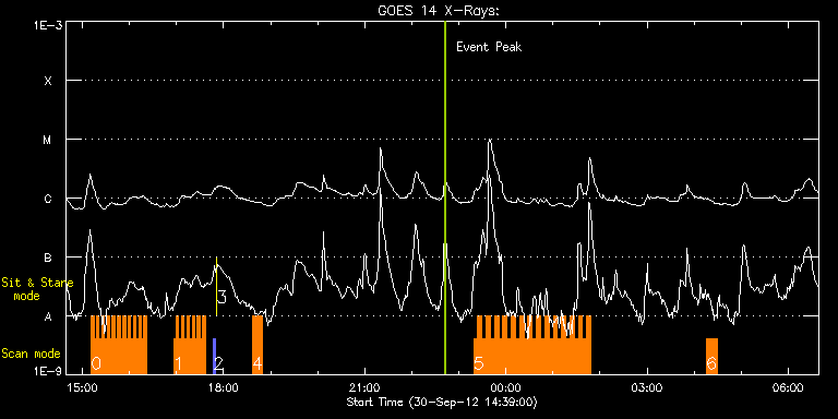 EIS Observation timeline overlay to GOES-Xray curve Code 1" 2" 40" 266" EIS Observations list for this event: STUDY ACRONYM ID DATE OBSERVED DESCRIPTION NOAA# TARGET 0 madj_ar_small | 29692 | 2012/09/30 15:11:13 | HOP215 | | Active Region TIMELINE ID DATE OBSERVED FITS FILE XCEN (+W/-E) YCEN (+N/-S) DUR ----------------------------------------------------------------------------------------------------------------- 29692 | 2012/09/30 15:11:13.000 | eis_l0_20120930_151113.fits.gz | 6.71 | -294.04 | 3m18s 29692 | 2012/09/30 15:14:34.000 | eis_l0_20120930_151434.fits.gz | 7.25 | -294.04 | 3m19s 29692 | 2012/09/30 15:17:56.000 | eis_l0_20120930_151756.fits.gz | 7.79 | -294.12 | 3m19s 29692 | 2012/09/30 15:21:18.000 | eis_l0_20120930_152118.fits.gz | 8.33 | -294.04 | 3m18s 29692 | 2012/09/30 15:24:39.000 | eis_l0_20120930_152439.fits.gz | 8.72 | -294.04 | 3m18s 29692 | 2012/09/30 15:28:00.000 | eis_l0_20120930_152800.fits.gz | 9.18 | -293.96 | 3m19s 29692 | 2012/09/30 15:31:22.000 | eis_l0_20120930_153122.fits.gz | 9.80 | -294.04 | 3m18s 29692 | 2012/09/30 15:34:43.000 | eis_l0_20120930_153443.fits.gz | 10.26 | -294.20 | 3m19s 29692 | 2012/09/30 15:38:05.000 | eis_l0_20120930_153805.fits.gz | 10.73 | -294.04 | 3m19s 29692 | 2012/09/30 15:41:27.000 | eis_l0_20120930_154127.fits.gz | 11.35 | -294.04 | 3m18s 29692 | 2012/09/30 15:44:48.000 | eis_l0_20120930_154448.fits.gz | 11.89 | -294.04 | 3m19s 29692 | 2012/09/30 15:48:10.000 | eis_l0_20120930_154810.fits.gz | 12.27 | -293.96 | 3m18s 29692 | 2012/09/30 15:51:31.000 | eis_l0_20120930_155131.fits.gz | 12.74 | -293.96 | 3m19s 29692 | 2012/09/30 15:54:53.000 | eis_l0_20120930_155453.fits.gz | 13.43 | -293.96 | 3m18s 29692 | 2012/09/30 15:58:14.000 | eis_l0_20120930_155814.fits.gz | 13.89 | -294.04 | 3m19s 29692 | 2012/09/30 16:01:36.000 | eis_l0_20120930_160136.fits.gz | 14.36 | -294.04 | 3m18s 29692 | 2012/09/30 16:04:57.000 | eis_l0_20120930_160457.fits.gz | 14.82 | -294.04 | 3m19s 29692 | 2012/09/30 16:08:19.000 | eis_l0_20120930_160819.fits.gz | 15.36 | -293.96 | 3m18s 29692 | 2012/09/30 16:11:40.000 | eis_l0_20120930_161140.fits.gz | 15.90 | -293.96 | 3m18s 29692 | 2012/09/30 16:15:01.000 | eis_l0_20120930_161501.fits.gz | 16.37 | -293.89 | 3m19s 29692 | 2012/09/30 16:18:23.000 | eis_l0_20120930_161823.fits.gz | 16.83 | -293.89 | 3m18s 1 madj_ar_small | 29714 | 2012/09/30 16:56:13 | HOP215 | | Active Region TIMELINE ID DATE OBSERVED FITS FILE XCEN (+W/-E) YCEN (+N/-S) DUR ----------------------------------------------------------------------------------------------------------------- 29714 | 2012/09/30 16:56:13.000 | eis_l0_20120930_165613.fits.gz | 14.71 | -293.96 | 3m18s 29714 | 2012/09/30 16:59:34.000 | eis_l0_20120930_165934.fits.gz | 15.25 | -293.96 | 3m19s 29714 | 2012/09/30 17:02:56.000 | eis_l0_20120930_170256.fits.gz | 15.72 | -293.96 | 3m18s 29714 | 2012/09/30 17:06:17.000 | eis_l0_20120930_170617.fits.gz | 16.18 | -293.96 | 3m19s 29714 | 2012/09/30 17:09:39.000 | eis_l0_20120930_170939.fits.gz | 16.72 | -293.89 | 3m19s 29714 | 2012/09/30 17:13:01.000 | eis_l0_20120930_171301.fits.gz | 17.19 | -294.04 | 3m18s 29714 | 2012/09/30 17:16:22.000 | eis_l0_20120930_171622.fits.gz | 17.65 | -293.96 | 3m19s 29714 | 2012/09/30 17:19:44.000 | eis_l0_20120930_171944.fits.gz | 18.27 | -293.96 | 3m18s 29714 | 2012/09/30 17:23:05.000 | eis_l0_20120930_172305.fits.gz | 18.81 | -293.96 | 3m19s 29714 | 2012/09/30 17:26:27.000 | eis_l0_20120930_172627.fits.gz | 19.35 | -294.04 | 3m19s 29714 | 2012/09/30 17:29:49.000 | eis_l0_20120930_172949.fits.gz | 19.73 | -294.04 | 3m19s 29714 | 2012/09/30 17:33:11.000 | eis_l0_20120930_173311.fits.gz | 20.35 | -293.96 | 3m18s 2 PRY_slot_contextLITE | 29687 | 2012/09/30 17:47:20 | XRT synoptic | | Active Region TIMELINE ID DATE OBSERVED FITS FILE XCEN (+W/-E) YCEN (+N/-S) DUR ----------------------------------------------------------------------------------------------------------------- 29687 | 2012/09/30 17:47:20.000 | eis_l0_20120930_174720.fits.gz | -15.21 | -0.50 | 2m56s 3 XRT_synop_AIA | 29683 | 2012/09/30 17:51:06 | XRT synoptic | 1579 | Quiet Sun TIMELINE ID DATE OBSERVED FITS FILE XCEN (+W/-E) YCEN (+N/-S) DUR ----------------------------------------------------------------------------------------------------------------- 29683 | 2012/09/30 17:51:06.000 | eis_l0_20120930_175106.fits.gz | -132.49 | -0.50 | 10s 4 HH_AR+FLR_RAS_N03 | 29700 | 2012/09/30 18:36:19 | AR observation | 1582 | Active Region TIMELINE ID DATE OBSERVED FITS FILE XCEN (+W/-E) YCEN (+N/-S) DUR ----------------------------------------------------------------------------------------------------------------- 29700 | 2012/09/30 18:36:19.000 | eis_l0_20120930_183619.fits.gz | -438.15 | -322.47 | 13m19s 5 HH_Flare+AR_180x152 | 29709 | 2012/09/30 23:18:40 | AR observation | 1582 | Flare TIMELINE ID DATE OBSERVED FITS FILE XCEN (+W/-E) YCEN (+N/-S) DUR ----------------------------------------------------------------------------------------------------------------- 29709 | 2012/09/30 23:18:40.000 | eis_l0_20120930_231840.fits.gz | -401.00 | -324.09 | 5m17s 29709 | 2012/09/30 23:24:00.000 | eis_l0_20120930_232400.fits.gz | -400.23 | -324.17 | 5m18s 29709 | 2012/09/30 23:29:21.000 | eis_l0_20120930_232921.fits.gz | -399.45 | -324.17 | 5m18s 29709 | 2012/09/30 23:34:42.000 | eis_l0_20120930_233442.fits.gz | -398.76 | -324.17 | 5m18s 29709 | 2012/09/30 23:40:03.000 | eis_l0_20120930_234003.fits.gz | -397.99 | -324.17 | 5m18s 29709 | 2012/09/30 23:45:23.000 | eis_l0_20120930_234523.fits.gz | -397.21 | -324.24 | 5m19s 29709 | 2012/09/30 23:50:45.000 | eis_l0_20120930_235045.fits.gz | -396.44 | -324.24 | 5m18s 29709 | 2012/09/30 23:56:06.000 | eis_l0_20120930_235606.fits.gz | -395.75 | -324.24 | 5m17s 29709 | 2012/10/01 00:01:26.000 | eis_l0_20121001_000126.fits.gz | -394.90 | -324.40 | 5m17s 29709 | 2012/10/01 00:06:46.000 | eis_l0_20121001_000646.fits.gz | -394.28 | -324.32 | 5m19s 29709 | 2012/10/01 00:12:07.000 | eis_l0_20121001_001207.fits.gz | -3