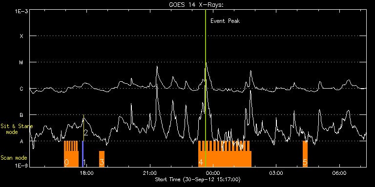 EIS Observation timeline overlay to GOES-Xray curve Code 1" 2" 40" 266" EIS Observations list for this event: STUDY ACRONYM ID DATE OBSERVED DESCRIPTION NOAA# TARGET 0 madj_ar_small | 29714 | 2012/09/30 16:56:13 | HOP215 | | Active Region TIMELINE ID DATE OBSERVED FITS FILE XCEN (+W/-E) YCEN (+N/-S) DUR ----------------------------------------------------------------------------------------------------------------- 29714 | 2012/09/30 16:56:13.000 | eis_l0_20120930_165613.fits.gz | 14.71 | -293.96 | 3m18s 29714 | 2012/09/30 16:59:34.000 | eis_l0_20120930_165934.fits.gz | 15.25 | -293.96 | 3m19s 29714 | 2012/09/30 17:02:56.000 | eis_l0_20120930_170256.fits.gz | 15.72 | -293.96 | 3m18s 29714 | 2012/09/30 17:06:17.000 | eis_l0_20120930_170617.fits.gz | 16.18 | -293.96 | 3m19s 29714 | 2012/09/30 17:09:39.000 | eis_l0_20120930_170939.fits.gz | 16.72 | -293.89 | 3m19s 29714 | 2012/09/30 17:13:01.000 | eis_l0_20120930_171301.fits.gz | 17.19 | -294.04 | 3m18s 29714 | 2012/09/30 17:16:22.000 | eis_l0_20120930_171622.fits.gz | 17.65 | -293.96 | 3m19s 29714 | 2012/09/30 17:19:44.000 | eis_l0_20120930_171944.fits.gz | 18.27 | -293.96 | 3m18s 29714 | 2012/09/30 17:23:05.000 | eis_l0_20120930_172305.fits.gz | 18.81 | -293.96 | 3m19s 29714 | 2012/09/30 17:26:27.000 | eis_l0_20120930_172627.fits.gz | 19.35 | -294.04 | 3m19s 29714 | 2012/09/30 17:29:49.000 | eis_l0_20120930_172949.fits.gz | 19.73 | -294.04 | 3m19s 29714 | 2012/09/30 17:33:11.000 | eis_l0_20120930_173311.fits.gz | 20.35 | -293.96 | 3m18s 1 PRY_slot_contextLITE | 29687 | 2012/09/30 17:47:20 | XRT synoptic | | Active Region TIMELINE ID DATE OBSERVED FITS FILE XCEN (+W/-E) YCEN (+N/-S) DUR ----------------------------------------------------------------------------------------------------------------- 29687 | 2012/09/30 17:47:20.000 | eis_l0_20120930_174720.fits.gz | -15.21 | -0.50 | 2m56s 2 XRT_synop_AIA | 29683 | 2012/09/30 17:51:06 | XRT synoptic | 1579 | Quiet Sun TIMELINE ID DATE OBSERVED FITS FILE XCEN (+W/-E) YCEN (+N/-S) DUR ----------------------------------------------------------------------------------------------------------------- 29683 | 2012/09/30 17:51:06.000 | eis_l0_20120930_175106.fits.gz | -132.49 | -0.50 | 10s 3 HH_AR+FLR_RAS_N03 | 29700 | 2012/09/30 18:36:19 | AR observation | 1582 | Active Region TIMELINE ID DATE OBSERVED FITS FILE XCEN (+W/-E) YCEN (+N/-S) DUR ----------------------------------------------------------------------------------------------------------------- 29700 | 2012/09/30 18:36:19.000 | eis_l0_20120930_183619.fits.gz | -438.15 | -322.47 | 13m19s 4 HH_Flare+AR_180x152 | 29709 | 2012/09/30 23:18:40 | AR observation | 1582 | Flare TIMELINE ID DATE OBSERVED FITS FILE XCEN (+W/-E) YCEN (+N/-S) DUR ----------------------------------------------------------------------------------------------------------------- 29709 | 2012/09/30 23:18:40.000 | eis_l0_20120930_231840.fits.gz | -401.00 | -324.09 | 5m17s 29709 | 2012/09/30 23:24:00.000 | eis_l0_20120930_232400.fits.gz | -400.23 | -324.17 | 5m18s 29709 | 2012/09/30 23:29:21.000 | eis_l0_20120930_232921.fits.gz | -399.45 | -324.17 | 5m18s 29709 | 2012/09/30 23:34:42.000 | eis_l0_20120930_233442.fits.gz | -398.76 | -324.17 | 5m18s 29709 | 2012/09/30 23:40:03.000 | eis_l0_20120930_234003.fits.gz | -397.99 | -324.17 | 5m18s 29709 | 2012/09/30 23:45:23.000 | eis_l0_20120930_234523.fits.gz | -397.21 | -324.24 | 5m19s 29709 | 2012/09/30 23:50:45.000 | eis_l0_20120930_235045.fits.gz | -396.44 | -324.24 | 5m18s 29709 | 2012/09/30 23:56:06.000 | eis_l0_20120930_235606.fits.gz | -395.75 | -324.24 | 5m17s 29709 | 2012/10/01 00:01:26.000 | eis_l0_20121001_000126.fits.gz | -394.90 | -324.40 | 5m17s 29709 | 2012/10/01 00:06:46.000 | eis_l0_20121001_000646.fits.gz | -394.28 | -324.32 | 5m19s 29709 | 2012/10/01 00:12:07.000 | eis_l0_20121001_001207.fits.gz | -393.43 | -324.40 | 5m18s 29709 | 2012/10/01 00:17:28.000 | eis_l0_20121001_001728.fits.gz | -392.66 | -324.40 | 5m18s 29709 | 2012/10/01 00:22:48.000 | eis_l0_20121001_002248.fits.gz | -391.96 | -324.32 | 5m19s 29709 | 2012/10/01 00:28:10.000 | eis_l0_20121001_002810.fits.gz | -391.19 | -324.48 | 5m17s 29709 | 2012/10/01 00:33:30.000 | eis_l0_20121001_003330.fits.gz | -390.42 | -324.48 | 5m18s 29709 | 2012/10/01 00:38:51.000 | eis_l0_20121001_003851.fits.gz | -389.64 | -324.48 | 5m18s 29709 | 2012/10/01 00:44:12.000 | eis_l0_20121001_004412.fits.gz | -388.87 | -324.55 | 5m18s 29709 | 2012/10/01 00:49:33.000 | eis_l0_20121001_004933.fits.gz | -388.18 | -324.55 | 5m18s 29709 | 2012/10/01 00:54:54.000 | eis_l0_20121001_005454.fits.gz | -387.25 | -324.55 | 5m18s 29709 | 2012/10/01 01:00:15.000 | eis_l0_20121001_010015.fits.gz | -386.63 | -324.55 | 5m18s 29709 | 2012/10/01 01:05:36.000 | eis_l0_20121001_010536.fits.gz | -385.94 | -324.63 | 5m18s 29709 | 2012/10/01 01:10:56.000 | eis_l0_20121001_011056.fits.gz | -385.24 | -324.63 | 5m18s 29709 | 2012/10/01 01:16:16.000 | eis_l0_20121001_011616.fits.gz | -384.39 | -324.71 | 5m18s 29709 | 2012/10/01 01:21:37.000 | eis_l0_20121001_012137.fits.gz | -383.62 | -324.86 | 5m18s 29709 | 2012/10/01 01:26:58.000 | eis_l0_20121001_012658.fits.gz | -382.85 | -324.94 | 5m18s 29709 | 2012/10/01 01:32:19.000 | eis_l0_20121001_013219.fits.gz | -382.15 | -324.79 | 5m18s 29709 | 2012/10/01 01:37:40.000 | eis_l0_20121001_013740.fits.gz | -381.30 | -324.79 | 5m18s 29709 | 2012/10/01 01:43:00.000 | eis_l0_20121001_014300.fits.gz | -380.53 | -324.94 | 5m18s 5 HH_AR+FLR_RAS_N03 | 29704 | 2012/10/01 04:15:40 | AR observation | 1582 | Active Region TIMELINE ID DATE OBSERVED FITS FILE XCEN (+W/-E) YCEN (+N/-S) DUR ----------------------------------------------------------------------------------------------------------------- 29704 | 2012/10/01 04:15:40.000 | eis_l0_20121001_041540.fits.gz | -356.75 | -325.64 | 13m18s : Check study information : Download file : View thumbnails For this event, also check for: