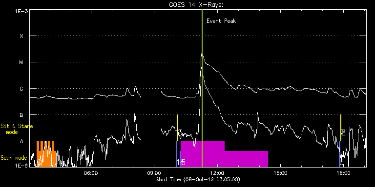 EIS Observation timeline overlay to GOES-Xray curve Code 1" 2" 40" 266" EIS Observations list for this event: STUDY ACRONYM ID DATE OBSERVED DESCRIPTION NOAA# TARGET 0 HH_Flare+AR_180x152 | 29855 | 2012/10/08 03:26:29 | AR and flare observation | | Flare TIMELINE ID DATE OBSERVED FITS FILE XCEN (+W/-E) YCEN (+N/-S) DUR ----------------------------------------------------------------------------------------------------------------- 29855 | 2012/10/08 03:26:29.000 | eis_l0_20121008_032629.fits.gz | 897.71 | -257.50 | 5m17s 29855 | 2012/10/08 03:31:49.000 | eis_l0_20121008_033149.fits.gz | 897.79 | -257.43 | 5m17s 29855 | 2012/10/08 03:37:09.000 | eis_l0_20121008_033709.fits.gz | 897.71 | -257.50 | 5m18s 29855 | 2012/10/08 03:42:30.000 | eis_l0_20121008_034230.fits.gz | 897.79 | -257.43 | 5m18s 29855 | 2012/10/08 03:47:51.000 | eis_l0_20121008_034751.fits.gz | 897.71 | -257.50 | 5m17s 29855 | 2012/10/08 03:53:11.000 | eis_l0_20121008_035311.fits.gz | 897.71 | -257.50 | 5m18s 29855 | 2012/10/08 03:58:32.000 | eis_l0_20121008_035832.fits.gz | 897.64 | -257.43 | 5m18s 29855 | 2012/10/08 04:03:53.000 | eis_l0_20121008_040353.fits.gz | 897.64 | -257.43 | 5m17s 29855 | 2012/10/08 04:09:13.000 | eis_l0_20121008_040913.fits.gz | 897.79 | -257.43 | 5m18s 29855 | 2012/10/08 04:14:34.000 | eis_l0_20121008_041434.fits.gz | 897.79 | -257.50 | 5m18s 1 PRY_slot_contextLITE | 29833 | 2012/10/08 10:02:19 | | | Active Region TIMELINE ID DATE OBSERVED FITS FILE XCEN (+W/-E) YCEN (+N/-S) DUR ----------------------------------------------------------------------------------------------------------------- 29833 | 2012/10/08 10:02:19.000 | eis_l0_20121008_100219.fits.gz | -15.29 | -0.35 | 2m56s 2 Alignment_266 | 29834 | 2012/10/08 10:05:33 | | | Quiet Sun TIMELINE ID DATE OBSERVED FITS FILE XCEN (+W/-E) YCEN (+N/-S) DUR ----------------------------------------------------------------------------------------------------------------- 29834 | 2012/10/08 10:05:33.000 | eis_l0_20121008_100533.fits.gz | -132.49 | -0.50 | 1m22s 3 XRT_synop_AIA | 29835 | 2012/10/08 10:07:41 | | | Quiet Sun TIMELINE ID DATE OBSERVED FITS FILE XCEN (+W/-E) YCEN (+N/-S) DUR ----------------------------------------------------------------------------------------------------------------- 29835 | 2012/10/08 10:07:41.000 | eis_l0_20121008_100741.fits.gz | -132.57 | -0.42 | 10s 4 PRY_slot_contextLITE | 29843 | 2012/10/08 10:13:17 | | | Active Region TIMELINE ID DATE OBSERVED FITS FILE XCEN (+W/-E) YCEN (+N/-S) DUR ----------------------------------------------------------------------------------------------------------------- 29843 | 2012/10/08 10:13:17.000 | eis_l0_20121008_101317.fits.gz | 818.73 | -84.50 | 2m56s 5 HPW021_VEL_240x512v1 | 29844 | 2012/10/08 10:16:25 | AR observation | | Active Region TIMELINE ID DATE OBSERVED FITS FILE XCEN (+W/-E) YCEN (+N/-S) DUR ----------------------------------------------------------------------------------------------------------------- 29844 | 2012/10/08 10:16:25.000 | eis_l0_20121008_101625.fits.gz | 899.70 | -257.43 | 2h3m48s 29844 | 2012/10/08 12:20:20.000 | eis_l0_20121008_122020.fits.gz | 899.70 | -257.43 | 2h3m48s 6 PRY_slot_contextLITE | 29836 | 2012/10/08 17:47:32 | | | Active Region TIMELINE ID DATE OBSERVED FITS FILE XCEN (+W/-E) YCEN (+N/-S) DUR ----------------------------------------------------------------------------------------------------------------- 29836 | 2012/10/08 17:47:32.000 | eis_l0_20121008_174732.fits.gz | -15.21 | -0.35 | 2m57s 7 Alignment_266 | 29837 | 2012/10/08 17:50:47 | | | Quiet Sun TIMELINE ID DATE OBSERVED FITS FILE XCEN (+W/-E) YCEN (+N/-S) DUR ----------------------------------------------------------------------------------------------------------------- 29837 | 2012/10/08 17:50:47.000 | eis_l0_20121008_175047.fits.gz | -132.57 | -0.50 | 1m22s 8 XRT_synop_AIA | 29838 | 2012/10/08 17:52:54 | | | Quiet Sun TIMELINE ID DATE OBSERVED FITS FILE XCEN (+W/-E) YCEN (+N/-S) DUR ----------------------------------------------------------------------------------------------------------------- 29838 | 2012/10/08 17:52:54.000 | eis_l0_20121008_175254.fits.gz | -132.57 | -0.42 | 10s : Check study information : Download file : View thumbnails For this event, also check for: