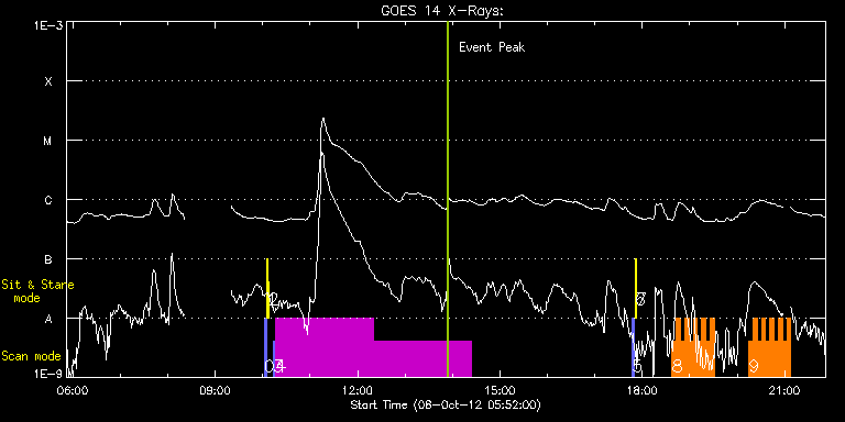 EIS Observation timeline overlay to GOES-Xray curve Code 1" 2" 40" 266" EIS Observations list for this event: STUDY ACRONYM ID DATE OBSERVED DESCRIPTION NOAA# TARGET 0 PRY_slot_contextLITE | 29833 | 2012/10/08 10:02:19 | | | Active Region TIMELINE ID DATE OBSERVED FITS FILE XCEN (+W/-E) YCEN (+N/-S) DUR ----------------------------------------------------------------------------------------------------------------- 29833 | 2012/10/08 10:02:19.000 | eis_l0_20121008_100219.fits.gz | -15.29 | -0.35 | 2m56s 1 Alignment_266 | 29834 | 2012/10/08 10:05:33 | | | Quiet Sun TIMELINE ID DATE OBSERVED FITS FILE XCEN (+W/-E) YCEN (+N/-S) DUR ----------------------------------------------------------------------------------------------------------------- 29834 | 2012/10/08 10:05:33.000 | eis_l0_20121008_100533.fits.gz | -132.49 | -0.50 | 1m22s 2 XRT_synop_AIA | 29835 | 2012/10/08 10:07:41 | | | Quiet Sun TIMELINE ID DATE OBSERVED FITS FILE XCEN (+W/-E) YCEN (+N/-S) DUR ----------------------------------------------------------------------------------------------------------------- 29835 | 2012/10/08 10:07:41.000 | eis_l0_20121008_100741.fits.gz | -132.57 | -0.42 | 10s 3 PRY_slot_contextLITE | 29843 | 2012/10/08 10:13:17 | | | Active Region TIMELINE ID DATE OBSERVED FITS FILE XCEN (+W/-E) YCEN (+N/-S) DUR ----------------------------------------------------------------------------------------------------------------- 29843 | 2012/10/08 10:13:17.000 | eis_l0_20121008_101317.fits.gz | 818.73 | -84.50 | 2m56s 4 HPW021_VEL_240x512v1 | 29844 | 2012/10/08 10:16:25 | AR observation | | Active Region TIMELINE ID DATE OBSERVED FITS FILE XCEN (+W/-E) YCEN (+N/-S) DUR ----------------------------------------------------------------------------------------------------------------- 29844 | 2012/10/08 10:16:25.000 | eis_l0_20121008_101625.fits.gz | 899.70 | -257.43 | 2h3m48s 29844 | 2012/10/08 12:20:20.000 | eis_l0_20121008_122020.fits.gz | 899.70 | -257.43 | 2h3m48s 5 PRY_slot_contextLITE | 29836 | 2012/10/08 17:47:32 | | | Active Region TIMELINE ID DATE OBSERVED FITS FILE XCEN (+W/-E) YCEN (+N/-S) DUR ----------------------------------------------------------------------------------------------------------------- 29836 | 2012/10/08 17:47:32.000 | eis_l0_20121008_174732.fits.gz | -15.21 | -0.35 | 2m57s 6 Alignment_266 | 29837 | 2012/10/08 17:50:47 | | | Quiet Sun TIMELINE ID DATE OBSERVED FITS FILE XCEN (+W/-E) YCEN (+N/-S) DUR ----------------------------------------------------------------------------------------------------------------- 29837 | 2012/10/08 17:50:47.000 | eis_l0_20121008_175047.fits.gz | -132.57 | -0.50 | 1m22s 7 XRT_synop_AIA | 29838 | 2012/10/08 17:52:54 | | | Quiet Sun TIMELINE ID DATE OBSERVED FITS FILE XCEN (+W/-E) YCEN (+N/-S) DUR ----------------------------------------------------------------------------------------------------------------- 29838 | 2012/10/08 17:52:54.000 | eis_l0_20121008_175254.fits.gz | -132.57 | -0.42 | 10s 8 HH_Flare+AR_180x152 | 29845 | 2012/10/08 18:37:53 | AR and flare observation | | Flare TIMELINE ID DATE OBSERVED FITS FILE XCEN (+W/-E) YCEN (+N/-S) DUR ----------------------------------------------------------------------------------------------------------------- 29845 | 2012/10/08 18:37:53.000 | eis_l0_20121008_183753.fits.gz | 147.79 | -431.70 | 5m17s 29845 | 2012/10/08 18:43:13.000 | eis_l0_20121008_184313.fits.gz | 148.57 | -431.70 | 5m17s 29845 | 2012/10/08 18:48:33.000 | eis_l0_20121008_184833.fits.gz | 149.34 | -431.54 | 5m17s 29845 | 2012/10/08 18:53:53.000 | eis_l0_20121008_185353.fits.gz | 150.11 | -431.70 | 5m18s 29845 | 2012/10/08 18:59:14.000 | eis_l0_20121008_185914.fits.gz | 150.81 | -431.62 | 5m18s 29845 | 2012/10/08 19:04:35.000 | eis_l0_20121008_190435.fits.gz | 151.50 | -431.54 | 5m18s 29845 | 2012/10/08 19:09:56.000 | eis_l0_20121008_190956.fits.gz | 152.35 | -431.62 | 5m18s 29845 | 2012/10/08 19:15:17.000 | eis_l0_20121008_191517.fits.gz | 153.05 | -431.54 | 5m17s 29845 | 2012/10/08 19:20:37.000 | eis_l0_20121008_192037.fits.gz | 153.82 | -431.46 | 5m18s 29845 | 2012/10/08 19:25:58.000 | eis_l0_20121008_192558.fits.gz | 154.59 | -431.46 | 5m18s 9 HH_Flare+AR_180x152 | 29846 | 2012/10/08 20:14:39 | AR and flare observation | | Flare TIMELINE ID DATE OBSERVED FITS FILE XCEN (+W/-E) YCEN (+N/-S) DUR ----------------------------------------------------------------------------------------------------------------- 29846 | 2012/10/08 20:14:39.000 | eis_l0_20121008_201439.fits.gz | 161.47 | -431.31 | 5m17s 29846 | 2012/10/08 20:19:59.000 | eis_l0_20121008_201959.fits.gz | 162.24 | -431.31 | 5m19s 29846 | 2012/10/08 20:25:20.000 | eis_l0_20121008_202520.fits.gz | 163.01 | -431.31 | 5m18s 29846 | 2012/10/08 20:30:41.000 | eis_l0_20121008_203041.fits.gz | 163.71 | -431.39 | 5m17s 29846 | 2012/10/08 20:36:01.000 | eis_l0_20121008_203601.fits.gz | 164.40 | -431.23 | 5m19s 29846 | 2012/10/08 20:41:23.000 | eis_l0_20121008_204123.fits.gz | 165.18 | -431.23 | 5m17s 29846 | 2012/10/08 20:46:43.000 | eis_l0_20121008_204643.fits.gz | 165.95 | -431.15 | 5m18s 29846 | 2012/10/08 20:52:04.000 | eis_l0_20121008_205204.fits.gz | 166.72 | -431.15 | 5m18s 29846 | 2012/10/08 20:57:25.000 | eis_l0_20121008_205725.fits.gz | 167.49 | -431.15 | 5m17s 29846 | 2012/10/08 21:02:45.000 | eis_l0_20121008_210245.fits.gz | 168.11 | -431.15 | 5m18s : Check study information : Download file : View thumbnails For this event, also check for:
