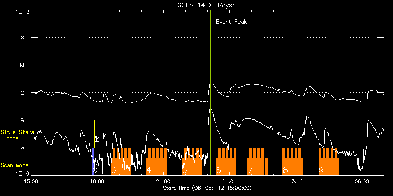 EIS Observation timeline overlay to GOES-Xray curve Code 1" 2" 40" 266" EIS Observations list for this event: STUDY ACRONYM ID DATE OBSERVED DESCRIPTION NOAA# TARGET 0 PRY_slot_contextLITE | 29836 | 2012/10/08 17:47:32 | | | Active Region TIMELINE ID DATE OBSERVED FITS FILE XCEN (+W/-E) YCEN (+N/-S) DUR ----------------------------------------------------------------------------------------------------------------- 29836 | 2012/10/08 17:47:32.000 | eis_l0_20121008_174732.fits.gz | -15.21 | -0.35 | 2m57s 1 Alignment_266 | 29837 | 2012/10/08 17:50:47 | | | Quiet Sun TIMELINE ID DATE OBSERVED FITS FILE XCEN (+W/-E) YCEN (+N/-S) DUR ----------------------------------------------------------------------------------------------------------------- 29837 | 2012/10/08 17:50:47.000 | eis_l0_20121008_175047.fits.gz | -132.57 | -0.50 | 1m22s 2 XRT_synop_AIA | 29838 | 2012/10/08 17:52:54 | | | Quiet Sun TIMELINE ID DATE OBSERVED FITS FILE XCEN (+W/-E) YCEN (+N/-S) DUR ----------------------------------------------------------------------------------------------------------------- 29838 | 2012/10/08 17:52:54.000 | eis_l0_20121008_175254.fits.gz | -132.57 | -0.42 | 10s 3 HH_Flare+AR_180x152 | 29845 | 2012/10/08 18:37:53 | AR and flare observation | | Flare TIMELINE ID DATE OBSERVED FITS FILE XCEN (+W/-E) YCEN (+N/-S) DUR ----------------------------------------------------------------------------------------------------------------- 29845 | 2012/10/08 18:37:53.000 | eis_l0_20121008_183753.fits.gz | 147.79 | -431.70 | 5m17s 29845 | 2012/10/08 18:43:13.000 | eis_l0_20121008_184313.fits.gz | 148.57 | -431.70 | 5m17s 29845 | 2012/10/08 18:48:33.000 | eis_l0_20121008_184833.fits.gz | 149.34 | -431.54 | 5m17s 29845 | 2012/10/08 18:53:53.000 | eis_l0_20121008_185353.fits.gz | 150.11 | -431.70 | 5m18s 29845 | 2012/10/08 18:59:14.000 | eis_l0_20121008_185914.fits.gz | 150.81 | -431.62 | 5m18s 29845 | 2012/10/08 19:04:35.000 | eis_l0_20121008_190435.fits.gz | 151.50 | -431.54 | 5m18s 29845 | 2012/10/08 19:09:56.000 | eis_l0_20121008_190956.fits.gz | 152.35 | -431.62 | 5m18s 29845 | 2012/10/08 19:15:17.000 | eis_l0_20121008_191517.fits.gz | 153.05 | -431.54 | 5m17s 29845 | 2012/10/08 19:20:37.000 | eis_l0_20121008_192037.fits.gz | 153.82 | -431.46 | 5m18s 29845 | 2012/10/08 19:25:58.000 | eis_l0_20121008_192558.fits.gz | 154.59 | -431.46 | 5m18s 4 HH_Flare+AR_180x152 | 29846 | 2012/10/08 20:14:39 | AR and flare observation | | Flare TIMELINE ID DATE OBSERVED FITS FILE XCEN (+W/-E) YCEN (+N/-S) DUR ----------------------------------------------------------------------------------------------------------------- 29846 | 2012/10/08 20:14:39.000 | eis_l0_20121008_201439.fits.gz | 161.47 | -431.31 | 5m17s 29846 | 2012/10/08 20:19:59.000 | eis_l0_20121008_201959.fits.gz | 162.24 | -431.31 | 5m19s 29846 | 2012/10/08 20:25:20.000 | eis_l0_20121008_202520.fits.gz | 163.01 | -431.31 | 5m18s 29846 | 2012/10/08 20:30:41.000 | eis_l0_20121008_203041.fits.gz | 163.71 | -431.39 | 5m17s 29846 | 2012/10/08 20:36:01.000 | eis_l0_20121008_203601.fits.gz | 164.40 | -431.23 | 5m19s 29846 | 2012/10/08 20:41:23.000 | eis_l0_20121008_204123.fits.gz | 165.18 | -431.23 | 5m17s 29846 | 2012/10/08 20:46:43.000 | eis_l0_20121008_204643.fits.gz | 165.95 | -431.15 | 5m18s 29846 | 2012/10/08 20:52:04.000 | eis_l0_20121008_205204.fits.gz | 166.72 | -431.15 | 5m18s 29846 | 2012/10/08 20:57:25.000 | eis_l0_20121008_205725.fits.gz | 167.49 | -431.15 | 5m17s 29846 | 2012/10/08 21:02:45.000 | eis_l0_20121008_210245.fits.gz | 168.11 | -431.15 | 5m18s 5 HH_Flare+AR_180x152 | 29847 | 2012/10/08 21:51:39 | AR and flare observation | | Flare TIMELINE ID DATE OBSERVED FITS FILE XCEN (+W/-E) YCEN (+N/-S) DUR ----------------------------------------------------------------------------------------------------------------- 29847 | 2012/10/08 21:51:39.000 | eis_l0_20121008_215139.fits.gz | 175.14 | -431.00 | 5m18s 29847 | 2012/10/08 21:56:59.000 | eis_l0_20121008_215659.fits.gz | 175.91 | -431.08 | 5m18s 29847 | 2012/10/08 22:02:20.000 | eis_l0_20121008_220220.fits.gz | 176.53 | -431.00 | 5m17s 29847 | 2012/10/08 22:07:40.000 | eis_l0_20121008_220740.fits.gz | 177.30 | -431.00 | 5m18s 29847 | 2012/10/08 22:13:01.000 | eis_l0_20121008_221301.fits.gz | 178.07 | -430.92 | 5m18s 29847 | 2012/10/08 22:18:22.000 | eis_l0_20121008_221822.fits.gz | 178.93 | -431.00 | 5m18s 29847 | 2012/10/08 22:23:43.000 | eis_l0_20121008_222343.fits.gz | 179.70 | -431.00 | 5m17s 29847 | 2012/10/08 22:29:03.000 | eis_l0_20121008_222903.fits.gz | 180.39 | -430.85 | 5m18s 29847 | 2012/10/08 22:34:24.000 | eis_l0_20121008_223424.fits.gz | 181.09 | -430.85 | 5m18s 29847 | 2012/10/08 22:39:45.000 | eis_l0_20121008_223945.fits.gz | 181.86 | -430.85 | 5m19s 6 HH_Flare+AR_180x152 | 29848 | 2012/10/08 23:24:12 | AR and flare observation | | Flare TIMELINE ID DATE OBSERVED FITS FILE XCEN (+W/-E) YCEN (+N/-S) DUR ----------------------------------------------------------------------------------------------------------------- 29848 | 2012/10/08 23:24:12.000 | eis_l0_20121008_232412.fits.gz | 188.04 | -430.61 | 5m18s 29848 | 2012/10/08 23:29:32.000 | eis_l0_20121008_232932.fits.gz | 188.89 | -430.77 | 5m19s 29848 | 2012/10/08 23:34:53.000 | eis_l0_20121008_233453.fits.gz | 189.59 | -430.61 | 5m18s 29848 | 2012/10/08 23:40:14.000 | eis_l0_20121008_234014.fits.gz | 190.28 | -430.69 | 5m17s 29848 | 2012/10/08 23:45:34.000 | eis_l0_20121008_234534.fits.gz | 191.05 | -430.61 | 5m18s 29848 | 2012/10/08 23:50:55.000 | eis_l0_20121008_235055.fits.gz | 191.82 | -430.46 | 5m18s 29848 | 2012/10/08 23:56:16.000 | eis_l0_20121008_235616.fits.gz | 192.60 | -430.61 | 5m17s 29848 | 2012/10/09 00:01:36.000 | eis_l0_20121009_000136.fits.gz | 193.37 | -430.54 | 5m18s 29848 | 2012/10/09 00:06:57.000 | eis_l0_20121009_000657.fits.gz | 194.07 | -430.46 | 5m18s 29848 | 2012/10/09 00:12:18.000 | eis_l0_20121009_001218.fits.gz | 194.84 | -430.46 | 5m17s 7 HH_Flare+AR_180x152 | 29849 | 2012/10/09 00:49:12 | AR and flare obse