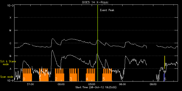 EIS Observation timeline overlay to GOES-Xray curve Code 1" 2" 40" 266" EIS Observations list for this event: STUDY ACRONYM ID DATE OBSERVED DESCRIPTION NOAA# TARGET 0 HH_Flare+AR_180x152 | 29846 | 2012/10/08 20:14:39 | AR and flare observation | | Flare TIMELINE ID DATE OBSERVED FITS FILE XCEN (+W/-E) YCEN (+N/-S) DUR ----------------------------------------------------------------------------------------------------------------- 29846 | 2012/10/08 20:14:39.000 | eis_l0_20121008_201439.fits.gz | 161.47 | -431.31 | 5m17s 29846 | 2012/10/08 20:19:59.000 | eis_l0_20121008_201959.fits.gz | 162.24 | -431.31 | 5m19s 29846 | 2012/10/08 20:25:20.000 | eis_l0_20121008_202520.fits.gz | 163.01 | -431.31 | 5m18s 29846 | 2012/10/08 20:30:41.000 | eis_l0_20121008_203041.fits.gz | 163.71 | -431.39 | 5m17s 29846 | 2012/10/08 20:36:01.000 | eis_l0_20121008_203601.fits.gz | 164.40 | -431.23 | 5m19s 29846 | 2012/10/08 20:41:23.000 | eis_l0_20121008_204123.fits.gz | 165.18 | -431.23 | 5m17s 29846 | 2012/10/08 20:46:43.000 | eis_l0_20121008_204643.fits.gz | 165.95 | -431.15 | 5m18s 29846 | 2012/10/08 20:52:04.000 | eis_l0_20121008_205204.fits.gz | 166.72 | -431.15 | 5m18s 29846 | 2012/10/08 20:57:25.000 | eis_l0_20121008_205725.fits.gz | 167.49 | -431.15 | 5m17s 29846 | 2012/10/08 21:02:45.000 | eis_l0_20121008_210245.fits.gz | 168.11 | -431.15 | 5m18s 1 HH_Flare+AR_180x152 | 29847 | 2012/10/08 21:51:39 | AR and flare observation | | Flare TIMELINE ID DATE OBSERVED FITS FILE XCEN (+W/-E) YCEN (+N/-S) DUR ----------------------------------------------------------------------------------------------------------------- 29847 | 2012/10/08 21:51:39.000 | eis_l0_20121008_215139.fits.gz | 175.14 | -431.00 | 5m18s 29847 | 2012/10/08 21:56:59.000 | eis_l0_20121008_215659.fits.gz | 175.91 | -431.08 | 5m18s 29847 | 2012/10/08 22:02:20.000 | eis_l0_20121008_220220.fits.gz | 176.53 | -431.00 | 5m17s 29847 | 2012/10/08 22:07:40.000 | eis_l0_20121008_220740.fits.gz | 177.30 | -431.00 | 5m18s 29847 | 2012/10/08 22:13:01.000 | eis_l0_20121008_221301.fits.gz | 178.07 | -430.92 | 5m18s 29847 | 2012/10/08 22:18:22.000 | eis_l0_20121008_221822.fits.gz | 178.93 | -431.00 | 5m18s 29847 | 2012/10/08 22:23:43.000 | eis_l0_20121008_222343.fits.gz | 179.70 | -431.00 | 5m17s 29847 | 2012/10/08 22:29:03.000 | eis_l0_20121008_222903.fits.gz | 180.39 | -430.85 | 5m18s 29847 | 2012/10/08 22:34:24.000 | eis_l0_20121008_223424.fits.gz | 181.09 | -430.85 | 5m18s 29847 | 2012/10/08 22:39:45.000 | eis_l0_20121008_223945.fits.gz | 181.86 | -430.85 | 5m19s 2 HH_Flare+AR_180x152 | 29848 | 2012/10/08 23:24:12 | AR and flare observation | | Flare TIMELINE ID DATE OBSERVED FITS FILE XCEN (+W/-E) YCEN (+N/-S) DUR ----------------------------------------------------------------------------------------------------------------- 29848 | 2012/10/08 23:24:12.000 | eis_l0_20121008_232412.fits.gz | 188.04 | -430.61 | 5m18s 29848 | 2012/10/08 23:29:32.000 | eis_l0_20121008_232932.fits.gz | 188.89 | -430.77 | 5m19s 29848 | 2012/10/08 23:34:53.000 | eis_l0_20121008_233453.fits.gz | 189.59 | -430.61 | 5m18s 29848 | 2012/10/08 23:40:14.000 | eis_l0_20121008_234014.fits.gz | 190.28 | -430.69 | 5m17s 29848 | 2012/10/08 23:45:34.000 | eis_l0_20121008_234534.fits.gz | 191.05 | -430.61 | 5m18s 29848 | 2012/10/08 23:50:55.000 | eis_l0_20121008_235055.fits.gz | 191.82 | -430.46 | 5m18s 29848 | 2012/10/08 23:56:16.000 | eis_l0_20121008_235616.fits.gz | 192.60 | -430.61 | 5m17s 29848 | 2012/10/09 00:01:36.000 | eis_l0_20121009_000136.fits.gz | 193.37 | -430.54 | 5m18s 29848 | 2012/10/09 00:06:57.000 | eis_l0_20121009_000657.fits.gz | 194.07 | -430.46 | 5m18s 29848 | 2012/10/09 00:12:18.000 | eis_l0_20121009_001218.fits.gz | 194.84 | -430.46 | 5m17s 3 HH_Flare+AR_180x152 | 29849 | 2012/10/09 00:49:12 | AR and flare observation | | Flare TIMELINE ID DATE OBSERVED FITS FILE XCEN (+W/-E) YCEN (+N/-S) DUR ----------------------------------------------------------------------------------------------------------------- 29849 | 2012/10/09 00:49:12.000 | eis_l0_20121009_004912.fits.gz | 191.95 | -430.31 | 5m18s 29849 | 2012/10/09 00:54:33.000 | eis_l0_20121009_005433.fits.gz | 192.72 | -430.23 | 5m17s 29849 | 2012/10/09 00:59:53.000 | eis_l0_20121009_005953.fits.gz | 193.57 | -430.31 | 5m18s 29849 | 2012/10/09 01:05:14.000 | eis_l0_20121009_010514.fits.gz | 194.19 | -430.23 | 5m19s 29849 | 2012/10/09 01:10:35.000 | eis_l0_20121009_011035.fits.gz | 194.96 | -430.23 | 5m19s 29849 | 2012/10/09 01:15:56.000 | eis_l0_20121009_011556.fits.gz | 195.73 | -430.15 | 5m19s 29849 | 2012/10/09 01:21:17.000 | eis_l0_20121009_012117.fits.gz | 196.43 | -430.15 | 5m18s 29849 | 2012/10/09 01:26:38.000 | eis_l0_20121009_012638.fits.gz | 197.20 | -430.23 | 5m18s 29849 | 2012/10/09 01:37:19.000 | eis_l0_20121009_013719.fits.gz | 198.67 | -430.00 | 5m18s 4 HH_Flare+AR_180x152 | 29850 | 2012/10/09 02:25:12 | AR and flare observation | | Flare TIMELINE ID DATE OBSERVED FITS FILE XCEN (+W/-E) YCEN (+N/-S) DUR ----------------------------------------------------------------------------------------------------------------- 29850 | 2012/10/09 02:25:12.000 | eis_l0_20121009_022512.fits.gz | 213.30 | -429.77 | 5m18s 29850 | 2012/10/09 02:30:33.000 | eis_l0_20121009_023033.fits.gz | 214.07 | -429.77 | 5m17s 29850 | 2012/10/09 02:35:53.000 | eis_l0_20121009_023553.fits.gz | 214.85 | -429.77 | 5m19s 29850 | 2012/10/09 02:41:15.000 | eis_l0_20121009_024115.fits.gz | 215.54 | -429.92 | 5m17s 29850 | 2012/10/09 02:46:35.000 | eis_l0_20121009_024635.fits.gz | 216.24 | -429.69 | 5m18s 29850 | 2012/10/09 02:51:56.000 | eis_l0_20121009_025156.fits.gz | 217.09 | -429.84 | 5m18s 29850 | 2012/10/09 02:57:17.000 | eis_l0_20121009_025717.fits.gz | 217.78 | -429.84 | 5m17s 29850 | 2012/10/09 03:02:37.000 | eis_l0_20121009_030237.fits.gz | 218.55 | -429.84 | 5m18s 29850 | 2012/10/09 03:07:58.000 | eis_l0_20121009_030758.fits.gz | 219.25 | -429.77 | 5m18s 29850 | 2012/10/09 03:13:19.000 | eis_l0_20121009_031319.fits.gz | 220.02
