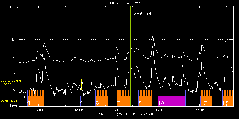 EIS Observation timeline overlay to GOES-Xray curve Code 1" 2" 40" 266" EIS Observations list for this event: STUDY ACRONYM ID DATE OBSERVED DESCRIPTION NOAA# TARGET 0 PRY_slot_contextLITE | 29884 | 2012/10/09 14:08:50 | Context on AR Obs - Coming AR near E l | | Active Region TIMELINE ID DATE OBSERVED FITS FILE XCEN (+W/-E) YCEN (+N/-S) DUR ----------------------------------------------------------------------------------------------------------------- 29884 | 2012/10/09 14:08:50.000 | eis_l0_20121009_140850.fits.gz | -9884.69 | -9963.20 | 2m57s 1 HH_Flare_180x160_v2 | 29885 | 2012/10/09 14:12:12 | AR Obs - Coming AR near E limb | | Flare TIMELINE ID DATE OBSERVED FITS FILE XCEN (+W/-E) YCEN (+N/-S) DUR ----------------------------------------------------------------------------------------------------------------- 29885 | 2012/10/09 14:12:12.000 | eis_l0_20121009_141212.fits.gz | -9871.20 | -9963.20 | 5m46s 29885 | 2012/10/09 14:18:01.000 | eis_l0_20121009_141801.fits.gz | -9871.20 | -9963.20 | 5m47s 29885 | 2012/10/09 14:23:50.000 | eis_l0_20121009_142350.fits.gz | -9871.20 | -9963.20 | 5m47s 29885 | 2012/10/09 14:29:40.000 | eis_l0_20121009_142940.fits.gz | -9871.20 | -9963.20 | 5m47s 29885 | 2012/10/09 14:35:30.000 | eis_l0_20121009_143530.fits.gz | -9871.20 | -9963.20 | 5m46s 29885 | 2012/10/09 14:41:19.000 | eis_l0_20121009_144119.fits.gz | -9871.20 | -9963.20 | 5m47s 29885 | 2012/10/09 14:47:09.000 | eis_l0_20121009_144709.fits.gz | -9871.20 | -9963.20 | 5m46s 29885 | 2012/10/09 14:52:58.000 | eis_l0_20121009_145258.fits.gz | -9871.20 | -9963.20 | 5m47s 29885 | 2012/10/09 14:58:47.000 | eis_l0_20121009_145847.fits.gz | -9871.20 | -9963.20 | 5m47s 29885 | 2012/10/09 15:04:37.000 | eis_l0_20121009_150437.fits.gz | -9871.20 | -9963.20 | 5m46s 29885 | 2012/10/09 15:10:26.000 | eis_l0_20121009_151026.fits.gz | -9871.20 | -9963.20 | 5m46s 29885 | 2012/10/09 15:16:15.000 | eis_l0_20121009_151615.fits.gz | -9871.20 | -9963.20 | 5m46s 2 PRY_slot_contextLITE | 29868 | 2012/10/09 18:05:50 | Change of EIS pointing and alignment w | | Active Region TIMELINE ID DATE OBSERVED FITS FILE XCEN (+W/-E) YCEN (+N/-S) DUR ----------------------------------------------------------------------------------------------------------------- 29868 | 2012/10/09 18:05:50.000 | eis_l0_20121009_180550.fits.gz | -15.14 | -0.50 | 2m56s 3 Alignment_266 | 29869 | 2012/10/09 18:09:05 | Change of EIS pointing and alignment w | | Quiet Sun TIMELINE ID DATE OBSERVED FITS FILE XCEN (+W/-E) YCEN (+N/-S) DUR ----------------------------------------------------------------------------------------------------------------- 29869 | 2012/10/09 18:09:05.000 | eis_l0_20121009_180905.fits.gz | -132.49 | -0.42 | 1m22s 4 XRT_synop_AIA | 29870 | 2012/10/09 18:11:39 | Change of EIS pointing and alignment w | | Quiet Sun TIMELINE ID DATE OBSERVED FITS FILE XCEN (+W/-E) YCEN (+N/-S) DUR ----------------------------------------------------------------------------------------------------------------- 29870 | 2012/10/09 18:11:39.000 | eis_l0_20121009_181139.fits.gz | -132.49 | -0.50 | 10s 5 PRY_slot_contextLITE | 29892 | 2012/10/09 19:14:27 | Context on AR Obs - Coming AR near E l | | Active Region TIMELINE ID DATE OBSERVED FITS FILE XCEN (+W/-E) YCEN (+N/-S) DUR ----------------------------------------------------------------------------------------------------------------- 29892 | 2012/10/09 19:14:27.000 | eis_l0_20121009_191427.fits.gz | -9884.69 | -9963.20 | 2m56s 6 HH_Flare_180x160_v2 | 29893 | 2012/10/09 19:17:48 | AR Obs - Coming AR near E limb | | Flare TIMELINE ID DATE OBSERVED FITS FILE XCEN (+W/-E) YCEN (+N/-S) DUR ----------------------------------------------------------------------------------------------------------------- 29893 | 2012/10/09 19:17:48.000 | eis_l0_20121009_191748.fits.gz | -9871.20 | -9963.20 | 5m46s 29893 | 2012/10/09 19:23:37.000 | eis_l0_20121009_192337.fits.gz | -9871.20 | -9963.20 | 5m47s 29893 | 2012/10/09 19:29:26.000 | eis_l0_20121009_192926.fits.gz | -9871.20 | -9963.20 | 5m47s 29893 | 2012/10/09 19:35:16.000 | eis_l0_20121009_193516.fits.gz | -9871.20 | -9963.20 | 5m46s 29893 | 2012/10/09 19:41:05.000 | eis_l0_20121009_194105.fits.gz | -9871.20 | -9963.20 | 5m47s 29893 | 2012/10/09 19:46:55.000 | eis_l0_20121009_194655.fits.gz | -9871.20 | -9963.20 | 5m47s 29893 | 2012/10/09 19:52:45.000 | eis_l0_20121009_195245.fits.gz | -9871.20 | -9963.20 | 5m46s 29893 | 2012/10/09 19:58:34.000 | eis_l0_20121009_195834.fits.gz | -9871.20 | -9963.20 | 5m47s 29893 | 2012/10/09 20:04:23.000 | eis_l0_20121009_200423.fits.gz | -9871.20 | -9963.20 | 5m47s 7 HH_Flare_180x160_v2 | 29904 | 2012/10/09 20:51:43 | | | Flare TIMELINE ID DATE OBSERVED FITS FILE XCEN (+W/-E) YCEN (+N/-S) DUR ----------------------------------------------------------------------------------------------------------------- 29904 | 2012/10/09 20:51:43.000 | eis_l0_20121009_205143.fits.gz | -9871.20 | -9963.20 | 5m47s 29904 | 2012/10/09 20:57:33.000 | eis_l0_20121009_205733.fits.gz | -9871.20 | -9963.20 | 5m46s 29904 | 2012/10/09 21:03:22.000 | eis_l0_20121009_210322.fits.gz | -9871.20 | -9963.20 | 5m46s 29904 | 2012/10/09 21:09:11.000 | eis_l0_20121009_210911.fits.gz | -9871.20 | -9963.20 | 5m46s 29904 | 2012/10/09 21:14:59.000 | eis_l0_20121009_211459.fits.gz | -9871.20 | -9963.20 | 5m47s 29904 | 2012/10/09 21:20:48.000 | eis_l0_20121009_212048.fits.gz | -9871.20 | -9963.20 | 5m47s 29904 | 2012/10/09 21:26:38.000 | eis_l0_20121009_212638.fits.gz | -9871.20 | -9963.20 | 5m46s 29904 | 2012/10/09 21:32:27.000 | eis_l0_20121009_213227.fits.gz | -9871.20 | -9963.20 | 5m47s 29904 | 2012/10/09 21:38:17.000 | eis_l0_20121009_213817.fits.gz | -9871.20 | -9963.20 | 5m47s 29904 | 2012/10/09 21:44:07.000 | eis_l0_20121009_214407.fits.gz | -9871.20 | -9963.20 | 5m47s 8 PRY_slot_contextLITE | 29894 | 2012/10/09 22:27:20 | Context on AR Obs - Coming AR near E l | | Active Region TIMELINE ID DATE OBSERVED FITS FILE XCEN (+W/-E) YCEN (+N/-S) DUR -------------------