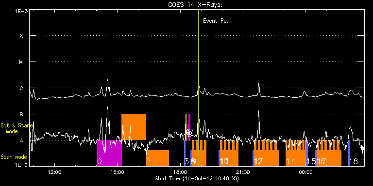 EIS Observation timeline overlay to GOES-Xray curve Code 1" 2" 40" 266" EIS Observations list for this event: STUDY ACRONYM ID DATE OBSERVED DESCRIPTION NOAA# TARGET 0 prom_rast_v1 | 29862 | 2012/10/10 14:02:26 | Sac Peak Prominence Observing Campaign | | Eruptive Filame TIMELINE ID DATE OBSERVED FITS FILE XCEN (+W/-E) YCEN (+N/-S) DUR ----------------------------------------------------------------------------------------------------------------- 29862 | 2012/10/10 14:02:26.000 | eis_l0_20121010_140226.fits.gz | 849.97 | -400.57 | 1h9m44s 1 BL_SUMER_EIS_p2 | 29863 | 2012/10/10 15:12:28 | Sac Peak Prominence Observing Campaign | | Quiet Sun TIMELINE ID DATE OBSERVED FITS FILE XCEN (+W/-E) YCEN (+N/-S) DUR ----------------------------------------------------------------------------------------------------------------- 29863 | 2012/10/10 15:12:28.000 | eis_l0_20121010_151228.fits.gz | 849.40 | -400.41 | 1h9m25s 2 GDZ_PLUME1_2_300_50s | 29864 | 2012/10/10 16:21:58 | Sac Peak Prominence Observing Campaign | 1587 | Coronal Hole TIMELINE ID DATE OBSERVED FITS FILE XCEN (+W/-E) YCEN (+N/-S) DUR ----------------------------------------------------------------------------------------------------------------- 29864 | 2012/10/10 16:21:58.000 | eis_l0_20121010_162158.fits.gz | 848.66 | -400.57 | 1h4m52s 3 PRY_slot_contextLITE | 29871 | 2012/10/10 18:11:19 | Change of EIS pointing and alignment w | | Active Region TIMELINE ID DATE OBSERVED FITS FILE XCEN (+W/-E) YCEN (+N/-S) DUR ----------------------------------------------------------------------------------------------------------------- 29871 | 2012/10/10 18:11:19.000 | eis_l0_20121010_181119.fits.gz | -15.29 | -0.42 | 2m57s 4 Alignment_266 | 29872 | 2012/10/10 18:14:34 | Change of EIS pointing and alignment w | | Quiet Sun TIMELINE ID DATE OBSERVED FITS FILE XCEN (+W/-E) YCEN (+N/-S) DUR ----------------------------------------------------------------------------------------------------------------- 29872 | 2012/10/10 18:14:34.000 | eis_l0_20121010_181434.fits.gz | -132.64 | -0.42 | 1m22s 5 XRT_synop_AIA | 29873 | 2012/10/10 18:16:41 | Change of EIS pointing and alignment w | | Quiet Sun TIMELINE ID DATE OBSERVED FITS FILE XCEN (+W/-E) YCEN (+N/-S) DUR ----------------------------------------------------------------------------------------------------------------- 29873 | 2012/10/10 18:16:41.000 | eis_l0_20121010_181641.fits.gz | -132.49 | -0.65 | 10s 6 regcal071 | 29905 | 2012/10/10 18:21:11 | Dark exposures, CCD bottom rows (100s | | Engineering TIMELINE ID DATE OBSERVED FITS FILE XCEN (+W/-E) YCEN (+N/-S) DUR ----------------------------------------------------------------------------------------------------------------- 29905 | 2012/10/10 18:21:11.000 | eis_l0_20121010_182111.fits.gz | -9854.89 | -10268.20 | 3m22s 7 regcal072 | 29906 | 2012/10/10 18:25:00 | Dark exposures, top CCD rows (100s exp | | Engineering TIMELINE ID DATE OBSERVED FITS FILE XCEN (+W/-E) YCEN (+N/-S) DUR ----------------------------------------------------------------------------------------------------------------- 29906 | 2012/10/10 18:25:00.000 | eis_l0_20121010_182500.fits.gz | -9854.89 | -9757.20 | 3m22s 8 PRY_slot_contextLITE | 29907 | 2012/10/10 18:30:27 | Context on AR Obs - Coming AR near E l | | Active Region TIMELINE ID DATE OBSERVED FITS FILE XCEN (+W/-E) YCEN (+N/-S) DUR ----------------------------------------------------------------------------------------------------------------- 29907 | 2012/10/10 18:30:27.000 | eis_l0_20121010_183027.fits.gz | -9884.69 | -9963.20 | 2m56s 9 HH_Flare_180x160_v2 | 29908 | 2012/10/10 18:33:48 | AR Obs - Coming AR near E limb | | Flare TIMELINE ID DATE OBSERVED FITS FILE XCEN (+W/-E) YCEN (+N/-S) DUR ----------------------------------------------------------------------------------------------------------------- 29908 | 2012/10/10 18:33:48.000 | eis_l0_20121010_183348.fits.gz | -9871.20 | -9963.20 | 5m47s 29908 | 2012/10/10 18:39:37.000 | eis_l0_20121010_183937.fits.gz | -9871.20 | -9963.20 | 5m46s 29908 | 2012/10/10 18:45:26.000 | eis_l0_20121010_184526.fits.gz | -9871.20 | -9963.20 | 5m46s 29908 | 2012/10/10 18:51:15.000 | eis_l0_20121010_185115.fits.gz | -9871.20 | -9963.20 | 5m46s 29908 | 2012/10/10 18:57:04.000 | eis_l0_20121010_185704.fits.gz | -9871.20 | -9963.20 | 5m47s 29908 | 2012/10/10 19:02:53.000 | eis_l0_20121010_190253.fits.gz | -9871.20 | -9963.20 | 5m47s 29908 | 2012/10/10 19:08:43.000 | eis_l0_20121010_190843.fits.gz | -9871.20 | -9963.20 | 5m47s 10 PRY_slot_contextLITE | 29909 | 2012/10/10 19:50:50 | Context on AR Obs - Coming AR near E l | | Active Region TIMELINE ID DATE OBSERVED FITS FILE XCEN (+W/-E) YCEN (+N/-S) DUR ----------------------------------------------------------------------------------------------------------------- 29909 | 2012/10/10 19:50:50.000 | eis_l0_20121010_195050.fits.gz | -9884.69 | -9963.20 | 2m56s 11 HH_Flare_180x160_v2 | 29910 | 2012/10/10 19:54:11 | AR Obs - Coming AR near E limb | | Flare TIMELINE ID DATE OBSERVED FITS FILE XCEN (+W/-E) YCEN (+N/-S) DUR ----------------------------------------------------------------------------------------------------------------- 29910 | 2012/10/10 19:54:11.000 | eis_l0_20121010_195411.fits.gz | -9871.20 | -9963.20 | 5m46s 29910 | 2012/10/10 20:00:00.000 | eis_l0_20121010_200000.fits.gz | -9871.20 | -9963.20 | 5m47s 29910 | 2012/10/10 20:05:49.000 | eis_l0_20121010_200549.fits.gz | -9871.20 | -9963.20 | 5m47s 29910 | 2012/10/10 20:11:38.000 | eis_l0_20121010_201138.fits.gz | -9871.20 | -9963.20 | 5m46s 29910 | 2012/10/10 20:17:27.000 | eis_l0_20121010_201727.fits.gz | -9871.20 | -9963.20 | 5m46s 29910 | 2012/10/10 20:23:16.000 | eis_l0_20121010_202316.fits.gz | -9871.20 | -9963.20 | 5m46s 29910 | 2012/10/10 20:29:05.000 | eis_l0_20121010_202905.fits.gz | -9871.20 | -9963.20 | 5m47s 29910 | 2012/10/10 20:34:55.000 | eis_l0_20121010_203455.fits.gz | -9871.20 | -9963.20 | 5m47s 29910 | 2012/10/10 20:40:44.000 | eis_l0_20121010_204044.fits.gz