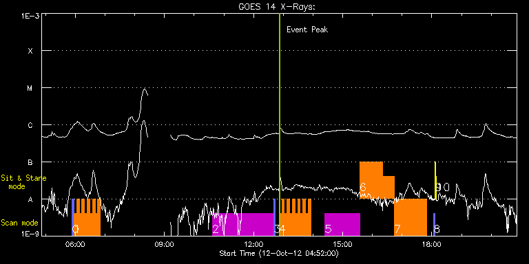 EIS Observation timeline overlay to GOES-Xray curve Code 1" 2" 40" 266" EIS Observations list for this event: STUDY ACRONYM ID DATE OBSERVED DESCRIPTION NOAA# TARGET 0 PRY_slot_contextLITE | 29942 | 2012/10/12 05:53:50 | Context on AR Obs | 1589 | Active Region TIMELINE ID DATE OBSERVED FITS FILE XCEN (+W/-E) YCEN (+N/-S) DUR ----------------------------------------------------------------------------------------------------------------- 29942 | 2012/10/12 05:53:50.000 | eis_l0_20121012_055350.fits.gz | -738.10 | 135.38 | 2m56s 1 HH_Flare+AR_180x152 | 29943 | 2012/10/12 05:57:12 | AR Obs | 1589 | Flare TIMELINE ID DATE OBSERVED FITS FILE XCEN (+W/-E) YCEN (+N/-S) DUR ----------------------------------------------------------------------------------------------------------------- 29943 | 2012/10/12 05:57:12.000 | eis_l0_20121012_055712.fits.gz | -724.79 | 135.38 | 5m17s 29943 | 2012/10/12 06:02:32.000 | eis_l0_20121012_060232.fits.gz | -724.25 | 135.46 | 5m19s 29943 | 2012/10/12 06:07:53.000 | eis_l0_20121012_060753.fits.gz | -723.71 | 135.38 | 5m18s 29943 | 2012/10/12 06:13:14.000 | eis_l0_20121012_061314.fits.gz | -723.25 | 135.15 | 5m18s 29943 | 2012/10/12 06:18:35.000 | eis_l0_20121012_061835.fits.gz | -722.71 | 135.15 | 5m18s 29943 | 2012/10/12 06:23:56.000 | eis_l0_20121012_062356.fits.gz | -722.17 | 135.15 | 5m17s 29943 | 2012/10/12 06:29:16.000 | eis_l0_20121012_062916.fits.gz | -721.71 | 134.99 | 5m17s 29943 | 2012/10/12 06:34:36.000 | eis_l0_20121012_063436.fits.gz | -721.09 | 134.84 | 5m18s 29943 | 2012/10/12 06:39:57.000 | eis_l0_20121012_063957.fits.gz | -720.62 | 134.91 | 5m17s 29943 | 2012/10/12 06:45:17.000 | eis_l0_20121012_064517.fits.gz | -720.08 | 134.76 | 5m18s 2 HPW021_VEL_240x512v1 | 29935 | 2012/10/12 10:36:57 | AR Obs - limb to limb | 1589 | Active Region TIMELINE ID DATE OBSERVED FITS FILE XCEN (+W/-E) YCEN (+N/-S) DUR ----------------------------------------------------------------------------------------------------------------- 29935 | 2012/10/12 10:36:57.000 | eis_l0_20121012_103657.fits.gz | -695.00 | 132.21 | 2h3m47s 3 PRY_slot_contextLITE | 29936 | 2012/10/12 12:41:10 | Context on AR Obs - limb to limb | 1589 | Active Region TIMELINE ID DATE OBSERVED FITS FILE XCEN (+W/-E) YCEN (+N/-S) DUR ----------------------------------------------------------------------------------------------------------------- 29936 | 2012/10/12 12:41:10.000 | eis_l0_20121012_124110.fits.gz | -697.16 | 130.90 | 2m56s 4 HH_Flare+AR_180x152 | 29937 | 2012/10/12 12:51:33 | AR Obs | 1589 | Flare TIMELINE ID DATE OBSERVED FITS FILE XCEN (+W/-E) YCEN (+N/-S) DUR ----------------------------------------------------------------------------------------------------------------- 29937 | 2012/10/12 12:51:33.000 | eis_l0_20121012_125133.fits.gz | -683.00 | 130.59 | 5m18s 29937 | 2012/10/12 12:56:54.000 | eis_l0_20121012_125654.fits.gz | -682.54 | 130.67 | 5m18s 29937 | 2012/10/12 13:02:15.000 | eis_l0_20121012_130215.fits.gz | -681.92 | 130.43 | 5m18s 29937 | 2012/10/12 13:07:35.000 | eis_l0_20121012_130735.fits.gz | -681.46 | 130.51 | 5m18s 29937 | 2012/10/12 13:12:56.000 | eis_l0_20121012_131256.fits.gz | -680.84 | 130.51 | 5m18s 29937 | 2012/10/12 13:18:17.000 | eis_l0_20121012_131817.fits.gz | -680.30 | 130.51 | 5m18s 29937 | 2012/10/12 13:23:38.000 | eis_l0_20121012_132338.fits.gz | -679.76 | 130.28 | 5m18s 29937 | 2012/10/12 13:28:59.000 | eis_l0_20121012_132859.fits.gz | -679.14 | 130.28 | 5m17s 29937 | 2012/10/12 13:34:19.000 | eis_l0_20121012_133419.fits.gz | -678.68 | 130.28 | 5m17s 29937 | 2012/10/12 13:39:39.000 | eis_l0_20121012_133939.fits.gz | -678.06 | 130.20 | 5m18s 29937 | 2012/10/12 13:45:00.000 | eis_l0_20121012_134500.fits.gz | -677.44 | 130.13 | 5m18s 29937 | 2012/10/12 13:50:21.000 | eis_l0_20121012_135021.fits.gz | -676.90 | 130.05 | 5m17s 5 prom_rast_v1 | 29921 | 2012/10/12 14:24:27 | Sac Peak Prominence Observing Campaign | | Eruptive Filame TIMELINE ID DATE OBSERVED FITS FILE XCEN (+W/-E) YCEN (+N/-S) DUR ----------------------------------------------------------------------------------------------------------------- 29921 | 2012/10/12 14:24:27.000 | eis_l0_20121012_142427.fits.gz | -9869.46 | -9963.20 | 1h9m44s 6 BL_SUMER_EIS_p2 | 29922 | 2012/10/12 15:34:29 | Sac Peak Prominence Observing Campaign | | Quiet Sun TIMELINE ID DATE OBSERVED FITS FILE XCEN (+W/-E) YCEN (+N/-S) DUR ----------------------------------------------------------------------------------------------------------------- 29922 | 2012/10/12 15:34:29.000 | eis_l0_20121012_153429.fits.gz | -9869.95 | -9963.20 | 46m31s 29922 | 2012/10/12 16:18:57.000 | eis_l0_20121012_161857.fits.gz | -9869.95 | -9963.20 | 24m59s 7 GDZ_PLUME1_2_300_50s | 29923 | 2012/10/12 16:44:28 | Sac Peak Prominence Observing Campaign | | Coronal Hole TIMELINE ID DATE OBSERVED FITS FILE XCEN (+W/-E) YCEN (+N/-S) DUR ----------------------------------------------------------------------------------------------------------------- 29923 | 2012/10/12 16:44:28.000 | eis_l0_20121012_164428.fits.gz | -9870.70 | -9963.20 | 1h4m51s 8 PRY_slot_contextLITE | 29927 | 2012/10/12 18:03:50 | Change of EIS pointing and alignment w | | Active Region TIMELINE ID DATE OBSERVED FITS FILE XCEN (+W/-E) YCEN (+N/-S) DUR ----------------------------------------------------------------------------------------------------------------- 29927 | 2012/10/12 18:03:50.000 | eis_l0_20121012_180350.fits.gz | -15.14 | -0.42 | 2m56s 9 Alignment_266 | 29928 | 2012/10/12 18:07:04 | Change of EIS pointing and alignment w | | Quiet Sun TIMELINE ID DATE OBSERVED FITS FILE XCEN (+W/-E) YCEN (+N/-S) DUR ----------------------------------------------------------------------------------------------------------------- 29928 | 2012/10/12 18:07:04.000 | eis_l0_20121012_180704.fits.gz | -132.49 | -0.50 | 1m22s 10 XRT_synop_AIA | 29929 | 2012/10/12 18:09:11 | Change of EIS pointing and alignment w | | Quiet Sun TIMELINE ID DATE OBSERVED FITS FILE XCEN (+W/-E) YCEN (+N/-S) DUR -----