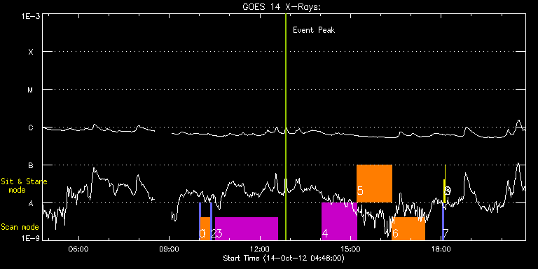 EIS Observation timeline overlay to GOES-Xray curve Code 1" 2" 40" 266" EIS Observations list for this event: STUDY ACRONYM ID DATE OBSERVED DESCRIPTION NOAA# TARGET 0 PRY_slot_context_v3 | 29968 | 2012/10/14 09:59:20 | Active Region Transient Brightenings ( | 1589 | Active Region TIMELINE ID DATE OBSERVED FITS FILE XCEN (+W/-E) YCEN (+N/-S) DUR ----------------------------------------------------------------------------------------------------------------- 29968 | 2012/10/14 09:59:20.000 | eis_l0_20121014_095920.fits.gz | -286.12 | 96.91 | 2m56s 1 cam_artb_cds_a_lite | 29969 | 2012/10/14 10:02:41 | Active Region Transient Brightenings ( | 1589 | Active Region TIMELINE ID DATE OBSERVED FITS FILE XCEN (+W/-E) YCEN (+N/-S) DUR ----------------------------------------------------------------------------------------------------------------- 29969 | 2012/10/14 10:02:41.000 | eis_l0_20121014_100241.fits.gz | -270.67 | 96.75 | 19m25s 2 PRY_slot_context_v3 | 29970 | 2012/10/14 10:22:18 | Active Region Transient Brightenings ( | 1589 | Active Region TIMELINE ID DATE OBSERVED FITS FILE XCEN (+W/-E) YCEN (+N/-S) DUR ----------------------------------------------------------------------------------------------------------------- 29970 | 2012/10/14 10:22:18.000 | eis_l0_20121014_102218.fits.gz | -282.80 | 96.68 | 2m56s 3 HPW021_VEL_240x512v1 | 29971 | 2012/10/14 10:32:19 | Diagnostic scan of AR. | 1589 | Active Region TIMELINE ID DATE OBSERVED FITS FILE XCEN (+W/-E) YCEN (+N/-S) DUR ----------------------------------------------------------------------------------------------------------------- 29971 | 2012/10/14 10:32:19.000 | eis_l0_20121014_103219.fits.gz | -266.28 | 96.60 | 2h3m48s 4 prom_rast_v1 | 29951 | 2012/10/14 14:02:40 | Sac Peak Prominence Observing Campaign | | Eruptive Filame TIMELINE ID DATE OBSERVED FITS FILE XCEN (+W/-E) YCEN (+N/-S) DUR ----------------------------------------------------------------------------------------------------------------- 29951 | 2012/10/14 14:02:40.000 | eis_l0_20121014_140240.fits.gz | 722.20 | -614.77 | 1h9m44s 5 BL_SUMER_EIS_p2 | 29952 | 2012/10/14 15:12:42 | Sac Peak Prominence Observing Campaign | | Quiet Sun TIMELINE ID DATE OBSERVED FITS FILE XCEN (+W/-E) YCEN (+N/-S) DUR ----------------------------------------------------------------------------------------------------------------- 29952 | 2012/10/14 15:12:42.000 | eis_l0_20121014_151242.fits.gz | 721.64 | -614.62 | 1h9m27s 6 GDZ_PLUME1_2_300_50s | 29953 | 2012/10/14 16:22:41 | Sac Peak Prominence Observing Campaign | | Coronal Hole TIMELINE ID DATE OBSERVED FITS FILE XCEN (+W/-E) YCEN (+N/-S) DUR ----------------------------------------------------------------------------------------------------------------- 29953 | 2012/10/14 16:22:41.000 | eis_l0_20121014_162241.fits.gz | 720.81 | -614.54 | 1h4m52s 7 PRY_slot_contextLITE | 29962 | 2012/10/14 18:02:19 | Change of EIS pointing and alignment w | 1589 | Active Region TIMELINE ID DATE OBSERVED FITS FILE XCEN (+W/-E) YCEN (+N/-S) DUR ----------------------------------------------------------------------------------------------------------------- 29962 | 2012/10/14 18:02:19.000 | eis_l0_20121014_180219.fits.gz | -15.29 | -0.35 | 2m57s 8 Alignment_266 | 29963 | 2012/10/14 18:05:34 | Change of EIS pointing and alignment w | 1589 | Quiet Sun TIMELINE ID DATE OBSERVED FITS FILE XCEN (+W/-E) YCEN (+N/-S) DUR ----------------------------------------------------------------------------------------------------------------- 29963 | 2012/10/14 18:05:34.000 | eis_l0_20121014_180534.fits.gz | -132.49 | -0.42 | 1m22s 9 XRT_synop_AIA | 29964 | 2012/10/14 18:08:09 | Change of EIS pointing and alignment w | 1589 | Quiet Sun TIMELINE ID DATE OBSERVED FITS FILE XCEN (+W/-E) YCEN (+N/-S) DUR ----------------------------------------------------------------------------------------------------------------- 29964 | 2012/10/14 18:08:09.000 | eis_l0_20121014_180809.fits.gz | -132.49 | -0.58 | 10s : Check study information : Download file : View thumbnails For this event, also check for:
