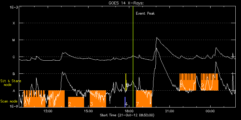 EIS Observation timeline overlay to GOES-Xray curve Code 1" 2" 40" 266" EIS Observations list for this event: STUDY ACRONYM ID DATE OBSERVED DESCRIPTION NOAA# TARGET 0 HH_Flare+AR_180x152H | 30089 | 2012/10/21 10:13:14 | Chromospheric Solar Flares. Joint Obse | 1593 | Flare TIMELINE ID DATE OBSERVED FITS FILE XCEN (+W/-E) YCEN (+N/-S) DUR ----------------------------------------------------------------------------------------------------------------- 30089 | 2012/10/21 10:13:14.000 | eis_l0_20121021_101314.fits.gz | -64.25 | 155.62 | 5m18s 30089 | 2012/10/21 10:18:35.000 | eis_l0_20121021_101835.fits.gz | -63.48 | 155.46 | 5m19s 30089 | 2012/10/21 10:23:56.000 | eis_l0_20121021_102356.fits.gz | -62.55 | 155.62 | 5m18s 30089 | 2012/10/21 10:29:17.000 | eis_l0_20121021_102917.fits.gz | -61.78 | 155.46 | 5m18s 30089 | 2012/10/21 10:34:38.000 | eis_l0_20121021_103438.fits.gz | -61.08 | 155.54 | 5m18s 30089 | 2012/10/21 10:39:59.000 | eis_l0_20121021_103959.fits.gz | -60.16 | 155.54 | 5m17s 30089 | 2012/10/21 10:45:19.000 | eis_l0_20121021_104519.fits.gz | -59.38 | 155.54 | 5m18s 30089 | 2012/10/21 10:50:40.000 | eis_l0_20121021_105040.fits.gz | -58.61 | 155.39 | 5m18s 30089 | 2012/10/21 10:56:00.000 | eis_l0_20121021_105600.fits.gz | -57.76 | 155.54 | 5m19s 30089 | 2012/10/21 11:01:22.000 | eis_l0_20121021_110122.fits.gz | -56.99 | 155.54 | 5m18s 30089 | 2012/10/21 11:06:43.000 | eis_l0_20121021_110643.fits.gz | -56.22 | 155.54 | 5m18s 30089 | 2012/10/21 11:12:03.000 | eis_l0_20121021_111203.fits.gz | -55.44 | 155.62 | 5m19s 30089 | 2012/10/21 11:17:25.000 | eis_l0_20121021_111725.fits.gz | -54.59 | 155.54 | 5m17s 30089 | 2012/10/21 11:22:45.000 | eis_l0_20121021_112245.fits.gz | -53.82 | 155.62 | 5m18s 30089 | 2012/10/21 11:28:06.000 | eis_l0_20121021_112806.fits.gz | -52.97 | 155.62 | 5m18s 30089 | 2012/10/21 11:33:26.000 | eis_l0_20121021_113326.fits.gz | -52.20 | 155.70 | 5m18s 30089 | 2012/10/21 11:38:47.000 | eis_l0_20121021_113847.fits.gz | -51.35 | 155.54 | 5m18s 30089 | 2012/10/21 11:44:08.000 | eis_l0_20121021_114408.fits.gz | -50.65 | 155.62 | 5m18s 1 GDZ_300x384_S2S3_40 | 30099 | 2012/10/21 12:03:14 | Flows Near Active Region Neutral Lines | 1593 | Active Region TIMELINE ID DATE OBSERVED FITS FILE XCEN (+W/-E) YCEN (+N/-S) DUR ----------------------------------------------------------------------------------------------------------------- 30099 | 2012/10/21 12:03:14.000 | eis_l0_20121021_120314.fits.gz | -16.25 | 141.10 | 1h10m8s 2 GDZ_300x384_S2S3_40 | 30103 | 2012/10/21 13:30:13 | Flows Near Active Region Neutral Lines | 1593 | Active Region TIMELINE ID DATE OBSERVED FITS FILE XCEN (+W/-E) YCEN (+N/-S) DUR ----------------------------------------------------------------------------------------------------------------- 30103 | 2012/10/21 13:30:13.000 | eis_l0_20121021_133013.fits.gz | -3.19 | 141.17 | 1h10m8s 3 GDZ_300x384_S2S3_40 | 30104 | 2012/10/21 15:06:43 | Flows Near Active Region Neutral Lines | 1593 | Active Region TIMELINE ID DATE OBSERVED FITS FILE XCEN (+W/-E) YCEN (+N/-S) DUR ----------------------------------------------------------------------------------------------------------------- 30104 | 2012/10/21 15:06:43.000 | eis_l0_20121021_150643.fits.gz | 11.25 | 141.33 | 1h10m7s 4 PRY_slot_contextLITE | 30116 | 2012/10/21 17:41:20 | Change of EIS pointing and alignment w | 1593 | Active Region TIMELINE ID DATE OBSERVED FITS FILE XCEN (+W/-E) YCEN (+N/-S) DUR ----------------------------------------------------------------------------------------------------------------- 30116 | 2012/10/21 17:41:20.000 | eis_l0_20121021_174120.fits.gz | -15.29 | -0.58 | 2m57s 5 Alignment_266 | 30117 | 2012/10/21 17:44:35 | Change of EIS pointing and alignment w | 1593 | Quiet Sun TIMELINE ID DATE OBSERVED FITS FILE XCEN (+W/-E) YCEN (+N/-S) DUR ----------------------------------------------------------------------------------------------------------------- 30117 | 2012/10/21 17:44:35.000 | eis_l0_20121021_174435.fits.gz | -132.57 | -0.50 | 1m22s 6 XRT_synop_AIA | 30118 | 2012/10/21 17:47:09 | Change of EIS pointing and alignment w | 1593 | Quiet Sun TIMELINE ID DATE OBSERVED FITS FILE XCEN (+W/-E) YCEN (+N/-S) DUR ----------------------------------------------------------------------------------------------------------------- 30118 | 2012/10/21 17:47:09.000 | eis_l0_20121021_174709.fits.gz | -132.57 | -0.42 | 11s 7 GDZ_300x384_S2S3_40 | 30105 | 2012/10/21 18:30:20 | Flows Near Active Region Neutral Lines | 1593 | Active Region TIMELINE ID DATE OBSERVED FITS FILE XCEN (+W/-E) YCEN (+N/-S) DUR ----------------------------------------------------------------------------------------------------------------- 30105 | 2012/10/21 18:30:20.000 | eis_l0_20121021_183020.fits.gz | 41.99 | 141.56 | 1h10m9s 8 SI_Venus_slit_v2 | 30123 | 2012/10/21 21:44:40 | Flareing loop observation on the W-lim | | Quiet Sun TIMELINE ID DATE OBSERVED FITS FILE XCEN (+W/-E) YCEN (+N/-S) DUR ----------------------------------------------------------------------------------------------------------------- 30123 | 2012/10/21 21:44:40.000 | eis_l0_20121021_214440.fits.gz | 1079.59 | 199.63 | 1m40s 30123 | 2012/10/21 21:46:34.000 | eis_l0_20121021_214634.fits.gz | 1079.59 | 199.63 | 1m40s 30123 | 2012/10/21 21:48:28.000 | eis_l0_20121021_214828.fits.gz | 1079.51 | 199.55 | 1m40s 30123 | 2012/10/21 21:50:22.000 | eis_l0_20121021_215022.fits.gz | 1079.59 | 199.63 | 1m40s 30123 | 2012/10/21 21:52:16.000 | eis_l0_20121021_215216.fits.gz | 1079.66 | 199.63 | 1m40s 30123 | 2012/10/21 21:54:10.000 | eis_l0_20121021_215410.fits.gz | 1079.66 | 199.63 | 1m40s 30123 | 2012/10/21 21:56:04.000 | eis_l0_20121021_215604.fits.gz | 1079.66 | 199.55 | 1m40s 30123 | 2012/10/21 21:57:58.000 | eis_l0_20121021_215758.fits.gz | 1079.51 | 199.63 | 1m40s 30123 | 2012/10/21 21:59:52.000 | eis_l0_20121021_215952.fits.gz | 1079.59 | 199.78 | 1m40s 30123 | 2012/10/21 22:01:46.000 | eis_l0_20121021_220146.fits.gz | 1079.59 | 199.63 | 1m40s 30123 | 201