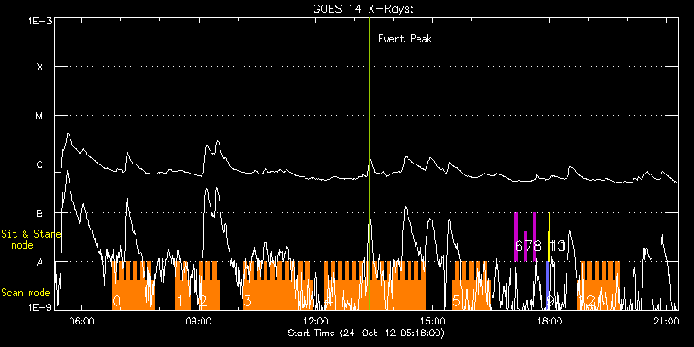 EIS Observation timeline overlay to GOES-Xray curve Code 1" 2" 40" 266" EIS Observations list for this event: STUDY ACRONYM ID DATE OBSERVED DESCRIPTION NOAA# TARGET 0 HH_Flare+AR_180x152 | 30170 | 2012/10/24 06:47:13 | MMMF on AR11598 | 1598 | Flare TIMELINE ID DATE OBSERVED FITS FILE XCEN (+W/-E) YCEN (+N/-S) DUR ----------------------------------------------------------------------------------------------------------------- 30170 | 2012/10/24 06:47:13.000 | eis_l0_20121024_064713.fits.gz | -655.74 | -294.20 | 5m18s 30170 | 2012/10/24 06:52:34.000 | eis_l0_20121024_065234.fits.gz | -655.04 | -294.27 | 5m18s 30170 | 2012/10/24 06:57:54.000 | eis_l0_20121024_065754.fits.gz | -654.50 | -294.27 | 5m18s 30170 | 2012/10/24 07:03:15.000 | eis_l0_20121024_070315.fits.gz | -653.88 | -294.35 | 5m17s 30170 | 2012/10/24 07:08:35.000 | eis_l0_20121024_070835.fits.gz | -653.34 | -294.43 | 5m19s 30170 | 2012/10/24 07:13:57.000 | eis_l0_20121024_071357.fits.gz | -652.80 | -294.50 | 5m18s 30170 | 2012/10/24 07:19:18.000 | eis_l0_20121024_071918.fits.gz | -652.18 | -294.50 | 5m18s 30170 | 2012/10/24 07:24:38.000 | eis_l0_20121024_072438.fits.gz | -651.64 | -294.58 | 5m18s 30170 | 2012/10/24 07:29:58.000 | eis_l0_20121024_072958.fits.gz | -651.02 | -294.74 | 5m18s 30170 | 2012/10/24 07:35:19.000 | eis_l0_20121024_073519.fits.gz | -650.48 | -294.81 | 5m18s 30170 | 2012/10/24 07:40:40.000 | eis_l0_20121024_074040.fits.gz | -649.86 | -294.81 | 5m18s 30170 | 2012/10/24 07:46:00.000 | eis_l0_20121024_074600.fits.gz | -649.25 | -294.89 | 5m18s 1 HH_Flare+AR_180x152 | 30171 | 2012/10/24 08:24:40 | MMMF on AR11598 | 1598 | Flare TIMELINE ID DATE OBSERVED FITS FILE XCEN (+W/-E) YCEN (+N/-S) DUR ----------------------------------------------------------------------------------------------------------------- 30171 | 2012/10/24 08:24:40.000 | eis_l0_20121024_082440.fits.gz | -645.08 | -295.05 | 5m18s 30171 | 2012/10/24 08:30:01.000 | eis_l0_20121024_083001.fits.gz | -644.53 | -295.12 | 5m17s 30171 | 2012/10/24 08:35:21.000 | eis_l0_20121024_083521.fits.gz | -643.92 | -295.28 | 5m18s 30171 | 2012/10/24 08:40:42.000 | eis_l0_20121024_084042.fits.gz | -643.38 | -295.28 | 5m18s 2 HH_Flare+AR_180x152H | 30191 | 2012/10/24 09:00:13 | HOP222 | 1598 | Flare TIMELINE ID DATE OBSERVED FITS FILE XCEN (+W/-E) YCEN (+N/-S) DUR ----------------------------------------------------------------------------------------------------------------- 30191 | 2012/10/24 09:00:13.000 | eis_l0_20121024_090013.fits.gz | -641.14 | -295.43 | 5m18s 30191 | 2012/10/24 09:05:34.000 | eis_l0_20121024_090534.fits.gz | -640.59 | -295.59 | 5m18s 30191 | 2012/10/24 09:10:55.000 | eis_l0_20121024_091055.fits.gz | -639.90 | -295.59 | 5m18s 30191 | 2012/10/24 09:16:16.000 | eis_l0_20121024_091616.fits.gz | -639.36 | -295.66 | 5m18s 30191 | 2012/10/24 09:21:37.000 | eis_l0_20121024_092137.fits.gz | -638.82 | -295.66 | 5m18s 30191 | 2012/10/24 09:26:58.000 | eis_l0_20121024_092658.fits.gz | -638.20 | -295.66 | 5m17s 3 HH_Flare+AR_180x152H | 30192 | 2012/10/24 10:08:14 | HOP222 | 1598 | Flare TIMELINE ID DATE OBSERVED FITS FILE XCEN (+W/-E) YCEN (+N/-S) DUR ----------------------------------------------------------------------------------------------------------------- 30192 | 2012/10/24 10:08:14.000 | eis_l0_20121024_100814.fits.gz | -618.89 | -286.24 | 5m17s 30192 | 2012/10/24 10:13:34.000 | eis_l0_20121024_101334.fits.gz | -618.27 | -286.24 | 5m19s 30192 | 2012/10/24 10:18:56.000 | eis_l0_20121024_101856.fits.gz | -617.73 | -286.16 | 5m17s 30192 | 2012/10/24 10:24:16.000 | eis_l0_20121024_102416.fits.gz | -617.11 | -286.24 | 5m18s 30192 | 2012/10/24 10:29:37.000 | eis_l0_20121024_102937.fits.gz | -616.49 | -286.24 | 5m18s 30192 | 2012/10/24 10:34:58.000 | eis_l0_20121024_103458.fits.gz | -615.95 | -286.24 | 5m18s 30192 | 2012/10/24 10:40:19.000 | eis_l0_20121024_104019.fits.gz | -615.18 | -286.55 | 5m19s 30192 | 2012/10/24 10:45:40.000 | eis_l0_20121024_104540.fits.gz | -614.56 | -286.47 | 5m18s 30192 | 2012/10/24 10:51:01.000 | eis_l0_20121024_105101.fits.gz | -614.02 | -286.55 | 5m18s 30192 | 2012/10/24 10:56:22.000 | eis_l0_20121024_105622.fits.gz | -613.33 | -286.62 | 5m18s 30192 | 2012/10/24 11:01:43.000 | eis_l0_20121024_110143.fits.gz | -612.86 | -286.47 | 5m17s 30192 | 2012/10/24 11:07:03.000 | eis_l0_20121024_110703.fits.gz | -612.17 | -286.55 | 5m19s 30192 | 2012/10/24 11:12:24.000 | eis_l0_20121024_111224.fits.gz | -611.55 | -286.62 | 5m18s 30192 | 2012/10/24 11:17:45.000 | eis_l0_20121024_111745.fits.gz | -610.93 | -286.70 | 5m17s 30192 | 2012/10/24 11:23:05.000 | eis_l0_20121024_112305.fits.gz | -610.31 | -286.62 | 5m18s 30192 | 2012/10/24 11:28:26.000 | eis_l0_20121024_112826.fits.gz | -609.70 | -286.78 | 5m17s 30192 | 2012/10/24 11:33:46.000 | eis_l0_20121024_113346.fits.gz | -609.08 | -286.86 | 5m18s 30192 | 2012/10/24 11:39:06.000 | eis_l0_20121024_113906.fits.gz | -608.54 | -286.78 | 5m19s 30192 | 2012/10/24 11:44:28.000 | eis_l0_20121024_114428.fits.gz | -607.92 | -286.86 | 5m17s 30192 | 2012/10/24 11:49:48.000 | eis_l0_20121024_114948.fits.gz | -607.22 | -287.01 | 5m18s 4 HH_Flare+AR_180x152 | 30193 | 2012/10/24 12:13:13 | MMMF on AR11598 | 1598 | Flare TIMELINE ID DATE OBSERVED FITS FILE XCEN (+W/-E) YCEN (+N/-S) DUR ----------------------------------------------------------------------------------------------------------------- 30193 | 2012/10/24 12:13:13.000 | eis_l0_20121024_121313.fits.gz | -604.60 | -287.09 | 5m18s 30193 | 2012/10/24 12:18:34.000 | eis_l0_20121024_121834.fits.gz | -603.90 | -287.17 | 5m18s 30193 | 2012/10/24 12:23:55.000 | eis_l0_20121024_122355.fits.gz | -603.28 | -287.24 | 5m19s 30193 | 2012/10/24 12:29:16.000 | eis_l0_20121024_122916.fits.gz | -602.67 | -287.32 | 5m19s 30193 | 2012/10/24 12:34:37.000 | eis_l0_20121024_123437.fits.gz | -602.05 | -287.32 | 5m18s 30193 | 2012/10/24 12:39:58.000 | eis_l0_20121024_123958.fits.gz | -601.43 | -287.32 | 5m19s 30193 | 2012/10/24 12:45:19.000 | eis_l0_20121024_124519.fits