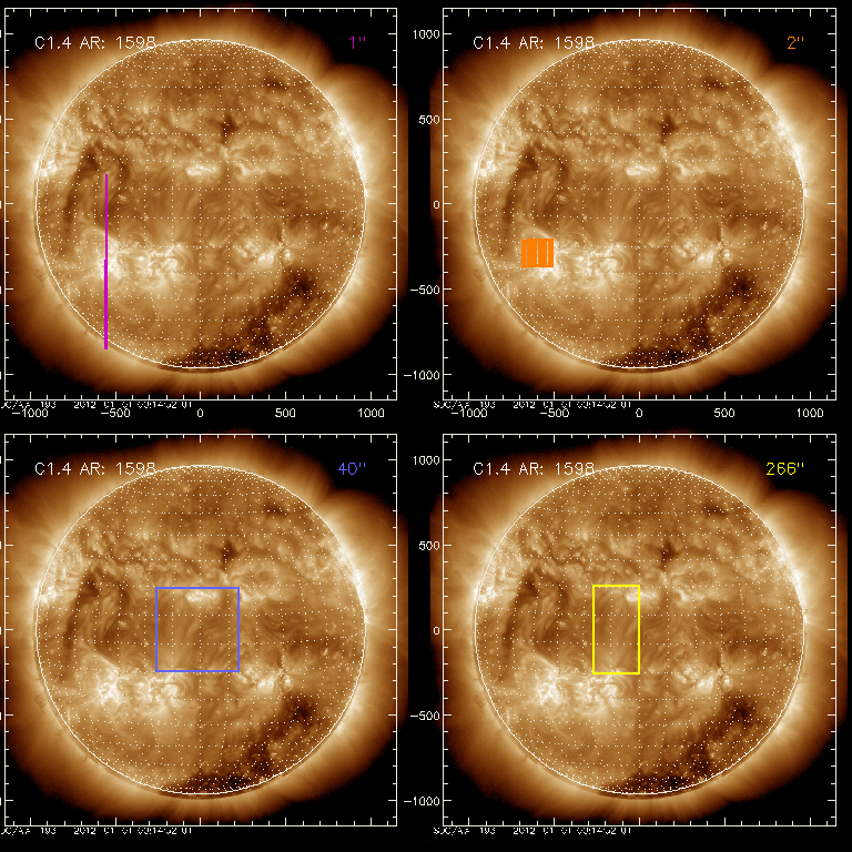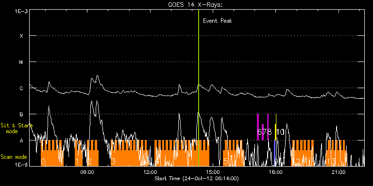 EIS Observation timeline overlay to GOES-Xray curve Code 1" 2" 40" 266" EIS Observations list for this event: STUDY ACRONYM ID DATE OBSERVED DESCRIPTION NOAA# TARGET 0 HH_Flare+AR_180x152 | 30170 | 2012/10/24 06:47:13 | MMMF on AR11598 | 1598 | Flare TIMELINE ID DATE OBSERVED FITS FILE XCEN (+W/-E) YCEN (+N/-S) DUR ----------------------------------------------------------------------------------------------------------------- 30170 | 2012/10/24 06:47:13.000 | eis_l0_20121024_064713.fits.gz | -655.74 | -294.20 | 5m18s 30170 | 2012/10/24 06:52:34.000 | eis_l0_20121024_065234.fits.gz | -655.04 | -294.27 | 5m18s 30170 | 2012/10/24 06:57:54.000 | eis_l0_20121024_065754.fits.gz | -654.50 | -294.27 | 5m18s 30170 | 2012/10/24 07:03:15.000 | eis_l0_20121024_070315.fits.gz | -653.88 | -294.35 | 5m17s 30170 | 2012/10/24 07:08:35.000 | eis_l0_20121024_070835.fits.gz | -653.34 | -294.43 | 5m19s 30170 | 2012/10/24 07:13:57.000 | eis_l0_20121024_071357.fits.gz | -652.80 | -294.50 | 5m18s 30170 | 2012/10/24 07:19:18.000 | eis_l0_20121024_071918.fits.gz | -652.18 | -294.50 | 5m18s 30170 | 2012/10/24 07:24:38.000 | eis_l0_20121024_072438.fits.gz | -651.64 | -294.58 | 5m18s 30170 | 2012/10/24 07:29:58.000 | eis_l0_20121024_072958.fits.gz | -651.02 | -294.74 | 5m18s 30170 | 2012/10/24 07:35:19.000 | eis_l0_20121024_073519.fits.gz | -650.48 | -294.81 | 5m18s 30170 | 2012/10/24 07:40:40.000 | eis_l0_20121024_074040.fits.gz | -649.86 | -294.81 | 5m18s 30170 | 2012/10/24 07:46:00.000 | eis_l0_20121024_074600.fits.gz | -649.25 | -294.89 | 5m18s 1 HH_Flare+AR_180x152 | 30171 | 2012/10/24 08:24:40 | MMMF on AR11598 | 1598 | Flare TIMELINE ID DATE OBSERVED FITS FILE XCEN (+W/-E) YCEN (+N/-S) DUR ----------------------------------------------------------------------------------------------------------------- 30171 | 2012/10/24 08:24:40.000 | eis_l0_20121024_082440.fits.gz | -645.08 | -295.05 | 5m18s 30171 | 2012/10/24 08:30:01.000 | eis_l0_20121024_083001.fits.gz | -644.53 | -295.12 | 5m17s 30171 | 2012/10/24 08:35:21.000 | eis_l0_20121024_083521.fits.gz | -643.92 | -295.28 | 5m18s 30171 | 2012/10/24 08:40:42.000 | eis_l0_20121024_084042.fits.gz | -643.38 | -295.28 | 5m18s 2 HH_Flare+AR_180x152H | 30191 | 2012/10/24 09:00:13 | HOP222 | 1598 | Flare TIMELINE ID DATE OBSERVED FITS FILE XCEN (+W/-E) YCEN (+N/-S) DUR ----------------------------------------------------------------------------------------------------------------- 30191 | 2012/10/24 09:00:13.000 | eis_l0_20121024_090013.fits.gz | -641.14 | -295.43 | 5m18s 30191 | 2012/10/24 09:05:34.000 | eis_l0_20121024_090534.fits.gz | -640.59 | -295.59 | 5m18s 30191 | 2012/10/24 09:10:55.000 | eis_l0_20121024_091055.fits.gz | -639.90 | -295.59 | 5m18s 30191 | 2012/10/24 09:16:16.000 | eis_l0_20121024_091616.fits.gz | -639.36 | -295.66 | 5m18s 30191 | 2012/10/24 09:21:37.000 | eis_l0_20121024_092137.fits.gz | -638.82 | -295.66 | 5m18s 30191 | 2012/10/24 09:26:58.000 | eis_l0_20121024_092658.fits.gz | -638.20 | -295.66 | 5m17s 3 HH_Flare+AR_180x152H | 30192 | 2012/10/24 10:08:14 | HOP222 | 1598 | Flare TIMELINE ID DATE OBSERVED FITS FILE XCEN (+W/-E) YCEN (+N/-S) DUR ----------------------------------------------------------------------------------------------------------------- 30192 | 2012/10/24 10:08:14.000 | eis_l0_20121024_100814.fits.gz | -618.89 | -286.24 | 5m17s 30192 | 2012/10/24 10:13:34.000 | eis_l0_20121024_101334.fits.gz | -618.27 | -286.24 | 5m19s 30192 | 2012/10/24 10:18:56.000 | eis_l0_20121024_101856.fits.gz | -617.73 | -286.16 | 5m17s 30192 | 2012/10/24 10:24:16.000 | eis_l0_20121024_102416.fits.gz | -617.11 | -286.24 | 5m18s 30192 | 2012/10/24 10:29:37.000 | eis_l0_20121024_102937.fits.gz | -616.49 | -286.24 | 5m18s 30192 | 2012/10/24 10:34:58.000 | eis_l0_20121024_103458.fits.gz | -615.95 | -286.24 | 5m18s 30192 | 2012/10/24 10:40:19.000 | eis_l0_20121024_104019.fits.gz | -615.18 | -286.55 | 5m19s 30192 | 2012/10/24 10:45:40.000 | eis_l0_20121024_104540.fits.gz | -614.56 | -286.47 | 5m18s 30192 | 2012/10/24 10:51:01.000 | eis_l0_20121024_105101.fits.gz | -614.02 | -286.55 | 5m18s 30192 | 2012/10/24 10:56:22.000 | eis_l0_20121024_105622.fits.gz | -613.33 | -286.62 | 5m18s 30192 | 2012/10/24 11:01:43.000 | eis_l0_20121024_110143.fits.gz | -612.86 | -286.47 | 5m17s 30192 | 2012/10/24 11:07:03.000 | eis_l0_20121024_110703.fits.gz | -612.17 | -286.55 | 5m19s 30192 | 2012/10/24 11:12:24.000 | eis_l0_20121024_111224.fits.gz | -611.55 | -286.62 | 5m18s 30192 | 2012/10/24 11:17:45.000 | eis_l0_20121024_111745.fits.gz | -610.93 | -286.70 | 5m17s 30192 | 2012/10/24 11:23:05.000 | eis_l0_20121024_112305.fits.gz | -610.31 | -286.62 | 5m18s 30192 | 2012/10/24 11:28:26.000 | eis_l0_20121024_112826.fits.gz | -609.70 | -286.78 | 5m17s 30192 | 2012/10/24 11:33:46.000 | eis_l0_20121024_113346.fits.gz | -609.08 | -286.86 | 5m18s 30192 | 2012/10/24 11:39:06.000 | eis_l0_20121024_113906.fits.gz | -608.54 | -286.78 | 5m19s 30192 | 2012/10/24 11:44:28.000 | eis_l0_20121024_114428.fits.gz | -607.92 | -286.86 | 5m17s 30192 | 2012/10/24 11:49:48.000 | eis_l0_20121024_114948.fits.gz | -607.22 | -287.01 | 5m18s 4 HH_Flare+AR_180x152 | 30193 | 2012/10/24 12:13:13 | MMMF on AR11598 | 1598 | Flare TIMELINE ID DATE OBSERVED FITS FILE XCEN (+W/-E) YCEN (+N/-S) DUR ----------------------------------------------------------------------------------------------------------------- 30193 | 2012/10/24 12:13:13.000 | eis_l0_20121024_121313.fits.gz | -604.60 | -287.09 | 5m18s 30193 | 2012/10/24 12:18:34.000 | eis_l0_20121024_121834.fits.gz | -603.90 | -287.17 | 5m18s 30193 | 2012/10/24 12:23:55.000 | eis_l0_20121024_122355.fits.gz | -603.28 | -287.24 | 5m19s 30193 | 2012/10/24 12:29:16.000 | eis_l0_20121024_122916.fits.gz | -602.67 | -287.32 | 5m19s 30193 | 2012/10/24 12:34:37.000 | eis_l0_20121024_123437.fits.gz | -602.05 | -287.32 | 5m18s 30193 | 2012/10/24 12:39:58.000 | eis_l0_20121024_123958.fits.gz | -601.43 | -287.32 | 5m19s 30193 | 2012/10/24 12:45:19.000 | eis_l0_20121024_124519.fits