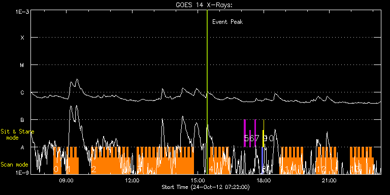 EIS Observation timeline overlay to GOES-Xray curve Code 1" 2" 40" 266" EIS Observations list for this event: STUDY ACRONYM ID DATE OBSERVED DESCRIPTION NOAA# TARGET 0 HH_Flare+AR_180x152 | 30171 | 2012/10/24 08:24:40 | MMMF on AR11598 | 1598 | Flare TIMELINE ID DATE OBSERVED FITS FILE XCEN (+W/-E) YCEN (+N/-S) DUR ----------------------------------------------------------------------------------------------------------------- 30171 | 2012/10/24 08:24:40.000 | eis_l0_20121024_082440.fits.gz | -645.08 | -295.05 | 5m18s 30171 | 2012/10/24 08:30:01.000 | eis_l0_20121024_083001.fits.gz | -644.53 | -295.12 | 5m17s 30171 | 2012/10/24 08:35:21.000 | eis_l0_20121024_083521.fits.gz | -643.92 | -295.28 | 5m18s 30171 | 2012/10/24 08:40:42.000 | eis_l0_20121024_084042.fits.gz | -643.38 | -295.28 | 5m18s 1 HH_Flare+AR_180x152H | 30191 | 2012/10/24 09:00:13 | HOP222 | 1598 | Flare TIMELINE ID DATE OBSERVED FITS FILE XCEN (+W/-E) YCEN (+N/-S) DUR ----------------------------------------------------------------------------------------------------------------- 30191 | 2012/10/24 09:00:13.000 | eis_l0_20121024_090013.fits.gz | -641.14 | -295.43 | 5m18s 30191 | 2012/10/24 09:05:34.000 | eis_l0_20121024_090534.fits.gz | -640.59 | -295.59 | 5m18s 30191 | 2012/10/24 09:10:55.000 | eis_l0_20121024_091055.fits.gz | -639.90 | -295.59 | 5m18s 30191 | 2012/10/24 09:16:16.000 | eis_l0_20121024_091616.fits.gz | -639.36 | -295.66 | 5m18s 30191 | 2012/10/24 09:21:37.000 | eis_l0_20121024_092137.fits.gz | -638.82 | -295.66 | 5m18s 30191 | 2012/10/24 09:26:58.000 | eis_l0_20121024_092658.fits.gz | -638.20 | -295.66 | 5m17s 2 HH_Flare+AR_180x152H | 30192 | 2012/10/24 10:08:14 | HOP222 | 1598 | Flare TIMELINE ID DATE OBSERVED FITS FILE XCEN (+W/-E) YCEN (+N/-S) DUR ----------------------------------------------------------------------------------------------------------------- 30192 | 2012/10/24 10:08:14.000 | eis_l0_20121024_100814.fits.gz | -618.89 | -286.24 | 5m17s 30192 | 2012/10/24 10:13:34.000 | eis_l0_20121024_101334.fits.gz | -618.27 | -286.24 | 5m19s 30192 | 2012/10/24 10:18:56.000 | eis_l0_20121024_101856.fits.gz | -617.73 | -286.16 | 5m17s 30192 | 2012/10/24 10:24:16.000 | eis_l0_20121024_102416.fits.gz | -617.11 | -286.24 | 5m18s 30192 | 2012/10/24 10:29:37.000 | eis_l0_20121024_102937.fits.gz | -616.49 | -286.24 | 5m18s 30192 | 2012/10/24 10:34:58.000 | eis_l0_20121024_103458.fits.gz | -615.95 | -286.24 | 5m18s 30192 | 2012/10/24 10:40:19.000 | eis_l0_20121024_104019.fits.gz | -615.18 | -286.55 | 5m19s 30192 | 2012/10/24 10:45:40.000 | eis_l0_20121024_104540.fits.gz | -614.56 | -286.47 | 5m18s 30192 | 2012/10/24 10:51:01.000 | eis_l0_20121024_105101.fits.gz | -614.02 | -286.55 | 5m18s 30192 | 2012/10/24 10:56:22.000 | eis_l0_20121024_105622.fits.gz | -613.33 | -286.62 | 5m18s 30192 | 2012/10/24 11:01:43.000 | eis_l0_20121024_110143.fits.gz | -612.86 | -286.47 | 5m17s 30192 | 2012/10/24 11:07:03.000 | eis_l0_20121024_110703.fits.gz | -612.17 | -286.55 | 5m19s 30192 | 2012/10/24 11:12:24.000 | eis_l0_20121024_111224.fits.gz | -611.55 | -286.62 | 5m18s 30192 | 2012/10/24 11:17:45.000 | eis_l0_20121024_111745.fits.gz | -610.93 | -286.70 | 5m17s 30192 | 2012/10/24 11:23:05.000 | eis_l0_20121024_112305.fits.gz | -610.31 | -286.62 | 5m18s 30192 | 2012/10/24 11:28:26.000 | eis_l0_20121024_112826.fits.gz | -609.70 | -286.78 | 5m17s 30192 | 2012/10/24 11:33:46.000 | eis_l0_20121024_113346.fits.gz | -609.08 | -286.86 | 5m18s 30192 | 2012/10/24 11:39:06.000 | eis_l0_20121024_113906.fits.gz | -608.54 | -286.78 | 5m19s 30192 | 2012/10/24 11:44:28.000 | eis_l0_20121024_114428.fits.gz | -607.92 | -286.86 | 5m17s 30192 | 2012/10/24 11:49:48.000 | eis_l0_20121024_114948.fits.gz | -607.22 | -287.01 | 5m18s 3 HH_Flare+AR_180x152 | 30193 | 2012/10/24 12:13:13 | MMMF on AR11598 | 1598 | Flare TIMELINE ID DATE OBSERVED FITS FILE XCEN (+W/-E) YCEN (+N/-S) DUR ----------------------------------------------------------------------------------------------------------------- 30193 | 2012/10/24 12:13:13.000 | eis_l0_20121024_121313.fits.gz | -604.60 | -287.09 | 5m18s 30193 | 2012/10/24 12:18:34.000 | eis_l0_20121024_121834.fits.gz | -603.90 | -287.17 | 5m18s 30193 | 2012/10/24 12:23:55.000 | eis_l0_20121024_122355.fits.gz | -603.28 | -287.24 | 5m19s 30193 | 2012/10/24 12:29:16.000 | eis_l0_20121024_122916.fits.gz | -602.67 | -287.32 | 5m19s 30193 | 2012/10/24 12:34:37.000 | eis_l0_20121024_123437.fits.gz | -602.05 | -287.32 | 5m18s 30193 | 2012/10/24 12:39:58.000 | eis_l0_20121024_123958.fits.gz | -601.43 | -287.32 | 5m19s 30193 | 2012/10/24 12:45:19.000 | eis_l0_20121024_124519.fits.gz | -600.81 | -287.48 | 5m18s 30193 | 2012/10/24 12:50:40.000 | eis_l0_20121024_125040.fits.gz | -600.20 | -287.48 | 5m18s 30193 | 2012/10/24 12:56:01.000 | eis_l0_20121024_125601.fits.gz | -599.73 | -287.48 | 5m18s 30193 | 2012/10/24 13:01:22.000 | eis_l0_20121024_130122.fits.gz | -598.96 | -287.48 | 5m17s 30193 | 2012/10/24 13:06:42.000 | eis_l0_20121024_130642.fits.gz | -598.42 | -287.48 | 5m18s 30193 | 2012/10/24 13:12:03.000 | eis_l0_20121024_131203.fits.gz | -597.72 | -287.63 | 5m18s 30193 | 2012/10/24 13:17:23.000 | eis_l0_20121024_131723.fits.gz | -597.10 | -287.63 | 5m18s 30193 | 2012/10/24 13:22:44.000 | eis_l0_20121024_132244.fits.gz | -596.49 | -287.55 | 5m19s 30193 | 2012/10/24 13:28:06.000 | eis_l0_20121024_132806.fits.gz | -595.79 | -287.71 | 5m17s 30193 | 2012/10/24 13:33:26.000 | eis_l0_20121024_133326.fits.gz | -595.33 | -287.78 | 5m18s 30193 | 2012/10/24 13:38:46.000 | eis_l0_20121024_133846.fits.gz | -594.55 | -288.02 | 5m19s 30193 | 2012/10/24 13:44:07.000 | eis_l0_20121024_134407.fits.gz | -593.94 | -287.86 | 5m18s 30193 | 2012/10/24 13:49:28.000 | eis_l0_20121024_134928.fits.gz | -593.40 | -287.86 | 5m18s 30193 | 2012/10/24 13:54:49.000 | eis_l0_20121024_135449.fits.gz | -592.70 | -287.94 | 5m18s 30193 | 2012/10/24 14:00:09.000 | eis_l0_20121024_140009.fits.gz | -592.08 | -288.02 | 5m19s 30193 | 2012/10/24 14:05:30.000 | eis_l0_201210