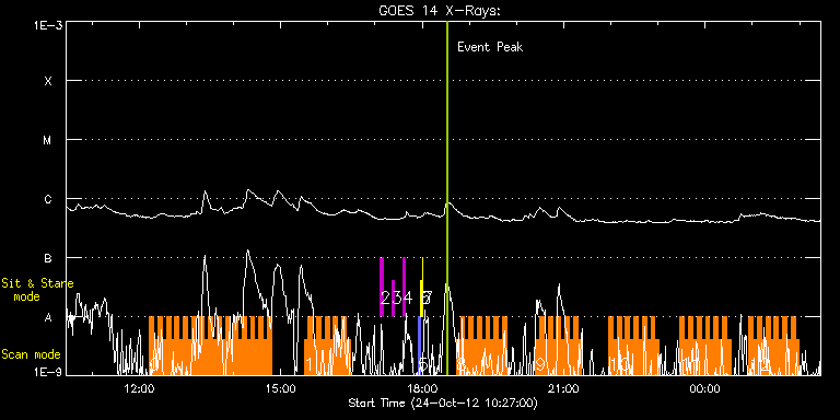 EIS Observation timeline overlay to GOES-Xray curve Code 1" 2" 40" 266" EIS Observations list for this event: STUDY ACRONYM ID DATE OBSERVED DESCRIPTION NOAA# TARGET 0 HH_Flare+AR_180x152 | 30193 | 2012/10/24 12:13:13 | MMMF on AR11598 | 1598 | Flare TIMELINE ID DATE OBSERVED FITS FILE XCEN (+W/-E) YCEN (+N/-S) DUR ----------------------------------------------------------------------------------------------------------------- 30193 | 2012/10/24 12:13:13.000 | eis_l0_20121024_121313.fits.gz | -604.60 | -287.09 | 5m18s 30193 | 2012/10/24 12:18:34.000 | eis_l0_20121024_121834.fits.gz | -603.90 | -287.17 | 5m18s 30193 | 2012/10/24 12:23:55.000 | eis_l0_20121024_122355.fits.gz | -603.28 | -287.24 | 5m19s 30193 | 2012/10/24 12:29:16.000 | eis_l0_20121024_122916.fits.gz | -602.67 | -287.32 | 5m19s 30193 | 2012/10/24 12:34:37.000 | eis_l0_20121024_123437.fits.gz | -602.05 | -287.32 | 5m18s 30193 | 2012/10/24 12:39:58.000 | eis_l0_20121024_123958.fits.gz | -601.43 | -287.32 | 5m19s 30193 | 2012/10/24 12:45:19.000 | eis_l0_20121024_124519.fits.gz | -600.81 | -287.48 | 5m18s 30193 | 2012/10/24 12:50:40.000 | eis_l0_20121024_125040.fits.gz | -600.20 | -287.48 | 5m18s 30193 | 2012/10/24 12:56:01.000 | eis_l0_20121024_125601.fits.gz | -599.73 | -287.48 | 5m18s 30193 | 2012/10/24 13:01:22.000 | eis_l0_20121024_130122.fits.gz | -598.96 | -287.48 | 5m17s 30193 | 2012/10/24 13:06:42.000 | eis_l0_20121024_130642.fits.gz | -598.42 | -287.48 | 5m18s 30193 | 2012/10/24 13:12:03.000 | eis_l0_20121024_131203.fits.gz | -597.72 | -287.63 | 5m18s 30193 | 2012/10/24 13:17:23.000 | eis_l0_20121024_131723.fits.gz | -597.10 | -287.63 | 5m18s 30193 | 2012/10/24 13:22:44.000 | eis_l0_20121024_132244.fits.gz | -596.49 | -287.55 | 5m19s 30193 | 2012/10/24 13:28:06.000 | eis_l0_20121024_132806.fits.gz | -595.79 | -287.71 | 5m17s 30193 | 2012/10/24 13:33:26.000 | eis_l0_20121024_133326.fits.gz | -595.33 | -287.78 | 5m18s 30193 | 2012/10/24 13:38:46.000 | eis_l0_20121024_133846.fits.gz | -594.55 | -288.02 | 5m19s 30193 | 2012/10/24 13:44:07.000 | eis_l0_20121024_134407.fits.gz | -593.94 | -287.86 | 5m18s 30193 | 2012/10/24 13:49:28.000 | eis_l0_20121024_134928.fits.gz | -593.40 | -287.86 | 5m18s 30193 | 2012/10/24 13:54:49.000 | eis_l0_20121024_135449.fits.gz | -592.70 | -287.94 | 5m18s 30193 | 2012/10/24 14:00:09.000 | eis_l0_20121024_140009.fits.gz | -592.08 | -288.02 | 5m19s 30193 | 2012/10/24 14:05:30.000 | eis_l0_20121024_140530.fits.gz | -591.47 | -288.02 | 5m19s 30193 | 2012/10/24 14:10:52.000 | eis_l0_20121024_141052.fits.gz | -590.77 | -288.09 | 5m17s 30193 | 2012/10/24 14:16:12.000 | eis_l0_20121024_141612.fits.gz | -590.15 | -288.09 | 5m18s 30193 | 2012/10/24 14:21:33.000 | eis_l0_20121024_142133.fits.gz | -589.61 | -288.17 | 5m18s 30193 | 2012/10/24 14:26:53.000 | eis_l0_20121024_142653.fits.gz | -588.99 | -288.17 | 5m18s 30193 | 2012/10/24 14:32:14.000 | eis_l0_20121024_143214.fits.gz | -588.30 | -288.40 | 5m18s 30193 | 2012/10/24 14:37:35.000 | eis_l0_20121024_143735.fits.gz | -587.68 | -288.33 | 5m19s 30193 | 2012/10/24 14:42:56.000 | eis_l0_20121024_144256.fits.gz | -587.06 | -288.33 | 5m19s 1 HH_Flare+AR_180x152 | 30173 | 2012/10/24 15:29:43 | MMMF on AR11598 | 1598 | Flare TIMELINE ID DATE OBSERVED FITS FILE XCEN (+W/-E) YCEN (+N/-S) DUR ----------------------------------------------------------------------------------------------------------------- 30173 | 2012/10/24 15:29:43.000 | eis_l0_20121024_152943.fits.gz | -581.58 | -288.63 | 5m18s 30173 | 2012/10/24 15:35:03.000 | eis_l0_20121024_153503.fits.gz | -580.88 | -288.79 | 5m19s 30173 | 2012/10/24 15:40:25.000 | eis_l0_20121024_154025.fits.gz | -580.27 | -288.79 | 5m18s 30173 | 2012/10/24 15:45:46.000 | eis_l0_20121024_154546.fits.gz | -579.65 | -288.79 | 5m18s 30173 | 2012/10/24 15:51:06.000 | eis_l0_20121024_155106.fits.gz | -578.95 | -288.86 | 5m18s 30173 | 2012/10/24 15:56:27.000 | eis_l0_20121024_155627.fits.gz | -578.41 | -288.94 | 5m18s 30173 | 2012/10/24 16:01:47.000 | eis_l0_20121024_160147.fits.gz | -577.72 | -289.02 | 5m18s 30173 | 2012/10/24 16:07:08.000 | eis_l0_20121024_160708.fits.gz | -577.02 | -289.02 | 5m18s 30173 | 2012/10/24 16:12:29.000 | eis_l0_20121024_161229.fits.gz | -576.48 | -288.94 | 5m18s 30173 | 2012/10/24 16:17:50.000 | eis_l0_20121024_161750.fits.gz | -575.78 | -289.10 | 5m18s 30173 | 2012/10/24 16:23:10.000 | eis_l0_20121024_162310.fits.gz | -575.09 | -289.02 | 5m18s 2 regcal071 | 30185 | 2012/10/24 17:06:41 | Dark exposures, CCD bottom rows (100s | | Engineering TIMELINE ID DATE OBSERVED FITS FILE XCEN (+W/-E) YCEN (+N/-S) DUR ----------------------------------------------------------------------------------------------------------------- 30185 | 2012/10/24 17:06:41.000 | eis_l0_20121024_170641.fits.gz | -553.10 | -594.41 | 3m22s 3 regcal072 | 30186 | 2012/10/24 17:21:01 | Dark exposures, top CCD rows (100s exp | | Engineering TIMELINE ID DATE OBSERVED FITS FILE XCEN (+W/-E) YCEN (+N/-S) DUR ----------------------------------------------------------------------------------------------------------------- 30186 | 2012/10/24 17:21:01.000 | eis_l0_20121024_172101.fits.gz | -551.33 | -83.48 | 3m22s 4 regcal074 | 30187 | 2012/10/24 17:35:21 | Dark exposures including overscan pixe | | Engineering TIMELINE ID DATE OBSERVED FITS FILE XCEN (+W/-E) YCEN (+N/-S) DUR ----------------------------------------------------------------------------------------------------------------- 30187 | 2012/10/24 17:35:21.000 | eis_l0_20121024_173521.fits.gz | -549.63 | -83.64 | 3m21s 5 PRY_slot_contextLITE | 30155 | 2012/10/24 17:54:49 | Change of EIS pointing and alignment w | 1596 | Active Region TIMELINE ID DATE OBSERVED FITS FILE XCEN (+W/-E) YCEN (+N/-S) DUR ----------------------------------------------------------------------------------------------------------------- 30155 | 2012/10/24 17:54:49.000 | eis_l0_20121024_175449.fits.gz | -15.21 | -0.42 | 2m57s 6 Alignment_266 | 30156 | 2012/10/24 17:58:04 | Change of EIS pointing and alignment
