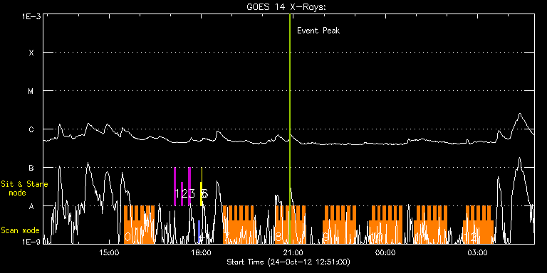 EIS Observation timeline overlay to GOES-Xray curve Code 1" 2" 40" 266" EIS Observations list for this event: STUDY ACRONYM ID DATE OBSERVED DESCRIPTION NOAA# TARGET 0 HH_Flare+AR_180x152 | 30173 | 2012/10/24 15:29:43 | MMMF on AR11598 | 1598 | Flare TIMELINE ID DATE OBSERVED FITS FILE XCEN (+W/-E) YCEN (+N/-S) DUR ----------------------------------------------------------------------------------------------------------------- 30173 | 2012/10/24 15:29:43.000 | eis_l0_20121024_152943.fits.gz | -581.58 | -288.63 | 5m18s 30173 | 2012/10/24 15:35:03.000 | eis_l0_20121024_153503.fits.gz | -580.88 | -288.79 | 5m19s 30173 | 2012/10/24 15:40:25.000 | eis_l0_20121024_154025.fits.gz | -580.27 | -288.79 | 5m18s 30173 | 2012/10/24 15:45:46.000 | eis_l0_20121024_154546.fits.gz | -579.65 | -288.79 | 5m18s 30173 | 2012/10/24 15:51:06.000 | eis_l0_20121024_155106.fits.gz | -578.95 | -288.86 | 5m18s 30173 | 2012/10/24 15:56:27.000 | eis_l0_20121024_155627.fits.gz | -578.41 | -288.94 | 5m18s 30173 | 2012/10/24 16:01:47.000 | eis_l0_20121024_160147.fits.gz | -577.72 | -289.02 | 5m18s 30173 | 2012/10/24 16:07:08.000 | eis_l0_20121024_160708.fits.gz | -577.02 | -289.02 | 5m18s 30173 | 2012/10/24 16:12:29.000 | eis_l0_20121024_161229.fits.gz | -576.48 | -288.94 | 5m18s 30173 | 2012/10/24 16:17:50.000 | eis_l0_20121024_161750.fits.gz | -575.78 | -289.10 | 5m18s 30173 | 2012/10/24 16:23:10.000 | eis_l0_20121024_162310.fits.gz | -575.09 | -289.02 | 5m18s 1 regcal071 | 30185 | 2012/10/24 17:06:41 | Dark exposures, CCD bottom rows (100s | | Engineering TIMELINE ID DATE OBSERVED FITS FILE XCEN (+W/-E) YCEN (+N/-S) DUR ----------------------------------------------------------------------------------------------------------------- 30185 | 2012/10/24 17:06:41.000 | eis_l0_20121024_170641.fits.gz | -553.10 | -594.41 | 3m22s 2 regcal072 | 30186 | 2012/10/24 17:21:01 | Dark exposures, top CCD rows (100s exp | | Engineering TIMELINE ID DATE OBSERVED FITS FILE XCEN (+W/-E) YCEN (+N/-S) DUR ----------------------------------------------------------------------------------------------------------------- 30186 | 2012/10/24 17:21:01.000 | eis_l0_20121024_172101.fits.gz | -551.33 | -83.48 | 3m22s 3 regcal074 | 30187 | 2012/10/24 17:35:21 | Dark exposures including overscan pixe | | Engineering TIMELINE ID DATE OBSERVED FITS FILE XCEN (+W/-E) YCEN (+N/-S) DUR ----------------------------------------------------------------------------------------------------------------- 30187 | 2012/10/24 17:35:21.000 | eis_l0_20121024_173521.fits.gz | -549.63 | -83.64 | 3m21s 4 PRY_slot_contextLITE | 30155 | 2012/10/24 17:54:49 | Change of EIS pointing and alignment w | 1596 | Active Region TIMELINE ID DATE OBSERVED FITS FILE XCEN (+W/-E) YCEN (+N/-S) DUR ----------------------------------------------------------------------------------------------------------------- 30155 | 2012/10/24 17:54:49.000 | eis_l0_20121024_175449.fits.gz | -15.21 | -0.42 | 2m57s 5 Alignment_266 | 30156 | 2012/10/24 17:58:04 | Change of EIS pointing and alignment w | 1596 | Quiet Sun TIMELINE ID DATE OBSERVED FITS FILE XCEN (+W/-E) YCEN (+N/-S) DUR ----------------------------------------------------------------------------------------------------------------- 30156 | 2012/10/24 17:58:04.000 | eis_l0_20121024_175804.fits.gz | -132.49 | -0.35 | 1m22s 6 XRT_synop_AIA | 30157 | 2012/10/24 18:00:38 | Change of EIS pointing and alignment w | 1596 | Quiet Sun TIMELINE ID DATE OBSERVED FITS FILE XCEN (+W/-E) YCEN (+N/-S) DUR ----------------------------------------------------------------------------------------------------------------- 30157 | 2012/10/24 18:00:38.000 | eis_l0_20121024_180038.fits.gz | -132.49 | -0.50 | 11s 7 HH_Flare+AR_180x152 | 30175 | 2012/10/24 18:43:19 | MMMF on AR11598 | | Flare TIMELINE ID DATE OBSERVED FITS FILE XCEN (+W/-E) YCEN (+N/-S) DUR ----------------------------------------------------------------------------------------------------------------- 30175 | 2012/10/24 18:43:19.000 | eis_l0_20121024_184319.fits.gz | -558.33 | -290.10 | 5m18s 30175 | 2012/10/24 18:48:39.000 | eis_l0_20121024_184839.fits.gz | -557.55 | -290.26 | 5m19s 30175 | 2012/10/24 18:54:01.000 | eis_l0_20121024_185401.fits.gz | -556.94 | -290.18 | 5m18s 30175 | 2012/10/24 18:59:21.000 | eis_l0_20121024_185921.fits.gz | -556.40 | -290.18 | 5m18s 30175 | 2012/10/24 19:04:42.000 | eis_l0_20121024_190442.fits.gz | -555.62 | -290.33 | 5m18s 30175 | 2012/10/24 19:10:03.000 | eis_l0_20121024_191003.fits.gz | -555.01 | -290.26 | 5m18s 30175 | 2012/10/24 19:15:23.000 | eis_l0_20121024_191523.fits.gz | -554.23 | -290.57 | 5m18s 30175 | 2012/10/24 19:20:44.000 | eis_l0_20121024_192044.fits.gz | -553.69 | -290.41 | 5m19s 30175 | 2012/10/24 19:26:05.000 | eis_l0_20121024_192605.fits.gz | -553.00 | -290.41 | 5m18s 30175 | 2012/10/24 19:31:26.000 | eis_l0_20121024_193126.fits.gz | -552.38 | -290.49 | 5m18s 30175 | 2012/10/24 19:36:47.000 | eis_l0_20121024_193647.fits.gz | -551.68 | -290.49 | 5m18s 30175 | 2012/10/24 19:42:08.000 | eis_l0_20121024_194208.fits.gz | -551.07 | -290.49 | 5m18s 8 HH_Flare+AR_180x152 | 30176 | 2012/10/24 20:24:09 | MMMF on AR11598 | 1598 | Flare TIMELINE ID DATE OBSERVED FITS FILE XCEN (+W/-E) YCEN (+N/-S) DUR ----------------------------------------------------------------------------------------------------------------- 30176 | 2012/10/24 20:24:09.000 | eis_l0_20121024_202409.fits.gz | -545.97 | -290.95 | 5m18s 30176 | 2012/10/24 20:29:30.000 | eis_l0_20121024_202930.fits.gz | -545.19 | -290.87 | 5m17s 30176 | 2012/10/24 20:34:50.000 | eis_l0_20121024_203450.fits.gz | -544.58 | -290.95 | 5m18s 30176 | 2012/10/24 20:40:11.000 | eis_l0_20121024_204011.fits.gz | -543.88 | -291.03 | 5m18s 30176 | 2012/10/24 20:45:32.000 | eis_l0_20121024_204532.fits.gz | -543.26 | -290.95 | 5m17s 30176 | 2012/10/24 20:50:52.000 | eis_l0_20121024_205052.fits.gz | -542.65 | -291.03 | 5m18s 30176 | 2012/10/24 20:56:13.000 | eis_l0_20121024_205613.fits.gz | -542.03 | -291.03 | 5m18s 30