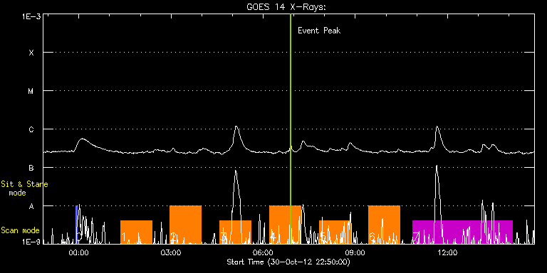 EIS Observation timeline overlay to GOES-Xray curve Code 1" 2" 40" 266" EIS Observations list for this event: STUDY ACRONYM ID DATE OBSERVED DESCRIPTION NOAA# TARGET 0 PRY_slot_context_v3 | 30319 | 2012/10/30 23:53:36 | Context for large raster | 1598 | Active Region TIMELINE ID DATE OBSERVED FITS FILE XCEN (+W/-E) YCEN (+N/-S) DUR ----------------------------------------------------------------------------------------------------------------- 30319 | 2012/10/30 23:53:36.000 | eis_l0_20121030_235336.fits.gz | 708.26 | -216.99 | 2m56s 1 dhb_atlas_120m_30" | 30320 | 2012/10/31 01:21:34 | Stitched-raster wide-FOV atlas spectru | 1598 | Quiet Sun TIMELINE ID DATE OBSERVED FITS FILE XCEN (+W/-E) YCEN (+N/-S) DUR ----------------------------------------------------------------------------------------------------------------- 30320 | 2012/10/31 01:21:34.000 | eis_l0_20121031_012134.fits.gz | 874.79 | -233.07 | 1h0m48s 2 dhb_atlas_120m_30" | 30321 | 2012/10/31 02:58:13 | Stitched-raster wide-FOV atlas spectru | | Quiet Sun TIMELINE ID DATE OBSERVED FITS FILE XCEN (+W/-E) YCEN (+N/-S) DUR ----------------------------------------------------------------------------------------------------------------- 30321 | 2012/10/31 02:58:13.000 | eis_l0_20121031_025813.fits.gz | 828.84 | -232.14 | 1h0m49s 3 dhb_atlas_120m_30" | 30322 | 2012/10/31 04:35:13 | Stitched-raster wide-FOV atlas spectru | | Quiet Sun TIMELINE ID DATE OBSERVED FITS FILE XCEN (+W/-E) YCEN (+N/-S) DUR ----------------------------------------------------------------------------------------------------------------- 30322 | 2012/10/31 04:35:13.000 | eis_l0_20121031_043513.fits.gz | 782.74 | -231.29 | 1h0m49s 4 dhb_atlas_120m_30" | 30323 | 2012/10/31 06:12:43 | Stitched-raster wide-FOV atlas spectru | 1598 | Quiet Sun TIMELINE ID DATE OBSERVED FITS FILE XCEN (+W/-E) YCEN (+N/-S) DUR ----------------------------------------------------------------------------------------------------------------- 30323 | 2012/10/31 06:12:43.000 | eis_l0_20121031_061243.fits.gz | 736.41 | -230.13 | 1h0m50s 5 dhb_atlas_120m_30" | 30324 | 2012/10/31 07:50:13 | Stitched-raster wide-FOV atlas spectru | | Quiet Sun TIMELINE ID DATE OBSERVED FITS FILE XCEN (+W/-E) YCEN (+N/-S) DUR ----------------------------------------------------------------------------------------------------------------- 30324 | 2012/10/31 07:50:13.000 | eis_l0_20121031_075013.fits.gz | 690.00 | -229.28 | 1h0m49s 6 dhb_atlas_120m_30" | 30325 | 2012/10/31 09:26:13 | Stitched-raster wide-FOV atlas spectru | | Quiet Sun TIMELINE ID DATE OBSERVED FITS FILE XCEN (+W/-E) YCEN (+N/-S) DUR ----------------------------------------------------------------------------------------------------------------- 30325 | 2012/10/31 09:26:13.000 | eis_l0_20121031_092613.fits.gz | 643.28 | -228.20 | 1h0m49s 7 SYNOP006 | 30317 | 2012/10/31 10:51:27 | Regular sensitivity monitoring | | Quiet Sun TIMELINE ID DATE OBSERVED FITS FILE XCEN (+W/-E) YCEN (+N/-S) DUR ----------------------------------------------------------------------------------------------------------------- 30317 | 2012/10/31 10:51:27.000 | eis_l0_20121031_105127.fits.gz | 119.26 | 61.90 | 3h15m35s : Check study information : Download file : View thumbnails For this event, also check for: