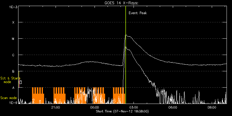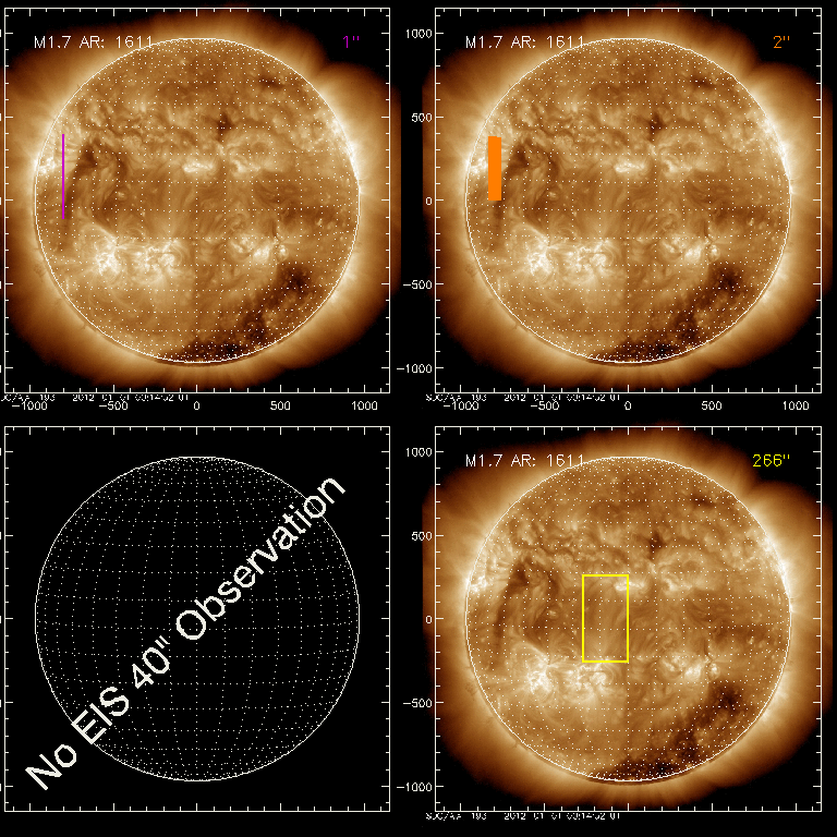 EIS Observation timeline overlay to GOES-Xray curve Code 1" 2" 40" 266" EIS Observations list for this event: STUDY ACRONYM ID DATE OBSERVED DESCRIPTION NOAA# TARGET 0 XRT_synop_AIA | 30381 | 2012/11/07 18:10:08 | Change of EIS pointing and alignment w | | Quiet Sun TIMELINE ID DATE OBSERVED FITS FILE XCEN (+W/-E) YCEN (+N/-S) DUR ----------------------------------------------------------------------------------------------------------------- 30381 | 2012/11/07 18:10:08.000 | eis_l0_20121107_181008.fits.gz | -132.57 | -0.50 | 10s 1 regcal076 | 30383 | 2012/11/07 18:14:11 | Flatfield, 1 exposure, led 100ms, ccd | | Engineering TIMELINE ID DATE OBSERVED FITS FILE XCEN (+W/-E) YCEN (+N/-S) DUR ----------------------------------------------------------------------------------------------------------------- 30383 | 2012/11/07 18:14:11.000 | eis_l0_20121107_181411.fits.gz | -797.05 | 137.68 | 1s 2 IUU_SCAN_STEPS_002 | 30394 | 2012/11/07 19:12:19 | Active Region Studies | | Active Region TIMELINE ID DATE OBSERVED FITS FILE XCEN (+W/-E) YCEN (+N/-S) DUR ----------------------------------------------------------------------------------------------------------------- 30394 | 2012/11/07 19:12:19.000 | eis_l0_20121107_191219.fits.gz | -808.55 | 186.75 | 5m23s 30394 | 2012/11/07 19:17:46.000 | eis_l0_20121107_191746.fits.gz | -808.17 | 186.59 | 5m24s 30394 | 2012/11/07 19:23:13.000 | eis_l0_20121107_192313.fits.gz | -807.78 | 186.67 | 5m23s 30394 | 2012/11/07 19:28:39.000 | eis_l0_20121107_192839.fits.gz | -807.24 | 186.52 | 5m24s 30394 | 2012/11/07 19:34:06.000 | eis_l0_20121107_193406.fits.gz | -806.78 | 186.52 | 5m24s 30394 | 2012/11/07 19:39:33.000 | eis_l0_20121107_193933.fits.gz | -806.39 | 186.44 | 5m23s 30394 | 2012/11/07 19:45:00.000 | eis_l0_20121107_194500.fits.gz | -806.01 | 186.52 | 5m23s 30394 | 2012/11/07 19:50:27.000 | eis_l0_20121107_195027.fits.gz | -805.62 | 186.44 | 5m23s 30394 | 2012/11/07 19:55:53.000 | eis_l0_20121107_195553.fits.gz | -805.16 | 186.29 | 5m23s 30394 | 2012/11/07 20:01:20.000 | eis_l0_20121107_200120.fits.gz | -804.69 | 186.29 | 5m23s 3 IUU_SCAN_STEPS_002 | 30395 | 2012/11/07 20:50:10 | Active Region Studies | | Active Region TIMELINE ID DATE OBSERVED FITS FILE XCEN (+W/-E) YCEN (+N/-S) DUR ----------------------------------------------------------------------------------------------------------------- 30395 | 2012/11/07 20:50:10.000 | eis_l0_20121107_205010.fits.gz | -808.83 | 185.98 | 5m24s 30395 | 2012/11/07 20:55:37.000 | eis_l0_20121107_205537.fits.gz | -808.44 | 185.82 | 5m23s 30395 | 2012/11/07 21:01:04.000 | eis_l0_20121107_210104.fits.gz | -807.98 | 185.90 | 5m23s 30395 | 2012/11/07 21:06:30.000 | eis_l0_20121107_210630.fits.gz | -807.59 | 185.90 | 5m24s 30395 | 2012/11/07 21:11:57.000 | eis_l0_20121107_211157.fits.gz | -807.13 | 185.74 | 5m24s 30395 | 2012/11/07 21:17:24.000 | eis_l0_20121107_211724.fits.gz | -806.59 | 185.67 | 5m23s 30395 | 2012/11/07 21:22:51.000 | eis_l0_20121107_212251.fits.gz | -806.13 | 185.59 | 5m23s 30395 | 2012/11/07 21:28:18.000 | eis_l0_20121107_212818.fits.gz | -805.66 | 185.67 | 5m23s 30395 | 2012/11/07 21:33:44.000 | eis_l0_20121107_213344.fits.gz | -805.28 | 185.59 | 5m24s 30395 | 2012/11/07 21:39:11.000 | eis_l0_20121107_213911.fits.gz | -804.74 | 185.59 | 5m24s 4 IUU_SCAN_STEPS_002 | 30396 | 2012/11/07 22:26:08 | Active Region Studies | | Active Region TIMELINE ID DATE OBSERVED FITS FILE XCEN (+W/-E) YCEN (+N/-S) DUR ----------------------------------------------------------------------------------------------------------------- 30396 | 2012/11/07 22:26:08.000 | eis_l0_20121107_222608.fits.gz | -793.03 | 185.28 | 5m23s 30396 | 2012/11/07 22:31:35.000 | eis_l0_20121107_223135.fits.gz | -792.57 | 185.20 | 5m23s 30396 | 2012/11/07 22:37:01.000 | eis_l0_20121107_223701.fits.gz | -792.10 | 185.13 | 5m24s 30396 | 2012/11/07 22:42:28.000 | eis_l0_20121107_224228.fits.gz | -791.64 | 184.97 | 5m23s 30396 | 2012/11/07 22:47:55.000 | eis_l0_20121107_224755.fits.gz | -791.17 | 184.97 | 5m23s 30396 | 2012/11/07 22:53:21.000 | eis_l0_20121107_225321.fits.gz | -790.71 | 185.05 | 5m24s 30396 | 2012/11/07 22:58:48.000 | eis_l0_20121107_225848.fits.gz | -790.25 | 184.97 | 5m24s 30396 | 2012/11/07 23:04:15.000 | eis_l0_20121107_230415.fits.gz | -789.78 | 184.89 | 5m23s 30396 | 2012/11/07 23:09:42.000 | eis_l0_20121107_230942.fits.gz | -789.32 | 184.82 | 5m23s 30396 | 2012/11/07 23:15:09.000 | eis_l0_20121107_231509.fits.gz | -788.93 | 184.82 | 5m23s 5 IUU_SCAN_STEPS_002 | 30397 | 2012/11/07 23:52:38 | Active Region Studies | | Active Region TIMELINE ID DATE OBSERVED FITS FILE XCEN (+W/-E) YCEN (+N/-S) DUR ----------------------------------------------------------------------------------------------------------------- 30397 | 2012/11/07 23:52:38.000 | eis_l0_20121107_235238.fits.gz | -785.77 | 184.74 | 5m23s 30397 | 2012/11/07 23:58:05.000 | eis_l0_20121107_235805.fits.gz | -785.30 | 184.66 | 5m23s 30397 | 2012/11/08 00:03:32.000 | eis_l0_20121108_000332.fits.gz | -784.84 | 184.51 | 5m23s 30397 | 2012/11/08 00:08:59.000 | eis_l0_20121108_000859.fits.gz | -784.45 | 184.51 | 5m23s 30397 | 2012/11/08 00:14:25.000 | eis_l0_20121108_001425.fits.gz | -783.91 | 184.43 | 5m23s 30397 | 2012/11/08 00:19:52.000 | eis_l0_20121108_001952.fits.gz | -783.53 | 184.35 | 5m23s 30397 | 2012/11/08 00:25:19.000 | eis_l0_20121108_002519.fits.gz | -783.06 | 184.28 | 5m23s 30397 | 2012/11/08 00:30:45.000 | eis_l0_20121108_003045.fits.gz | -782.52 | 184.28 | 5m24s 30397 | 2012/11/08 00:36:12.000 | eis_l0_20121108_003612.fits.gz | -782.14 | 184.28 | 5m24s 30397 | 2012/11/08 00:41:39.000 | eis_l0_20121108_004139.fits.gz | -781.67 | 184.28 | 5m24s 6 IUU_SCAN_STEPS_002 | 30398 | 2012/11/08 01:24:38 | Active Region Studies | | Active Region TIMELINE ID DATE OBSERVED FITS FILE XCEN (+W/-E) YCEN (+N/-S) DUR ----------------------------------------------------------------------------------------------------------------- 30398 | 2012/11/08 01:24:38.000 | eis_l0_20121108_01