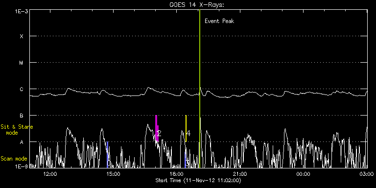 EIS Observation timeline overlay to GOES-Xray curve Code 1" 2" 40" 266" EIS Observations list for this event: STUDY ACRONYM ID DATE OBSERVED DESCRIPTION NOAA# TARGET 0 PRY_slot_contextLITE | 30455 | 2012/11/11 14:41:13 | Sit-and-Stare Observations of AR11611 | 1611 | Active Region TIMELINE ID DATE OBSERVED FITS FILE XCEN (+W/-E) YCEN (+N/-S) DUR ----------------------------------------------------------------------------------------------------------------- 30455 | 2012/11/11 14:41:13.000 | eis_l0_20121111_144113.fits.gz | -547.45 | 144.80 | 2m56s 1 regcal071 | 30429 | 2012/11/11 17:00:11 | Dark exposures, CCD bottom rows (100s | | Engineering TIMELINE ID DATE OBSERVED FITS FILE XCEN (+W/-E) YCEN (+N/-S) DUR ----------------------------------------------------------------------------------------------------------------- 30429 | 2012/11/11 17:00:11.000 | eis_l0_20121111_170011.fits.gz | -499.80 | -160.82 | 3m22s 2 regcal072 | 30430 | 2012/11/11 17:04:00 | Dark exposures, top CCD rows (100s exp | | Engineering TIMELINE ID DATE OBSERVED FITS FILE XCEN (+W/-E) YCEN (+N/-S) DUR ----------------------------------------------------------------------------------------------------------------- 30430 | 2012/11/11 17:04:00.000 | eis_l0_20121111_170400.fits.gz | -499.34 | 350.18 | 3m22s 3 PRY_slot_contextLITE | 30436 | 2012/11/11 18:23:14 | Change of EIS pointing and alignment w | | Active Region TIMELINE ID DATE OBSERVED FITS FILE XCEN (+W/-E) YCEN (+N/-S) DUR ----------------------------------------------------------------------------------------------------------------- 30436 | 2012/11/11 18:23:14.000 | eis_l0_20121111_182314.fits.gz | -15.14 | -0.42 | 2m56s 4 XRT_synop_AIA | 30437 | 2012/11/11 18:26:28 | Change of EIS pointing and alignment w | | Quiet Sun TIMELINE ID DATE OBSERVED FITS FILE XCEN (+W/-E) YCEN (+N/-S) DUR ----------------------------------------------------------------------------------------------------------------- 30437 | 2012/11/11 18:26:28.000 | eis_l0_20121111_182628.fits.gz | -132.57 | -0.42 | 10s : Check study information : Download file : View thumbnails For this event, also check for: