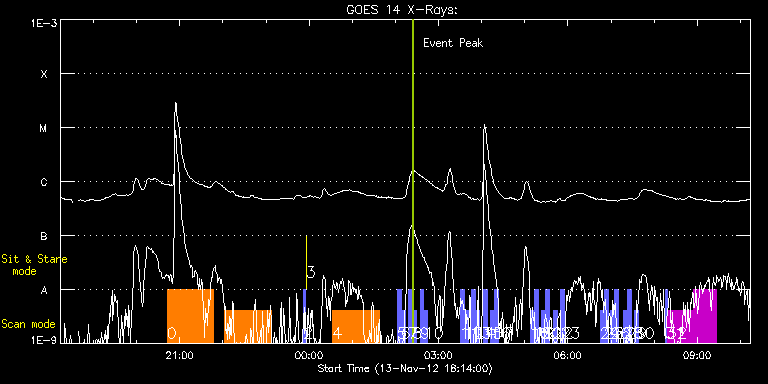 EIS Observation timeline overlay to GOES-Xray curve Code 1" 2" 40" 266" EIS Observations list for this event: STUDY ACRONYM ID DATE OBSERVED DESCRIPTION NOAA# TARGET 0 GDZ_PLUME1_2_300_50s | 30460 | 2012/11/13 20:42:13 | Coronal Hole Scan for HOP224 | | Coronal Hole TIMELINE ID DATE OBSERVED FITS FILE XCEN (+W/-E) YCEN (+N/-S) DUR ----------------------------------------------------------------------------------------------------------------- 30460 | 2012/11/13 20:42:13.000 | eis_l0_20121113_204213.fits.gz | -11.86 | 1083.58 | 1h4m53s 1 GDZ_PLUME1_2_300_50s | 30461 | 2012/11/13 22:02:13 | Cavity Scan for HOP224 | | Coronal Hole TIMELINE ID DATE OBSERVED FITS FILE XCEN (+W/-E) YCEN (+N/-S) DUR ----------------------------------------------------------------------------------------------------------------- 30461 | 2012/11/13 22:02:13.000 | eis_l0_20121113_220213.fits.gz | -451.05 | -829.14 | 1h4m51s 2 PRY_slot_contextLITE | 30462 | 2012/11/13 23:52:20 | Change of EIS pointing and alignment w | 1611 | Active Region TIMELINE ID DATE OBSERVED FITS FILE XCEN (+W/-E) YCEN (+N/-S) DUR ----------------------------------------------------------------------------------------------------------------- 30462 | 2012/11/13 23:52:20.000 | eis_l0_20121113_235220.fits.gz | -15.14 | -0.35 | 2m56s 3 XRT_synop_AIA | 30463 | 2012/11/13 23:55:35 | Change of EIS pointing and alignment w | 1611 | Quiet Sun TIMELINE ID DATE OBSERVED FITS FILE XCEN (+W/-E) YCEN (+N/-S) DUR ----------------------------------------------------------------------------------------------------------------- 30463 | 2012/11/13 23:55:35.000 | eis_l0_20121113_235535.fits.gz | -132.57 | -0.35 | 10s 4 GDZ_PLUME1_2_300_50s | 30464 | 2012/11/14 00:32:20 | AR Near Limb for HOP224 | | Coronal Hole TIMELINE ID DATE OBSERVED FITS FILE XCEN (+W/-E) YCEN (+N/-S) DUR ----------------------------------------------------------------------------------------------------------------- 30464 | 2012/11/14 00:32:20.000 | eis_l0_20121114_003220.fits.gz | -928.57 | -495.68 | 1h4m51s 5 full_sun_slot_scan_1 | 30465 | 2012/11/14 02:02:20 | HOP130 | | Quiet Sun TIMELINE ID DATE OBSERVED FITS FILE XCEN (+W/-E) YCEN (+N/-S) DUR ----------------------------------------------------------------------------------------------------------------- 30465 | 2012/11/14 02:02:20.000 | eis_l0_20121114_020220.fits.gz | 914.31 | 185.73 | 5m27s 6 full_sun_slot_scan_1 | 30466 | 2012/11/14 02:07:52 | HOP130 | | Quiet Sun TIMELINE ID DATE OBSERVED FITS FILE XCEN (+W/-E) YCEN (+N/-S) DUR ----------------------------------------------------------------------------------------------------------------- 30466 | 2012/11/14 02:07:52.000 | eis_l0_20121114_020752.fits.gz | 920.72 | -286.42 | 5m27s 7 full_sun_slot_scan_1 | 30467 | 2012/11/14 02:18:13 | HOP130 | 1611 | Quiet Sun TIMELINE ID DATE OBSERVED FITS FILE XCEN (+W/-E) YCEN (+N/-S) DUR ----------------------------------------------------------------------------------------------------------------- 30467 | 2012/11/14 02:18:13.000 | eis_l0_20121114_021813.fits.gz | 452.68 | 185.58 | 5m27s 8 full_sun_slot_scan_1 | 30468 | 2012/11/14 02:23:46 | HOP130 | 1610 | Quiet Sun TIMELINE ID DATE OBSERVED FITS FILE XCEN (+W/-E) YCEN (+N/-S) DUR ----------------------------------------------------------------------------------------------------------------- 30468 | 2012/11/14 02:23:46.000 | eis_l0_20121114_022346.fits.gz | 452.75 | -286.65 | 5m26s 9 full_sun_slot_scan_1 | 30469 | 2012/11/14 02:34:13 | HOP130 | 1611 | Quiet Sun TIMELINE ID DATE OBSERVED FITS FILE XCEN (+W/-E) YCEN (+N/-S) DUR ----------------------------------------------------------------------------------------------------------------- 30469 | 2012/11/14 02:34:13.000 | eis_l0_20121114_023413.fits.gz | -15.37 | 185.58 | 5m27s 10 full_sun_slot_scan_1 | 30470 | 2012/11/14 02:39:45 | HOP130 | | Quiet Sun TIMELINE ID DATE OBSERVED FITS FILE XCEN (+W/-E) YCEN (+N/-S) DUR ----------------------------------------------------------------------------------------------------------------- 30470 | 2012/11/14 02:39:45.000 | eis_l0_20121114_023945.fits.gz | -15.14 | -286.50 | 5m27s 11 full_sun_slot_scan_1 | 30471 | 2012/11/14 03:30:13 | HOP130 | 1614 | Quiet Sun TIMELINE ID DATE OBSERVED FITS FILE XCEN (+W/-E) YCEN (+N/-S) DUR ----------------------------------------------------------------------------------------------------------------- 30471 | 2012/11/14 03:30:13.000 | eis_l0_20121114_033013.fits.gz | -483.26 | 185.58 | 5m27s 12 full_sun_slot_scan_1 | 30472 | 2012/11/14 03:35:46 | HOP130 | 1613 | Quiet Sun TIMELINE ID DATE OBSERVED FITS FILE XCEN (+W/-E) YCEN (+N/-S) DUR ----------------------------------------------------------------------------------------------------------------- 30472 | 2012/11/14 03:35:46.000 | eis_l0_20121114_033546.fits.gz | -483.26 | -286.42 | 5m26s 13 full_sun_slot_scan_1 | 30473 | 2012/11/14 03:46:13 | HOP130 | | Quiet Sun TIMELINE ID DATE OBSERVED FITS FILE XCEN (+W/-E) YCEN (+N/-S) DUR ----------------------------------------------------------------------------------------------------------------- 30473 | 2012/11/14 03:46:13.000 | eis_l0_20121114_034613.fits.gz | -9884.69 | -9777.20 | 5m27s 14 full_sun_slot_scan_1 | 30474 | 2012/11/14 03:51:45 | HOP130 | | Quiet Sun TIMELINE ID DATE OBSERVED FITS FILE XCEN (+W/-E) YCEN (+N/-S) DUR ----------------------------------------------------------------------------------------------------------------- 30474 | 2012/11/14 03:51:45.000 | eis_l0_20121114_035145.fits.gz | -9884.69 | -10249.20 | 5m27s 15 full_sun_slot_scan_1 | 30475 | 2012/11/14 04:02:13 | HOP130 | | Quiet Sun TIMELINE ID DATE OBSERVED FITS FILE XCEN (+W/-E) YCEN (+N/-S) DUR ----------------------------------------------------------------------------------------------------------------- 30475 | 2012/11/14 04:02:13.000 | eis_l0_20121114_040213.fits.gz | 748.38 | 655.63 | 5m27s 16 full_sun_slot_scan_1 | 30476 | 2012/11/14 04:12:13 | HOP130 | | Quiet Sun TIMELINE ID DATE