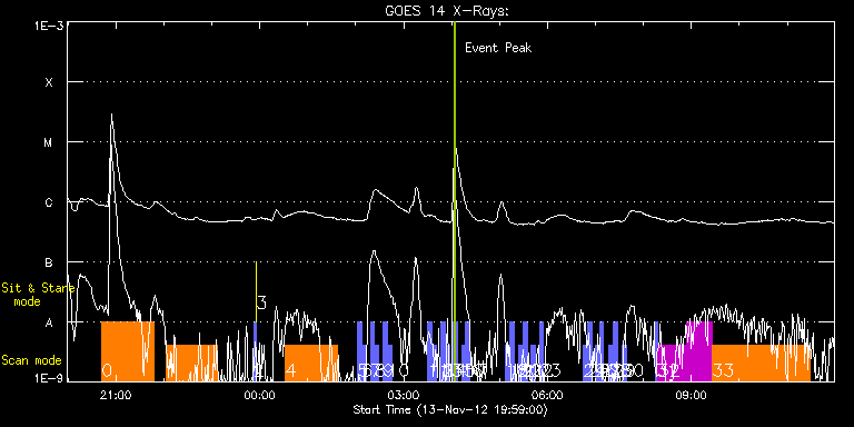 EIS Observation timeline overlay to GOES-Xray curve Code 1" 2" 40" 266" EIS Observations list for this event: STUDY ACRONYM ID DATE OBSERVED DESCRIPTION NOAA# TARGET 0 GDZ_PLUME1_2_300_50s | 30460 | 2012/11/13 20:42:13 | Coronal Hole Scan for HOP224 | | Coronal Hole TIMELINE ID DATE OBSERVED FITS FILE XCEN (+W/-E) YCEN (+N/-S) DUR ----------------------------------------------------------------------------------------------------------------- 30460 | 2012/11/13 20:42:13.000 | eis_l0_20121113_204213.fits.gz | -11.86 | 1083.58 | 1h4m53s 1 GDZ_PLUME1_2_300_50s | 30461 | 2012/11/13 22:02:13 | Cavity Scan for HOP224 | | Coronal Hole TIMELINE ID DATE OBSERVED FITS FILE XCEN (+W/-E) YCEN (+N/-S) DUR ----------------------------------------------------------------------------------------------------------------- 30461 | 2012/11/13 22:02:13.000 | eis_l0_20121113_220213.fits.gz | -451.05 | -829.14 | 1h4m51s 2 PRY_slot_contextLITE | 30462 | 2012/11/13 23:52:20 | Change of EIS pointing and alignment w | 1611 | Active Region TIMELINE ID DATE OBSERVED FITS FILE XCEN (+W/-E) YCEN (+N/-S) DUR ----------------------------------------------------------------------------------------------------------------- 30462 | 2012/11/13 23:52:20.000 | eis_l0_20121113_235220.fits.gz | -15.14 | -0.35 | 2m56s 3 XRT_synop_AIA | 30463 | 2012/11/13 23:55:35 | Change of EIS pointing and alignment w | 1611 | Quiet Sun TIMELINE ID DATE OBSERVED FITS FILE XCEN (+W/-E) YCEN (+N/-S) DUR ----------------------------------------------------------------------------------------------------------------- 30463 | 2012/11/13 23:55:35.000 | eis_l0_20121113_235535.fits.gz | -132.57 | -0.35 | 10s 4 GDZ_PLUME1_2_300_50s | 30464 | 2012/11/14 00:32:20 | AR Near Limb for HOP224 | | Coronal Hole TIMELINE ID DATE OBSERVED FITS FILE XCEN (+W/-E) YCEN (+N/-S) DUR ----------------------------------------------------------------------------------------------------------------- 30464 | 2012/11/14 00:32:20.000 | eis_l0_20121114_003220.fits.gz | -928.57 | -495.68 | 1h4m51s 5 full_sun_slot_scan_1 | 30465 | 2012/11/14 02:02:20 | HOP130 | | Quiet Sun TIMELINE ID DATE OBSERVED FITS FILE XCEN (+W/-E) YCEN (+N/-S) DUR ----------------------------------------------------------------------------------------------------------------- 30465 | 2012/11/14 02:02:20.000 | eis_l0_20121114_020220.fits.gz | 914.31 | 185.73 | 5m27s 6 full_sun_slot_scan_1 | 30466 | 2012/11/14 02:07:52 | HOP130 | | Quiet Sun TIMELINE ID DATE OBSERVED FITS FILE XCEN (+W/-E) YCEN (+N/-S) DUR ----------------------------------------------------------------------------------------------------------------- 30466 | 2012/11/14 02:07:52.000 | eis_l0_20121114_020752.fits.gz | 920.72 | -286.42 | 5m27s 7 full_sun_slot_scan_1 | 30467 | 2012/11/14 02:18:13 | HOP130 | 1611 | Quiet Sun TIMELINE ID DATE OBSERVED FITS FILE XCEN (+W/-E) YCEN (+N/-S) DUR ----------------------------------------------------------------------------------------------------------------- 30467 | 2012/11/14 02:18:13.000 | eis_l0_20121114_021813.fits.gz | 452.68 | 185.58 | 5m27s 8 full_sun_slot_scan_1 | 30468 | 2012/11/14 02:23:46 | HOP130 | 1610 | Quiet Sun TIMELINE ID DATE OBSERVED FITS FILE XCEN (+W/-E) YCEN (+N/-S) DUR ----------------------------------------------------------------------------------------------------------------- 30468 | 2012/11/14 02:23:46.000 | eis_l0_20121114_022346.fits.gz | 452.75 | -286.65 | 5m26s 9 full_sun_slot_scan_1 | 30469 | 2012/11/14 02:34:13 | HOP130 | 1611 | Quiet Sun TIMELINE ID DATE OBSERVED FITS FILE XCEN (+W/-E) YCEN (+N/-S) DUR ----------------------------------------------------------------------------------------------------------------- 30469 | 2012/11/14 02:34:13.000 | eis_l0_20121114_023413.fits.gz | -15.37 | 185.58 | 5m27s 10 full_sun_slot_scan_1 | 30470 | 2012/11/14 02:39:45 | HOP130 | | Quiet Sun TIMELINE ID DATE OBSERVED FITS FILE XCEN (+W/-E) YCEN (+N/-S) DUR ----------------------------------------------------------------------------------------------------------------- 30470 | 2012/11/14 02:39:45.000 | eis_l0_20121114_023945.fits.gz | -15.14 | -286.50 | 5m27s 11 full_sun_slot_scan_1 | 30471 | 2012/11/14 03:30:13 | HOP130 | 1614 | Quiet Sun TIMELINE ID DATE OBSERVED FITS FILE XCEN (+W/-E) YCEN (+N/-S) DUR ----------------------------------------------------------------------------------------------------------------- 30471 | 2012/11/14 03:30:13.000 | eis_l0_20121114_033013.fits.gz | -483.26 | 185.58 | 5m27s 12 full_sun_slot_scan_1 | 30472 | 2012/11/14 03:35:46 | HOP130 | 1613 | Quiet Sun TIMELINE ID DATE OBSERVED FITS FILE XCEN (+W/-E) YCEN (+N/-S) DUR ----------------------------------------------------------------------------------------------------------------- 30472 | 2012/11/14 03:35:46.000 | eis_l0_20121114_033546.fits.gz | -483.26 | -286.42 | 5m26s 13 full_sun_slot_scan_1 | 30473 | 2012/11/14 03:46:13 | HOP130 | | Quiet Sun TIMELINE ID DATE OBSERVED FITS FILE XCEN (+W/-E) YCEN (+N/-S) DUR ----------------------------------------------------------------------------------------------------------------- 30473 | 2012/11/14 03:46:13.000 | eis_l0_20121114_034613.fits.gz | -9884.69 | -9777.20 | 5m27s 14 full_sun_slot_scan_1 | 30474 | 2012/11/14 03:51:45 | HOP130 | | Quiet Sun TIMELINE ID DATE OBSERVED FITS FILE XCEN (+W/-E) YCEN (+N/-S) DUR ----------------------------------------------------------------------------------------------------------------- 30474 | 2012/11/14 03:51:45.000 | eis_l0_20121114_035145.fits.gz | -9884.69 | -10249.20 | 5m27s 15 full_sun_slot_scan_1 | 30475 | 2012/11/14 04:02:13 | HOP130 | | Quiet Sun TIMELINE ID DATE OBSERVED FITS FILE XCEN (+W/-E) YCEN (+N/-S) DUR ----------------------------------------------------------------------------------------------------------------- 30475 | 2012/11/14 04:02:13.000 | eis_l0_20121114_040213.fits.gz | 748.38 | 655.63 | 5m27s 16 full_sun_slot_scan_1 | 30476 | 2012/11/14 04:12:13 | HOP130 | | Quiet Sun TIMELINE ID DATE