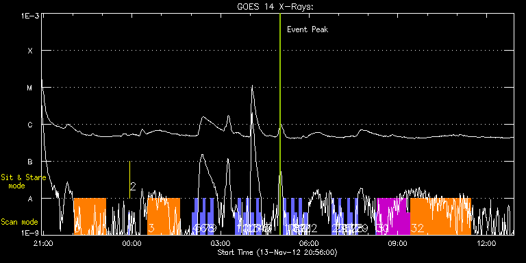 EIS Observation timeline overlay to GOES-Xray curve Code 1" 2" 40" 266" EIS Observations list for this event: STUDY ACRONYM ID DATE OBSERVED DESCRIPTION NOAA# TARGET 0 GDZ_PLUME1_2_300_50s | 30461 | 2012/11/13 22:02:13 | Cavity Scan for HOP224 | | Coronal Hole TIMELINE ID DATE OBSERVED FITS FILE XCEN (+W/-E) YCEN (+N/-S) DUR ----------------------------------------------------------------------------------------------------------------- 30461 | 2012/11/13 22:02:13.000 | eis_l0_20121113_220213.fits.gz | -451.05 | -829.14 | 1h4m51s 1 PRY_slot_contextLITE | 30462 | 2012/11/13 23:52:20 | Change of EIS pointing and alignment w | 1611 | Active Region TIMELINE ID DATE OBSERVED FITS FILE XCEN (+W/-E) YCEN (+N/-S) DUR ----------------------------------------------------------------------------------------------------------------- 30462 | 2012/11/13 23:52:20.000 | eis_l0_20121113_235220.fits.gz | -15.14 | -0.35 | 2m56s 2 XRT_synop_AIA | 30463 | 2012/11/13 23:55:35 | Change of EIS pointing and alignment w | 1611 | Quiet Sun TIMELINE ID DATE OBSERVED FITS FILE XCEN (+W/-E) YCEN (+N/-S) DUR ----------------------------------------------------------------------------------------------------------------- 30463 | 2012/11/13 23:55:35.000 | eis_l0_20121113_235535.fits.gz | -132.57 | -0.35 | 10s 3 GDZ_PLUME1_2_300_50s | 30464 | 2012/11/14 00:32:20 | AR Near Limb for HOP224 | | Coronal Hole TIMELINE ID DATE OBSERVED FITS FILE XCEN (+W/-E) YCEN (+N/-S) DUR ----------------------------------------------------------------------------------------------------------------- 30464 | 2012/11/14 00:32:20.000 | eis_l0_20121114_003220.fits.gz | -928.57 | -495.68 | 1h4m51s 4 full_sun_slot_scan_1 | 30465 | 2012/11/14 02:02:20 | HOP130 | | Quiet Sun TIMELINE ID DATE OBSERVED FITS FILE XCEN (+W/-E) YCEN (+N/-S) DUR ----------------------------------------------------------------------------------------------------------------- 30465 | 2012/11/14 02:02:20.000 | eis_l0_20121114_020220.fits.gz | 914.31 | 185.73 | 5m27s 5 full_sun_slot_scan_1 | 30466 | 2012/11/14 02:07:52 | HOP130 | | Quiet Sun TIMELINE ID DATE OBSERVED FITS FILE XCEN (+W/-E) YCEN (+N/-S) DUR ----------------------------------------------------------------------------------------------------------------- 30466 | 2012/11/14 02:07:52.000 | eis_l0_20121114_020752.fits.gz | 920.72 | -286.42 | 5m27s 6 full_sun_slot_scan_1 | 30467 | 2012/11/14 02:18:13 | HOP130 | 1611 | Quiet Sun TIMELINE ID DATE OBSERVED FITS FILE XCEN (+W/-E) YCEN (+N/-S) DUR ----------------------------------------------------------------------------------------------------------------- 30467 | 2012/11/14 02:18:13.000 | eis_l0_20121114_021813.fits.gz | 452.68 | 185.58 | 5m27s 7 full_sun_slot_scan_1 | 30468 | 2012/11/14 02:23:46 | HOP130 | 1610 | Quiet Sun TIMELINE ID DATE OBSERVED FITS FILE XCEN (+W/-E) YCEN (+N/-S) DUR ----------------------------------------------------------------------------------------------------------------- 30468 | 2012/11/14 02:23:46.000 | eis_l0_20121114_022346.fits.gz | 452.75 | -286.65 | 5m26s 8 full_sun_slot_scan_1 | 30469 | 2012/11/14 02:34:13 | HOP130 | 1611 | Quiet Sun TIMELINE ID DATE OBSERVED FITS FILE XCEN (+W/-E) YCEN (+N/-S) DUR ----------------------------------------------------------------------------------------------------------------- 30469 | 2012/11/14 02:34:13.000 | eis_l0_20121114_023413.fits.gz | -15.37 | 185.58 | 5m27s 9 full_sun_slot_scan_1 | 30470 | 2012/11/14 02:39:45 | HOP130 | | Quiet Sun TIMELINE ID DATE OBSERVED FITS FILE XCEN (+W/-E) YCEN (+N/-S) DUR ----------------------------------------------------------------------------------------------------------------- 30470 | 2012/11/14 02:39:45.000 | eis_l0_20121114_023945.fits.gz | -15.14 | -286.50 | 5m27s 10 full_sun_slot_scan_1 | 30471 | 2012/11/14 03:30:13 | HOP130 | 1614 | Quiet Sun TIMELINE ID DATE OBSERVED FITS FILE XCEN (+W/-E) YCEN (+N/-S) DUR ----------------------------------------------------------------------------------------------------------------- 30471 | 2012/11/14 03:30:13.000 | eis_l0_20121114_033013.fits.gz | -483.26 | 185.58 | 5m27s 11 full_sun_slot_scan_1 | 30472 | 2012/11/14 03:35:46 | HOP130 | 1613 | Quiet Sun TIMELINE ID DATE OBSERVED FITS FILE XCEN (+W/-E) YCEN (+N/-S) DUR ----------------------------------------------------------------------------------------------------------------- 30472 | 2012/11/14 03:35:46.000 | eis_l0_20121114_033546.fits.gz | -483.26 | -286.42 | 5m26s 12 full_sun_slot_scan_1 | 30473 | 2012/11/14 03:46:13 | HOP130 | | Quiet Sun TIMELINE ID DATE OBSERVED FITS FILE XCEN (+W/-E) YCEN (+N/-S) DUR ----------------------------------------------------------------------------------------------------------------- 30473 | 2012/11/14 03:46:13.000 | eis_l0_20121114_034613.fits.gz | -9884.69 | -9777.20 | 5m27s 13 full_sun_slot_scan_1 | 30474 | 2012/11/14 03:51:45 | HOP130 | | Quiet Sun TIMELINE ID DATE OBSERVED FITS FILE XCEN (+W/-E) YCEN (+N/-S) DUR ----------------------------------------------------------------------------------------------------------------- 30474 | 2012/11/14 03:51:45.000 | eis_l0_20121114_035145.fits.gz | -9884.69 | -10249.20 | 5m27s 14 full_sun_slot_scan_1 | 30475 | 2012/11/14 04:02:13 | HOP130 | | Quiet Sun TIMELINE ID DATE OBSERVED FITS FILE XCEN (+W/-E) YCEN (+N/-S) DUR ----------------------------------------------------------------------------------------------------------------- 30475 | 2012/11/14 04:02:13.000 | eis_l0_20121114_040213.fits.gz | 748.38 | 655.63 | 5m27s 15 full_sun_slot_scan_1 | 30476 | 2012/11/14 04:12:13 | HOP130 | | Quiet Sun TIMELINE ID DATE OBSERVED FITS FILE XCEN (+W/-E) YCEN (+N/-S) DUR ----------------------------------------------------------------------------------------------------------------- 30476 | 2012/11/14 04:12:13.000 | eis_l0_20121114_041213.fits.gz | 395.74 | 1032.83 | 5m27s 16 full_sun_slot_scan_1 | 30477 | 2012/11/14 04:17:45 | HOP130 | | Quiet Sun TIMELINE ID DATE OBSERVED FITS FILE XCEN (+