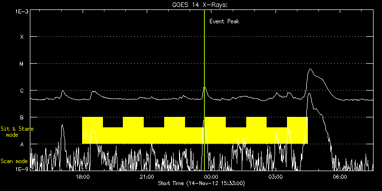 EIS Observation timeline overlay to GOES-Xray curve Code 1" 2" 40" 266" EIS Observations list for this event: STUDY ACRONYM ID DATE OBSERVED DESCRIPTION NOAA# TARGET 0 Flare266_Hunter02 | 30497 | 2012/11/14 17:58:49 | AR 11613 | 1613 | Flare TIMELINE ID DATE OBSERVED FITS FILE XCEN (+W/-E) YCEN (+N/-S) DUR ----------------------------------------------------------------------------------------------------------------- 30497 | 2012/11/14 17:58:49.000 | eis_l0_20121114_175849.fits.gz | -522.12 | -449.93 | 56m54s 30497 | 2012/11/14 18:56:10.000 | eis_l0_20121114_185610.fits.gz | -514.94 | -450.00 | 56m53s 30497 | 2012/11/14 19:53:30.000 | eis_l0_20121114_195330.fits.gz | -507.83 | -450.08 | 56m54s 30497 | 2012/11/14 20:50:51.000 | eis_l0_20121114_205051.fits.gz | -500.65 | -450.16 | 56m53s 30497 | 2012/11/14 21:48:11.000 | eis_l0_20121114_214811.fits.gz | -493.47 | -450.31 | 56m54s 30497 | 2012/11/14 22:45:32.000 | eis_l0_20121114_224532.fits.gz | -486.20 | -450.39 | 56m53s 30497 | 2012/11/14 23:42:52.000 | eis_l0_20121114_234252.fits.gz | -478.87 | -450.62 | 56m54s 30497 | 2012/11/15 00:40:13.000 | eis_l0_20121115_004013.fits.gz | -471.61 | -450.55 | 56m53s 30497 | 2012/11/15 01:37:33.000 | eis_l0_20121115_013733.fits.gz | -464.19 | -450.70 | 56m53s 30497 | 2012/11/15 02:34:53.000 | eis_l0_20121115_023453.fits.gz | -456.93 | -450.70 | 56m54s 30497 | 2012/11/15 03:32:14.000 | eis_l0_20121115_033214.fits.gz | -449.51 | -450.85 | 56m53s : Check study information : Download file : View thumbnails For this event, also check for: