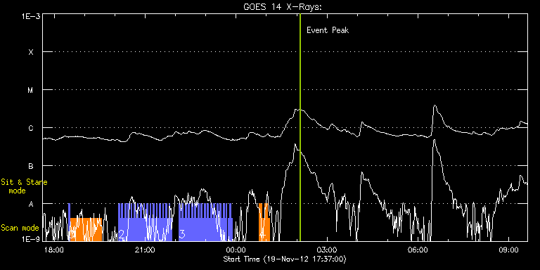 EIS Observation timeline overlay to GOES-Xray curve Code 1" 2" 40" 266" EIS Observations list for this event: STUDY ACRONYM ID DATE OBSERVED DESCRIPTION NOAA# TARGET 0 PRY_slot_context_v3 | 30528 | 2012/11/19 18:28:19 | Fe XIII cross calibration between COMP | 1612 | Active Region TIMELINE ID DATE OBSERVED FITS FILE XCEN (+W/-E) YCEN (+N/-S) DUR ----------------------------------------------------------------------------------------------------------------- 30528 | 2012/11/19 18:28:19.000 | eis_l0_20121119_182819.fits.gz | 884.80 | -67.68 | 2m55s 1 iiap_ch_ctxt_v2 | 30529 | 2012/11/19 18:32:31 | Fe XIII cross calibration between COMP | 1611 | Coronal Hole TIMELINE ID DATE OBSERVED FITS FILE XCEN (+W/-E) YCEN (+N/-S) DUR ----------------------------------------------------------------------------------------------------------------- 30529 | 2012/11/19 18:32:31.000 | eis_l0_20121119_183231.fits.gz | 979.58 | -55.60 | 1h1m52s 2 Alignment_modify_v2 | 30524 | 2012/11/19 20:06:49 | Co-alignment at North Pole | | Quiet Sun TIMELINE ID DATE OBSERVED FITS FILE XCEN (+W/-E) YCEN (+N/-S) DUR ----------------------------------------------------------------------------------------------------------------- 30524 | 2012/11/19 20:06:49.000 | eis_l0_20121119_200649.fits.gz | -9.55 | 944.55 | 2m34s 30524 | 2012/11/19 20:09:57.000 | eis_l0_20121119_200957.fits.gz | -9.47 | 944.47 | 2m34s 30524 | 2012/11/19 20:13:05.000 | eis_l0_20121119_201305.fits.gz | -9.55 | 944.55 | 2m33s 30524 | 2012/11/19 20:16:12.000 | eis_l0_20121119_201612.fits.gz | -9.55 | 944.55 | 2m34s 30524 | 2012/11/19 20:19:19.000 | eis_l0_20121119_201919.fits.gz | -9.47 | 944.47 | 2m34s 30524 | 2012/11/19 20:22:27.000 | eis_l0_20121119_202227.fits.gz | -9.55 | 944.70 | 2m34s 30524 | 2012/11/19 20:25:34.000 | eis_l0_20121119_202534.fits.gz | -9.63 | 944.47 | 2m34s 30524 | 2012/11/19 20:28:42.000 | eis_l0_20121119_202842.fits.gz | -9.47 | 944.47 | 2m34s 30524 | 2012/11/19 20:31:49.000 | eis_l0_20121119_203149.fits.gz | -9.55 | 944.55 | 2m34s 30524 | 2012/11/19 20:34:57.000 | eis_l0_20121119_203457.fits.gz | -9.55 | 944.55 | 2m34s 30524 | 2012/11/19 20:38:04.000 | eis_l0_20121119_203804.fits.gz | -9.55 | 944.47 | 2m34s 30524 | 2012/11/19 20:41:12.000 | eis_l0_20121119_204112.fits.gz | -9.55 | 944.55 | 2m34s 30524 | 2012/11/19 20:44:19.000 | eis_l0_20121119_204419.fits.gz | -9.55 | 944.55 | 2m34s 30524 | 2012/11/19 20:47:27.000 | eis_l0_20121119_204727.fits.gz | -9.55 | 944.62 | 2m34s 30524 | 2012/11/19 20:50:35.000 | eis_l0_20121119_205035.fits.gz | -9.55 | 944.55 | 2m34s 30524 | 2012/11/19 20:53:42.000 | eis_l0_20121119_205342.fits.gz | -9.55 | 944.39 | 2m34s 30524 | 2012/11/19 20:56:50.000 | eis_l0_20121119_205650.fits.gz | -9.55 | 944.55 | 2m34s 30524 | 2012/11/19 20:59:57.000 | eis_l0_20121119_205957.fits.gz | -9.47 | 944.55 | 2m34s 30524 | 2012/11/19 21:03:05.000 | eis_l0_20121119_210305.fits.gz | -9.47 | 944.55 | 2m34s 30524 | 2012/11/19 21:06:12.000 | eis_l0_20121119_210612.fits.gz | -9.55 | 944.55 | 2m34s 30524 | 2012/11/19 21:09:20.000 | eis_l0_20121119_210920.fits.gz | -9.55 | 944.62 | 2m34s 30524 | 2012/11/19 21:12:27.000 | eis_l0_20121119_211227.fits.gz | -9.47 | 944.55 | 2m34s 30524 | 2012/11/19 21:15:35.000 | eis_l0_20121119_211535.fits.gz | -9.47 | 944.47 | 2m34s 30524 | 2012/11/19 21:18:42.000 | eis_l0_20121119_211842.fits.gz | -9.47 | 944.55 | 2m34s 30524 | 2012/11/19 21:21:50.000 | eis_l0_20121119_212150.fits.gz | -9.55 | 944.47 | 2m34s 30524 | 2012/11/19 21:24:58.000 | eis_l0_20121119_212458.fits.gz | -9.47 | 944.47 | 2m34s 30524 | 2012/11/19 21:28:05.000 | eis_l0_20121119_212805.fits.gz | -9.47 | 944.55 | 2m34s 30524 | 2012/11/19 21:31:13.000 | eis_l0_20121119_213113.fits.gz | -9.39 | 944.47 | 2m34s 30524 | 2012/11/19 21:34:20.000 | eis_l0_20121119_213420.fits.gz | -9.55 | 944.47 | 2m34s 30524 | 2012/11/19 21:37:28.000 | eis_l0_20121119_213728.fits.gz | -9.39 | 944.55 | 2m34s 30524 | 2012/11/19 21:40:35.000 | eis_l0_20121119_214035.fits.gz | -9.55 | 944.55 | 2m34s 30524 | 2012/11/19 21:43:43.000 | eis_l0_20121119_214343.fits.gz | -9.55 | 944.55 | 2m34s 30524 | 2012/11/19 21:46:50.000 | eis_l0_20121119_214650.fits.gz | -9.55 | 944.55 | 2m34s 30524 | 2012/11/19 21:49:58.000 | eis_l0_20121119_214958.fits.gz | -9.55 | 944.62 | 2m34s 3 Alignment_modify_v2 | 30525 | 2012/11/19 22:06:43 | Co-alignment at East Limb | | Quiet Sun TIMELINE ID DATE OBSERVED FITS FILE XCEN (+W/-E) YCEN (+N/-S) DUR ----------------------------------------------------------------------------------------------------------------- 30525 | 2012/11/19 22:06:43.000 | eis_l0_20121119_220643.fits.gz | -9893.92 | -9963.20 | 2m34s 30525 | 2012/11/19 22:09:50.000 | eis_l0_20121119_220950.fits.gz | -9893.92 | -9963.20 | 2m34s 30525 | 2012/11/19 22:12:58.000 | eis_l0_20121119_221258.fits.gz | -9893.92 | -9963.20 | 2m33s 30525 | 2012/11/19 22:16:05.000 | eis_l0_20121119_221605.fits.gz | -9893.92 | -9963.20 | 2m34s 30525 | 2012/11/19 22:19:13.000 | eis_l0_20121119_221913.fits.gz | -9893.92 | -9963.20 | 2m34s 30525 | 2012/11/19 22:22:20.000 | eis_l0_20121119_222220.fits.gz | -9893.92 | -9963.20 | 2m34s 30525 | 2012/11/19 22:25:28.000 | eis_l0_20121119_222528.fits.gz | -9893.92 | -9963.20 | 2m34s 30525 | 2012/11/19 22:28:35.000 | eis_l0_20121119_222835.fits.gz | -9893.92 | -9963.20 | 2m34s 30525 | 2012/11/19 22:31:43.000 | eis_l0_20121119_223143.fits.gz | -9893.92 | -9963.20 | 2m34s 30525 | 2012/11/19 22:34:50.000 | eis_l0_20121119_223450.fits.gz | -9893.92 | -9963.20 | 2m34s 30525 | 2012/11/19 22:37:58.000 | eis_l0_20121119_223758.fits.gz | -9893.92 | -9963.20 | 2m34s 30525 | 2012/11/19 22:41:05.000 | eis_l0_20121119_224105.fits.gz | -9893.92 | -9963.20 | 2m34s 30525 | 2012/11/19 22:44:13.000 | eis_l0_20121119_224413.fits.gz | -9893.92 | -9963.20 | 2m34s 30525 | 2012/11/19 22:47:20.000 | eis_l0_20121119_224720.fits.gz | -9893.92 | -9963.20 | 2m34s 30525 | 2012/11/19 22:50:28.000 | eis_l0_20121119_225028.fits.gz | -9893.92 | -9963.20 | 2m34s 30525 | 2012/11/19 22:53:35.0