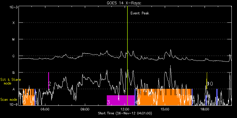 EIS Observation timeline overlay to GOES-Xray curve Code 1" 2" 40" 266" EIS Observations list for this event: STUDY ACRONYM ID DATE OBSERVED DESCRIPTION NOAA# TARGET 0 HH_Flare+AR_180x152 | 30755 | 2012/11/26 04:20:02 | AR 11618 Obs | 1618 | Flare TIMELINE ID DATE OBSERVED FITS FILE XCEN (+W/-E) YCEN (+N/-S) DUR ----------------------------------------------------------------------------------------------------------------- 30755 | 2012/11/26 04:20:02.000 | eis_l0_20121126_042002.fits.gz | 786.17 | 96.60 | 5m18s 30755 | 2012/11/26 04:25:23.000 | eis_l0_20121126_042523.fits.gz | 786.71 | 96.60 | 5m17s 30755 | 2012/11/26 04:30:43.000 | eis_l0_20121126_043043.fits.gz | 787.10 | 96.60 | 5m18s 30755 | 2012/11/26 04:36:04.000 | eis_l0_20121126_043604.fits.gz | 787.64 | 96.52 | 5m17s 30755 | 2012/11/26 04:41:24.000 | eis_l0_20121126_044124.fits.gz | 788.02 | 96.60 | 5m18s 30755 | 2012/11/26 04:46:45.000 | eis_l0_20121126_044645.fits.gz | 788.41 | 96.68 | 5m18s 30755 | 2012/11/26 04:52:06.000 | eis_l0_20121126_045206.fits.gz | 788.95 | 96.60 | 5m18s 30755 | 2012/11/26 04:57:27.000 | eis_l0_20121126_045727.fits.gz | 789.49 | 96.60 | 5m18s 30755 | 2012/11/26 05:02:48.000 | eis_l0_20121126_050248.fits.gz | 790.03 | 96.68 | 5m18s 30755 | 2012/11/26 05:08:09.000 | eis_l0_20121126_050809.fits.gz | 790.49 | 96.68 | 5m18s 1 PRY_slot_context_v3 | 30756 | 2012/11/26 05:13:38 | context for AR 11618 Obs | 1618 | Active Region TIMELINE ID DATE OBSERVED FITS FILE XCEN (+W/-E) YCEN (+N/-S) DUR ----------------------------------------------------------------------------------------------------------------- 30756 | 2012/11/26 05:13:38.000 | eis_l0_20121126_051338.fits.gz | 777.97 | 96.68 | 2m56s 2 regcal074 | 30766 | 2012/11/26 06:14:11 | Dark exposures including overscan pixe | | Engineering TIMELINE ID DATE OBSERVED FITS FILE XCEN (+W/-E) YCEN (+N/-S) DUR ----------------------------------------------------------------------------------------------------------------- 30766 | 2012/11/26 06:14:11.000 | eis_l0_20121126_061411.fits.gz | 813.17 | 303.06 | 3m22s 3 HPW021_VEL_240x512v1 | 30745 | 2012/11/26 10:39:19 | Limb-to-limb AR coverage - 11618 | 1618 | Active Region TIMELINE ID DATE OBSERVED FITS FILE XCEN (+W/-E) YCEN (+N/-S) DUR ----------------------------------------------------------------------------------------------------------------- 30745 | 2012/11/26 10:39:19.000 | eis_l0_20121126_103919.fits.gz | 820.83 | 98.07 | 2h3m48s 4 PRY_slot_context_v3 | 30746 | 2012/11/26 12:43:32 | context for Limb-to-limb AR coverage - | 1618 | Active Region TIMELINE ID DATE OBSERVED FITS FILE XCEN (+W/-E) YCEN (+N/-S) DUR ----------------------------------------------------------------------------------------------------------------- 30746 | 2012/11/26 12:43:32.000 | eis_l0_20121126_124332.fits.gz | 815.97 | 98.61 | 2m56s 5 PRY_slot_contextLITE | 30767 | 2012/11/26 12:53:39 | Slow mode oscillations in coronal flar | 1618 | Active Region TIMELINE ID DATE OBSERVED FITS FILE XCEN (+W/-E) YCEN (+N/-S) DUR ----------------------------------------------------------------------------------------------------------------- 30767 | 2012/11/26 12:53:39.000 | eis_l0_20121126_125339.fits.gz | 816.90 | 98.61 | 2m57s 6 hot_loop_osc_1_v4 | 30768 | 2012/11/26 12:57:01 | Slow mode oscillations in coronal flar | | Flare TIMELINE ID DATE OBSERVED FITS FILE XCEN (+W/-E) YCEN (+N/-S) DUR ----------------------------------------------------------------------------------------------------------------- 30768 | 2012/11/26 12:57:01.000 | eis_l0_20121126_125701.fits.gz | 830.79 | 98.61 | 1m56s 30768 | 2012/11/26 12:59:00.000 | eis_l0_20121126_125900.fits.gz | 831.03 | 98.53 | 1m55s 30768 | 2012/11/26 13:00:58.000 | eis_l0_20121126_130058.fits.gz | 831.10 | 98.69 | 1m55s 30768 | 2012/11/26 13:02:56.000 | eis_l0_20121126_130256.fits.gz | 831.26 | 98.76 | 1m55s 30768 | 2012/11/26 13:04:54.000 | eis_l0_20121126_130454.fits.gz | 831.49 | 98.69 | 1m55s 30768 | 2012/11/26 13:06:52.000 | eis_l0_20121126_130652.fits.gz | 831.57 | 98.69 | 1m55s 30768 | 2012/11/26 13:08:50.000 | eis_l0_20121126_130850.fits.gz | 831.80 | 98.69 | 1m55s 30768 | 2012/11/26 13:10:48.000 | eis_l0_20121126_131048.fits.gz | 831.88 | 98.69 | 1m56s 30768 | 2012/11/26 13:12:46.000 | eis_l0_20121126_131246.fits.gz | 832.03 | 98.61 | 1m55s 30768 | 2012/11/26 13:14:44.000 | eis_l0_20121126_131444.fits.gz | 832.26 | 98.76 | 1m55s 30768 | 2012/11/26 13:16:42.000 | eis_l0_20121126_131642.fits.gz | 832.42 | 98.61 | 1m56s 30768 | 2012/11/26 13:18:40.000 | eis_l0_20121126_131840.fits.gz | 832.57 | 98.84 | 1m55s 30768 | 2012/11/26 13:20:38.000 | eis_l0_20121126_132038.fits.gz | 832.72 | 98.69 | 1m56s 30768 | 2012/11/26 13:22:37.000 | eis_l0_20121126_132237.fits.gz | 832.80 | 98.84 | 1m54s 30768 | 2012/11/26 13:24:34.000 | eis_l0_20121126_132434.fits.gz | 832.96 | 98.84 | 1m55s 30768 | 2012/11/26 13:26:32.000 | eis_l0_20121126_132632.fits.gz | 833.19 | 98.76 | 1m56s 30768 | 2012/11/26 13:28:31.000 | eis_l0_20121126_132831.fits.gz | 833.27 | 98.84 | 1m55s 30768 | 2012/11/26 13:30:29.000 | eis_l0_20121126_133029.fits.gz | 833.34 | 98.76 | 1m55s 30768 | 2012/11/26 13:32:27.000 | eis_l0_20121126_133227.fits.gz | 833.73 | 98.76 | 1m55s 30768 | 2012/11/26 13:34:25.000 | eis_l0_20121126_133425.fits.gz | 833.81 | 98.92 | 1m55s 30768 | 2012/11/26 13:36:23.000 | eis_l0_20121126_133623.fits.gz | 833.96 | 98.84 | 1m55s 30768 | 2012/11/26 13:38:21.000 | eis_l0_20121126_133821.fits.gz | 834.04 | 98.84 | 1m55s 30768 | 2012/11/26 13:40:19.000 | eis_l0_20121126_134019.fits.gz | 834.19 | 98.84 | 1m56s 30768 | 2012/11/26 13:42:18.000 | eis_l0_20121126_134218.fits.gz | 834.42 | 98.84 | 1m54s 30768 | 2012/11/26 13:44:15.000 | eis_l0_20121126_134415.fits.gz | 834.50 | 98.92 | 1m56s 30768 | 2012/11/26 13:46:14.000 | eis_l0_20121126_134614.fits.gz | 834.73 | 98.92 | 1m55s 30768 | 2012/11/26 13:48:11.000 | eis_l0_20121126_134811.fits.gz | 834.89 | 98.84 | 1m56s 30768 | 2012/11/26 13:50:09.000 | eis_l0_20121126_135009.fits.g