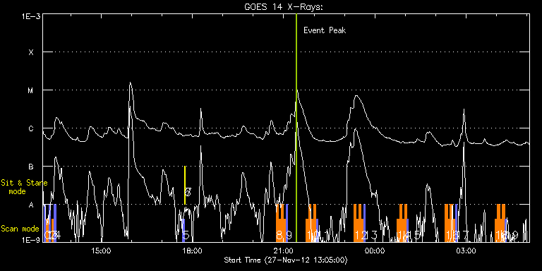 EIS Observation timeline overlay to GOES-Xray curve Code 1" 2" 40" 266" EIS Observations list for this event: STUDY ACRONYM ID DATE OBSERVED DESCRIPTION NOAA# TARGET 0 PRY_slot_contextLITE | 30867 | 2012/11/27 13:07:54 | HOP 79 - SOT irradiance scans (E-W) - | 1620 | Active Region TIMELINE ID DATE OBSERVED FITS FILE XCEN (+W/-E) YCEN (+N/-S) DUR ----------------------------------------------------------------------------------------------------------------- 30867 | 2012/11/27 13:07:54.000 | eis_l0_20121127_130754.fits.gz | 516.41 | -289.79 | 2m56s 1 SK_DEEP_10x512_SLIT2 | 30868 | 2012/11/27 13:12:34 | HOP 79 - SOT irradiance scans (E-W) | | Quiet Sun TIMELINE ID DATE OBSERVED FITS FILE XCEN (+W/-E) YCEN (+N/-S) DUR ----------------------------------------------------------------------------------------------------------------- 30868 | 2012/11/27 13:12:34.000 | eis_l0_20121127_131234.fits.gz | 714.14 | -285.54 | 5m8s 2 PRY_slot_contextLITE | 30869 | 2012/11/27 13:17:54 | HOP 79 - SOT irradiance scans (E-W) - | 1620 | Active Region TIMELINE ID DATE OBSERVED FITS FILE XCEN (+W/-E) YCEN (+N/-S) DUR ----------------------------------------------------------------------------------------------------------------- 30869 | 2012/11/27 13:17:54.000 | eis_l0_20121127_131754.fits.gz | 699.25 | -285.54 | 2m56s 3 SK_DEEP_10x512_SLIT2 | 30870 | 2012/11/27 13:22:34 | HOP 79 - SOT irradiance scans (E-W) | | Quiet Sun TIMELINE ID DATE OBSERVED FITS FILE XCEN (+W/-E) YCEN (+N/-S) DUR ----------------------------------------------------------------------------------------------------------------- 30870 | 2012/11/27 13:22:34.000 | eis_l0_20121127_132234.fits.gz | 899.15 | -245.84 | 5m8s 4 PRY_slot_contextLITE | 30871 | 2012/11/27 13:27:54 | HOP 79 - SOT irradiance scans (E-W) - | 1620 | Active Region TIMELINE ID DATE OBSERVED FITS FILE XCEN (+W/-E) YCEN (+N/-S) DUR ----------------------------------------------------------------------------------------------------------------- 30871 | 2012/11/27 13:27:54.000 | eis_l0_20121127_132754.fits.gz | 884.26 | -245.84 | 2m56s 5 PRY_slot_contextLITE | 30786 | 2012/11/27 17:41:08 | EIS/AIA alignment monitoring | | Active Region TIMELINE ID DATE OBSERVED FITS FILE XCEN (+W/-E) YCEN (+N/-S) DUR ----------------------------------------------------------------------------------------------------------------- 30786 | 2012/11/27 17:41:08.000 | eis_l0_20121127_174108.fits.gz | -15.29 | -0.58 | 2m56s 6 Alignment_266 | 30787 | 2012/11/27 17:44:22 | EIS/AIA alignment monitoring | | Quiet Sun TIMELINE ID DATE OBSERVED FITS FILE XCEN (+W/-E) YCEN (+N/-S) DUR ----------------------------------------------------------------------------------------------------------------- 30787 | 2012/11/27 17:44:22.000 | eis_l0_20121127_174422.fits.gz | -132.57 | -0.50 | 1m22s 7 XRT_synop_AIA | 30788 | 2012/11/27 17:46:29 | EIS/AIA alignment monitoring | | Quiet Sun TIMELINE ID DATE OBSERVED FITS FILE XCEN (+W/-E) YCEN (+N/-S) DUR ----------------------------------------------------------------------------------------------------------------- 30788 | 2012/11/27 17:46:29.000 | eis_l0_20121127_174629.fits.gz | -132.49 | -0.50 | 10s 8 AR_filament | 30872 | 2012/11/27 20:45:04 | AR 11618 observation with prominence | 1618 | Active Region TIMELINE ID DATE OBSERVED FITS FILE XCEN (+W/-E) YCEN (+N/-S) DUR ----------------------------------------------------------------------------------------------------------------- 30872 | 2012/11/27 20:45:04.000 | eis_l0_20121127_204504.fits.gz | 919.82 | 105.02 | 4m50s 30872 | 2012/11/27 20:49:57.000 | eis_l0_20121127_204957.fits.gz | 919.90 | 104.94 | 4m50s 30872 | 2012/11/27 20:54:50.000 | eis_l0_20121127_205450.fits.gz | 919.74 | 104.94 | 4m50s 30872 | 2012/11/27 20:59:43.000 | eis_l0_20121127_205943.fits.gz | 919.74 | 105.02 | 4m50s 9 PRY_slot_contextLITE | 30873 | 2012/11/27 21:04:44 | AR 11618 observation with prominence - | 1618 | Active Region TIMELINE ID DATE OBSERVED FITS FILE XCEN (+W/-E) YCEN (+N/-S) DUR ----------------------------------------------------------------------------------------------------------------- 30873 | 2012/11/27 21:04:44.000 | eis_l0_20121127_210444.fits.gz | 908.82 | 104.94 | 2m57s 10 AR_filament | 30874 | 2012/11/27 21:44:34 | AR 11618 observation with prominence | 1618 | Active Region TIMELINE ID DATE OBSERVED FITS FILE XCEN (+W/-E) YCEN (+N/-S) DUR ----------------------------------------------------------------------------------------------------------------- 30874 | 2012/11/27 21:44:34.000 | eis_l0_20121127_214434.fits.gz | 919.82 | 105.02 | 4m50s 30874 | 2012/11/27 21:49:27.000 | eis_l0_20121127_214927.fits.gz | 919.82 | 105.02 | 4m50s 30874 | 2012/11/27 21:54:20.000 | eis_l0_20121127_215420.fits.gz | 919.82 | 104.94 | 4m50s 30874 | 2012/11/27 21:59:13.000 | eis_l0_20121127_215913.fits.gz | 919.82 | 104.94 | 4m50s 11 PRY_slot_contextLITE | 30875 | 2012/11/27 22:04:14 | AR 11618 observation with prominence - | 1618 | Active Region TIMELINE ID DATE OBSERVED FITS FILE XCEN (+W/-E) YCEN (+N/-S) DUR ----------------------------------------------------------------------------------------------------------------- 30875 | 2012/11/27 22:04:14.000 | eis_l0_20121127_220414.fits.gz | 908.82 | 105.02 | 2m56s 12 AR_filament | 30876 | 2012/11/27 23:18:34 | AR 11618 observation with prominence | 1618 | Active Region TIMELINE ID DATE OBSERVED FITS FILE XCEN (+W/-E) YCEN (+N/-S) DUR ----------------------------------------------------------------------------------------------------------------- 30876 | 2012/11/27 23:18:34.000 | eis_l0_20121127_231834.fits.gz | 919.82 | 104.94 | 4m49s 30876 | 2012/11/27 23:23:26.000 | eis_l0_20121127_232326.fits.gz | 919.82 | 104.94 | 4m51s 30876 | 2012/11/27 23:28:20.000 | eis_l0_20121127_232820.fits.gz | 919.90 | 104.94 | 4m50s 30876 | 2012/11/27 23:33:13.000 | eis_l0_20121127_233313.fits.gz | 919.82 | 105.02 | 4m50s 13 PRY_slot_contextLITE | 30877 | 2012/11/27 23:38:14 | AR 11618 observation with prominence - 
