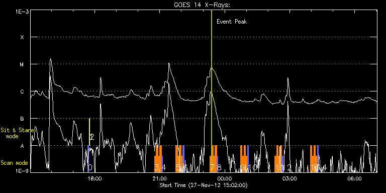 EIS Observation timeline overlay to GOES-Xray curve Code 1" 2" 40" 266" EIS Observations list for this event: STUDY ACRONYM ID DATE OBSERVED DESCRIPTION NOAA# TARGET 0 PRY_slot_contextLITE | 30786 | 2012/11/27 17:41:08 | EIS/AIA alignment monitoring | | Active Region TIMELINE ID DATE OBSERVED FITS FILE XCEN (+W/-E) YCEN (+N/-S) DUR ----------------------------------------------------------------------------------------------------------------- 30786 | 2012/11/27 17:41:08.000 | eis_l0_20121127_174108.fits.gz | -15.29 | -0.58 | 2m56s 1 Alignment_266 | 30787 | 2012/11/27 17:44:22 | EIS/AIA alignment monitoring | | Quiet Sun TIMELINE ID DATE OBSERVED FITS FILE XCEN (+W/-E) YCEN (+N/-S) DUR ----------------------------------------------------------------------------------------------------------------- 30787 | 2012/11/27 17:44:22.000 | eis_l0_20121127_174422.fits.gz | -132.57 | -0.50 | 1m22s 2 XRT_synop_AIA | 30788 | 2012/11/27 17:46:29 | EIS/AIA alignment monitoring | | Quiet Sun TIMELINE ID DATE OBSERVED FITS FILE XCEN (+W/-E) YCEN (+N/-S) DUR ----------------------------------------------------------------------------------------------------------------- 30788 | 2012/11/27 17:46:29.000 | eis_l0_20121127_174629.fits.gz | -132.49 | -0.50 | 10s 3 AR_filament | 30872 | 2012/11/27 20:45:04 | AR 11618 observation with prominence | 1618 | Active Region TIMELINE ID DATE OBSERVED FITS FILE XCEN (+W/-E) YCEN (+N/-S) DUR ----------------------------------------------------------------------------------------------------------------- 30872 | 2012/11/27 20:45:04.000 | eis_l0_20121127_204504.fits.gz | 919.82 | 105.02 | 4m50s 30872 | 2012/11/27 20:49:57.000 | eis_l0_20121127_204957.fits.gz | 919.90 | 104.94 | 4m50s 30872 | 2012/11/27 20:54:50.000 | eis_l0_20121127_205450.fits.gz | 919.74 | 104.94 | 4m50s 30872 | 2012/11/27 20:59:43.000 | eis_l0_20121127_205943.fits.gz | 919.74 | 105.02 | 4m50s 4 PRY_slot_contextLITE | 30873 | 2012/11/27 21:04:44 | AR 11618 observation with prominence - | 1618 | Active Region TIMELINE ID DATE OBSERVED FITS FILE XCEN (+W/-E) YCEN (+N/-S) DUR ----------------------------------------------------------------------------------------------------------------- 30873 | 2012/11/27 21:04:44.000 | eis_l0_20121127_210444.fits.gz | 908.82 | 104.94 | 2m57s 5 AR_filament | 30874 | 2012/11/27 21:44:34 | AR 11618 observation with prominence | 1618 | Active Region TIMELINE ID DATE OBSERVED FITS FILE XCEN (+W/-E) YCEN (+N/-S) DUR ----------------------------------------------------------------------------------------------------------------- 30874 | 2012/11/27 21:44:34.000 | eis_l0_20121127_214434.fits.gz | 919.82 | 105.02 | 4m50s 30874 | 2012/11/27 21:49:27.000 | eis_l0_20121127_214927.fits.gz | 919.82 | 105.02 | 4m50s 30874 | 2012/11/27 21:54:20.000 | eis_l0_20121127_215420.fits.gz | 919.82 | 104.94 | 4m50s 30874 | 2012/11/27 21:59:13.000 | eis_l0_20121127_215913.fits.gz | 919.82 | 104.94 | 4m50s 6 PRY_slot_contextLITE | 30875 | 2012/11/27 22:04:14 | AR 11618 observation with prominence - | 1618 | Active Region TIMELINE ID DATE OBSERVED FITS FILE XCEN (+W/-E) YCEN (+N/-S) DUR ----------------------------------------------------------------------------------------------------------------- 30875 | 2012/11/27 22:04:14.000 | eis_l0_20121127_220414.fits.gz | 908.82 | 105.02 | 2m56s 7 AR_filament | 30876 | 2012/11/27 23:18:34 | AR 11618 observation with prominence | 1618 | Active Region TIMELINE ID DATE OBSERVED FITS FILE XCEN (+W/-E) YCEN (+N/-S) DUR ----------------------------------------------------------------------------------------------------------------- 30876 | 2012/11/27 23:18:34.000 | eis_l0_20121127_231834.fits.gz | 919.82 | 104.94 | 4m49s 30876 | 2012/11/27 23:23:26.000 | eis_l0_20121127_232326.fits.gz | 919.82 | 104.94 | 4m51s 30876 | 2012/11/27 23:28:20.000 | eis_l0_20121127_232820.fits.gz | 919.90 | 104.94 | 4m50s 30876 | 2012/11/27 23:33:13.000 | eis_l0_20121127_233313.fits.gz | 919.82 | 105.02 | 4m50s 8 PRY_slot_contextLITE | 30877 | 2012/11/27 23:38:14 | AR 11618 observation with prominence - | 1618 | Active Region TIMELINE ID DATE OBSERVED FITS FILE XCEN (+W/-E) YCEN (+N/-S) DUR ----------------------------------------------------------------------------------------------------------------- 30877 | 2012/11/27 23:38:14.000 | eis_l0_20121127_233814.fits.gz | 908.82 | 105.02 | 2m57s 9 AR_filament | 30878 | 2012/11/28 00:43:33 | AR 11618 observation with prominence | 1618 | Active Region TIMELINE ID DATE OBSERVED FITS FILE XCEN (+W/-E) YCEN (+N/-S) DUR ----------------------------------------------------------------------------------------------------------------- 30878 | 2012/11/28 00:43:33.000 | eis_l0_20121128_004333.fits.gz | 919.74 | 105.18 | 4m50s 30878 | 2012/11/28 00:48:26.000 | eis_l0_20121128_004826.fits.gz | 919.90 | 105.02 | 4m51s 30878 | 2012/11/28 00:53:19.000 | eis_l0_20121128_005319.fits.gz | 919.82 | 105.02 | 4m51s 30878 | 2012/11/28 00:58:12.000 | eis_l0_20121128_005812.fits.gz | 919.82 | 104.94 | 4m51s 10 PRY_slot_contextLITE | 30879 | 2012/11/28 01:03:14 | AR 11618 observation with prominence - | 1618 | Active Region TIMELINE ID DATE OBSERVED FITS FILE XCEN (+W/-E) YCEN (+N/-S) DUR ----------------------------------------------------------------------------------------------------------------- 30879 | 2012/11/28 01:03:14.000 | eis_l0_20121128_010314.fits.gz | 908.75 | 105.02 | 2m56s 11 AR_filament | 30880 | 2012/11/28 02:18:33 | AR 11618 observation with prominence | 1618 | Active Region TIMELINE ID DATE OBSERVED FITS FILE XCEN (+W/-E) YCEN (+N/-S) DUR ----------------------------------------------------------------------------------------------------------------- 30880 | 2012/11/28 02:18:33.000 | eis_l0_20121128_021833.fits.gz | 919.82 | 105.10 | 4m50s 30880 | 2012/11/28 02:23:26.000 | eis_l0_20121128_022326.fits.gz | 919.82 | 105.02 | 4m51s 30880 | 2012/11/28 02:28:20.000 | eis_l0_20121128_022820.fits.gz | 919.90 | 105.02 | 4m50s 30880 | 2012/11/28 02:33:13