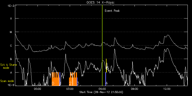EIS Observation timeline overlay to GOES-Xray curve Code 1" 2" 40" 266" EIS Observations list for this event: STUDY ACRONYM ID DATE OBSERVED DESCRIPTION NOAA# TARGET 0 HH_Flare+AR_180x152 | 30887 | 2012/11/29 01:19:10 | AR 11618 observation at limb | | Flare TIMELINE ID DATE OBSERVED FITS FILE XCEN (+W/-E) YCEN (+N/-S) DUR ----------------------------------------------------------------------------------------------------------------- 30887 | 2012/11/29 01:19:10.000 | eis_l0_20121129_011910.fits.gz | 921.82 | 105.10 | 5m17s 30887 | 2012/11/29 01:24:30.000 | eis_l0_20121129_012430.fits.gz | 921.82 | 105.02 | 5m18s 30887 | 2012/11/29 01:29:51.000 | eis_l0_20121129_012951.fits.gz | 921.74 | 105.10 | 5m18s 30887 | 2012/11/29 01:35:12.000 | eis_l0_20121129_013512.fits.gz | 921.89 | 105.02 | 5m18s 30887 | 2012/11/29 01:40:32.000 | eis_l0_20121129_014032.fits.gz | 921.82 | 105.10 | 5m18s 30887 | 2012/11/29 01:45:53.000 | eis_l0_20121129_014553.fits.gz | 921.89 | 105.02 | 5m18s 30887 | 2012/11/29 01:51:13.000 | eis_l0_20121129_015113.fits.gz | 921.82 | 105.10 | 5m18s 30887 | 2012/11/29 01:56:34.000 | eis_l0_20121129_015634.fits.gz | 921.82 | 104.94 | 5m18s 1 PRY_slot_contextLITE | 30888 | 2012/11/29 02:02:03 | AR 11618 observation at limb - context | | Active Region TIMELINE ID DATE OBSERVED FITS FILE XCEN (+W/-E) YCEN (+N/-S) DUR ----------------------------------------------------------------------------------------------------------------- 30888 | 2012/11/29 02:02:03.000 | eis_l0_20121129_020203.fits.gz | 908.75 | 105.10 | 2m56s 2 HH_Flare+AR_180x152 | 30889 | 2012/11/29 02:55:33 | AR 11618 observation at limb | | Flare TIMELINE ID DATE OBSERVED FITS FILE XCEN (+W/-E) YCEN (+N/-S) DUR ----------------------------------------------------------------------------------------------------------------- 30889 | 2012/11/29 02:55:33.000 | eis_l0_20121129_025533.fits.gz | 921.89 | 104.94 | 5m18s 30889 | 2012/11/29 03:00:54.000 | eis_l0_20121129_030054.fits.gz | 921.82 | 105.10 | 5m17s 30889 | 2012/11/29 03:06:14.000 | eis_l0_20121129_030614.fits.gz | 921.89 | 104.94 | 5m19s 30889 | 2012/11/29 03:11:36.000 | eis_l0_20121129_031136.fits.gz | 921.89 | 104.94 | 5m17s 30889 | 2012/11/29 03:16:56.000 | eis_l0_20121129_031656.fits.gz | 921.74 | 105.10 | 5m18s 30889 | 2012/11/29 03:22:17.000 | eis_l0_20121129_032217.fits.gz | 921.82 | 105.02 | 5m18s 30889 | 2012/11/29 03:27:38.000 | eis_l0_20121129_032738.fits.gz | 921.82 | 105.02 | 5m17s 30889 | 2012/11/29 03:32:58.000 | eis_l0_20121129_033258.fits.gz | 921.82 | 104.94 | 5m7s 3 PRY_slot_contextLITE | 30890 | 2012/11/29 03:38:26 | AR 11618 observation at limb - context | | Active Region TIMELINE ID DATE OBSERVED FITS FILE XCEN (+W/-E) YCEN (+N/-S) DUR ----------------------------------------------------------------------------------------------------------------- 30890 | 2012/11/29 03:38:26.000 | eis_l0_20121129_033826.fits.gz | 908.90 | 105.10 | 2m56s 4 PRY_slot_contextLITE | 30795 | 2012/11/29 06:17:40 | EIS/AIA alignment monitoring | 1621 | Active Region TIMELINE ID DATE OBSERVED FITS FILE XCEN (+W/-E) YCEN (+N/-S) DUR ----------------------------------------------------------------------------------------------------------------- 30795 | 2012/11/29 06:17:40.000 | eis_l0_20121129_061740.fits.gz | -15.29 | -0.65 | 2m56s 5 Alignment_266 | 30796 | 2012/11/29 06:20:55 | EIS/AIA alignment monitoring | 1621 | Quiet Sun TIMELINE ID DATE OBSERVED FITS FILE XCEN (+W/-E) YCEN (+N/-S) DUR ----------------------------------------------------------------------------------------------------------------- 30796 | 2012/11/29 06:20:55.000 | eis_l0_20121129_062055.fits.gz | -132.49 | -0.50 | 1m22s 6 XRT_synop_AIA | 30797 | 2012/11/29 06:23:29 | EIS/AIA alignment monitoring | 1621 | Quiet Sun TIMELINE ID DATE OBSERVED FITS FILE XCEN (+W/-E) YCEN (+N/-S) DUR ----------------------------------------------------------------------------------------------------------------- 30797 | 2012/11/29 06:23:29.000 | eis_l0_20121129_062329.fits.gz | -132.57 | -0.50 | 10s : Check study information : Download file : View thumbnails For this event, also check for: