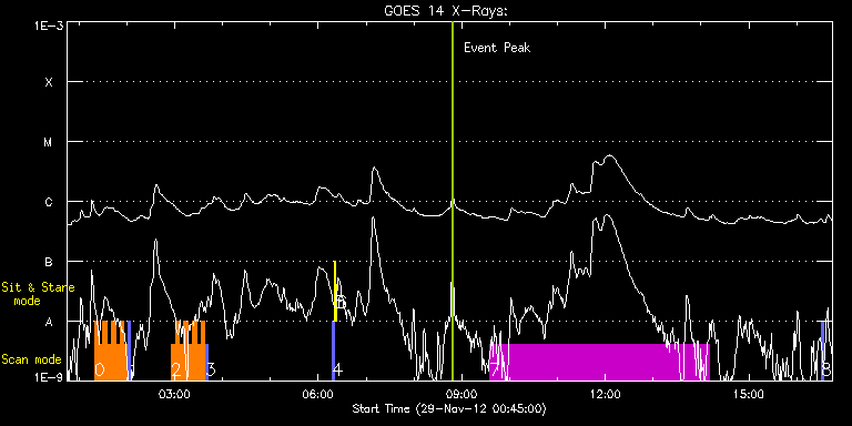 EIS Observation timeline overlay to GOES-Xray curve Code 1" 2" 40" 266" EIS Observations list for this event: STUDY ACRONYM ID DATE OBSERVED DESCRIPTION NOAA# TARGET 0 HH_Flare+AR_180x152 | 30887 | 2012/11/29 01:19:10 | AR 11618 observation at limb | | Flare TIMELINE ID DATE OBSERVED FITS FILE XCEN (+W/-E) YCEN (+N/-S) DUR ----------------------------------------------------------------------------------------------------------------- 30887 | 2012/11/29 01:19:10.000 | eis_l0_20121129_011910.fits.gz | 921.82 | 105.10 | 5m17s 30887 | 2012/11/29 01:24:30.000 | eis_l0_20121129_012430.fits.gz | 921.82 | 105.02 | 5m18s 30887 | 2012/11/29 01:29:51.000 | eis_l0_20121129_012951.fits.gz | 921.74 | 105.10 | 5m18s 30887 | 2012/11/29 01:35:12.000 | eis_l0_20121129_013512.fits.gz | 921.89 | 105.02 | 5m18s 30887 | 2012/11/29 01:40:32.000 | eis_l0_20121129_014032.fits.gz | 921.82 | 105.10 | 5m18s 30887 | 2012/11/29 01:45:53.000 | eis_l0_20121129_014553.fits.gz | 921.89 | 105.02 | 5m18s 30887 | 2012/11/29 01:51:13.000 | eis_l0_20121129_015113.fits.gz | 921.82 | 105.10 | 5m18s 30887 | 2012/11/29 01:56:34.000 | eis_l0_20121129_015634.fits.gz | 921.82 | 104.94 | 5m18s 1 PRY_slot_contextLITE | 30888 | 2012/11/29 02:02:03 | AR 11618 observation at limb - context | | Active Region TIMELINE ID DATE OBSERVED FITS FILE XCEN (+W/-E) YCEN (+N/-S) DUR ----------------------------------------------------------------------------------------------------------------- 30888 | 2012/11/29 02:02:03.000 | eis_l0_20121129_020203.fits.gz | 908.75 | 105.10 | 2m56s 2 HH_Flare+AR_180x152 | 30889 | 2012/11/29 02:55:33 | AR 11618 observation at limb | | Flare TIMELINE ID DATE OBSERVED FITS FILE XCEN (+W/-E) YCEN (+N/-S) DUR ----------------------------------------------------------------------------------------------------------------- 30889 | 2012/11/29 02:55:33.000 | eis_l0_20121129_025533.fits.gz | 921.89 | 104.94 | 5m18s 30889 | 2012/11/29 03:00:54.000 | eis_l0_20121129_030054.fits.gz | 921.82 | 105.10 | 5m17s 30889 | 2012/11/29 03:06:14.000 | eis_l0_20121129_030614.fits.gz | 921.89 | 104.94 | 5m19s 30889 | 2012/11/29 03:11:36.000 | eis_l0_20121129_031136.fits.gz | 921.89 | 104.94 | 5m17s 30889 | 2012/11/29 03:16:56.000 | eis_l0_20121129_031656.fits.gz | 921.74 | 105.10 | 5m18s 30889 | 2012/11/29 03:22:17.000 | eis_l0_20121129_032217.fits.gz | 921.82 | 105.02 | 5m18s 30889 | 2012/11/29 03:27:38.000 | eis_l0_20121129_032738.fits.gz | 921.82 | 105.02 | 5m17s 30889 | 2012/11/29 03:32:58.000 | eis_l0_20121129_033258.fits.gz | 921.82 | 104.94 | 5m7s 3 PRY_slot_contextLITE | 30890 | 2012/11/29 03:38:26 | AR 11618 observation at limb - context | | Active Region TIMELINE ID DATE OBSERVED FITS FILE XCEN (+W/-E) YCEN (+N/-S) DUR ----------------------------------------------------------------------------------------------------------------- 30890 | 2012/11/29 03:38:26.000 | eis_l0_20121129_033826.fits.gz | 908.90 | 105.10 | 2m56s 4 PRY_slot_contextLITE | 30795 | 2012/11/29 06:17:40 | EIS/AIA alignment monitoring | 1621 | Active Region TIMELINE ID DATE OBSERVED FITS FILE XCEN (+W/-E) YCEN (+N/-S) DUR ----------------------------------------------------------------------------------------------------------------- 30795 | 2012/11/29 06:17:40.000 | eis_l0_20121129_061740.fits.gz | -15.29 | -0.65 | 2m56s 5 Alignment_266 | 30796 | 2012/11/29 06:20:55 | EIS/AIA alignment monitoring | 1621 | Quiet Sun TIMELINE ID DATE OBSERVED FITS FILE XCEN (+W/-E) YCEN (+N/-S) DUR ----------------------------------------------------------------------------------------------------------------- 30796 | 2012/11/29 06:20:55.000 | eis_l0_20121129_062055.fits.gz | -132.49 | -0.50 | 1m22s 6 XRT_synop_AIA | 30797 | 2012/11/29 06:23:29 | EIS/AIA alignment monitoring | 1621 | Quiet Sun TIMELINE ID DATE OBSERVED FITS FILE XCEN (+W/-E) YCEN (+N/-S) DUR ----------------------------------------------------------------------------------------------------------------- 30797 | 2012/11/29 06:23:29.000 | eis_l0_20121129_062329.fits.gz | -132.57 | -0.50 | 10s 7 SK_CH_DIAG_320x384 | 30891 | 2012/11/29 09:35:34 | HOP 81 polar monitoring (south pole) | | Coronal Hole TIMELINE ID DATE OBSERVED FITS FILE XCEN (+W/-E) YCEN (+N/-S) DUR ----------------------------------------------------------------------------------------------------------------- 30891 | 2012/11/29 09:35:34.000 | eis_l0_20121129_093534.fits.gz | 519.44 | -298.29 | 4h35m37s 8 PRY_slot_context_v3 | 30914 | 2012/11/29 16:30:34 | | 1620 | Active Region TIMELINE ID DATE OBSERVED FITS FILE XCEN (+W/-E) YCEN (+N/-S) DUR ----------------------------------------------------------------------------------------------------------------- 30914 | 2012/11/29 16:30:34.000 | eis_l0_20121129_163034.fits.gz | 824.93 | -253.33 | 2m56s : Check study information : Download file : View thumbnails For this event, also check for:
