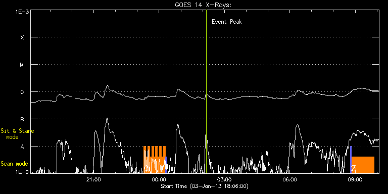EIS Observation timeline overlay to GOES-Xray curve Code 1" 2" 40" 266" EIS Observations list for this event: STUDY ACRONYM ID DATE OBSERVED DESCRIPTION NOAA# TARGET 0 HH_Flare+AR_180x152 | 31426 | 2013/01/03 23:18:10 | AR Flare Obs | 1645 | Flare TIMELINE ID DATE OBSERVED FITS FILE XCEN (+W/-E) YCEN (+N/-S) DUR ----------------------------------------------------------------------------------------------------------------- 31426 | 2013/01/03 23:18:10.000 | eis_l0_20130103_231810.fits.gz | 23.81 | -208.06 | 5m18s 31426 | 2013/01/03 23:23:31.000 | eis_l0_20130103_232331.fits.gz | 24.58 | -208.14 | 5m19s 31426 | 2013/01/03 23:28:53.000 | eis_l0_20130103_232853.fits.gz | 25.36 | -208.14 | 5m17s 31426 | 2013/01/03 23:34:13.000 | eis_l0_20130103_233413.fits.gz | 26.13 | -208.14 | 5m19s 31426 | 2013/01/03 23:39:34.000 | eis_l0_20130103_233934.fits.gz | 26.98 | -208.14 | 5m19s 31426 | 2013/01/03 23:44:56.000 | eis_l0_20130103_234456.fits.gz | 27.75 | -208.06 | 5m18s 31426 | 2013/01/03 23:50:17.000 | eis_l0_20130103_235017.fits.gz | 28.60 | -208.06 | 5m17s 31426 | 2013/01/03 23:55:37.000 | eis_l0_20130103_235537.fits.gz | 29.45 | -208.14 | 5m18s 31426 | 2013/01/04 00:00:58.000 | eis_l0_20130104_000058.fits.gz | 30.22 | -208.06 | 5m18s 31426 | 2013/01/04 00:06:19.000 | eis_l0_20130104_000619.fits.gz | 31.15 | -207.99 | 5m17s 31426 | 2013/01/04 00:11:39.000 | eis_l0_20130104_001139.fits.gz | 31.85 | -208.06 | 5m19s 1 PRY_slot_contextLITE | 31427 | 2013/01/04 00:17:08 | AR Flare Obs | 1645 | Active Region TIMELINE ID DATE OBSERVED FITS FILE XCEN (+W/-E) YCEN (+N/-S) DUR ----------------------------------------------------------------------------------------------------------------- 31427 | 2013/01/04 00:17:08.000 | eis_l0_20130104_001708.fits.gz | 19.63 | -207.99 | 2m57s 2 PRY_slot_context_v3 | 31420 | 2013/01/04 08:47:10 | syo100504-01 : EIS Spectral Atlas Syno | 1645 | Active Region TIMELINE ID DATE OBSERVED FITS FILE XCEN (+W/-E) YCEN (+N/-S) DUR ----------------------------------------------------------------------------------------------------------------- 31420 | 2013/01/04 08:47:10.000 | eis_l0_20130104_084710.fits.gz | 96.41 | -207.52 | 2m57s 3 Atlas_60 | 31421 | 2013/01/04 08:50:32 | syo100504-01 : EIS Spectral Atlas Syno | 1645 | Quiet Sun TIMELINE ID DATE OBSERVED FITS FILE XCEN (+W/-E) YCEN (+N/-S) DUR ----------------------------------------------------------------------------------------------------------------- 31421 | 2013/01/04 08:50:32.000 | eis_l0_20130104_085032.fits.gz | 111.61 | -207.68 | 1h1m39s : Check study information : Download file : View thumbnails For this event, also check for:
